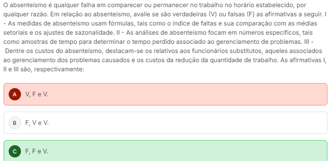 O absenteismo é qualquer falha em comparecer ou permanecer no trabalho no estabelecido, por qualquer razão. Em relação ao absenteismo, avalie se são verdadeiras (V) ou falsas (F) as afirmativas a seguir. I As medidas de absenteismo usam formulas, tais como indice de faltas e sua comparação com as setoriais e ajustes de sazonalidade. As de absenteismo focam em números tais como amostras de tempo para determinar tempo perdido associado ao gerenciamento de problemas. III Dentre os custos do absenteismo, destacam-se os relativos aos substitutos, aqueles associados ao gerenciamento dos problemas causados e os custos da redução da quantidade de trabalho. As afirmativas I, II e III são, respectivamente: A B C