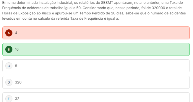 Em uma determinada instalação industrial, do SESMT apontaram, no ano anterior, uma Taxa de Frequência de acidentes de trabalho igual a 50. Considerando que, nesse periodo, foi de 320000 total de Horas de Exposição ao Risco e apurou-se um Tempo Perdido de 20 dias, sabe-se que 0 de acidentes levados em conta no da referida Taxa de é igual a: A 4 B 16 C 8 D 320 E 32