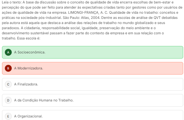 Leia O texto: A base da discussão sobre conceito de qualidade de vida encerra escolhas de bem-estar e percepção do que pode ser feito para atender às expectativas criadas tanto por gestores como por usuários de ações de qualidade de vida na empresa. LIMONGI-FRANÇA, A. C. Qualidade de vida no trabalho: conceitos e práticas na sociedade Sao Paulo: Atlas, 2004. Dentre as escolas de analise de QVT debatidas pela autora aquela que destaca a das relações de trabalho no mundo globalizado e seus paradoxos. A cidadania, responsabilidade social, igualdade, preservação do meio ambiente e 0 desenvolvimento passam a fazer parte do contexto da empresa e em sua relação com trabalho. Essa escola A A B A Modernizadora. C A Finalizadora. D A da Condição Humana no Trabalho. E A Organizacional.