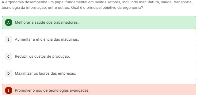 A ergonomia desempenha um papel fundamental em muitos setores, incluindo manufatura, saúde, transporte, tecnologia da informação, entre outros. Qual é 0 principal objetivo da ergonomia? A Melhorar a saúde dos trabalhadores. B Aumentar a eficiencia das C Reduzir os custos de produção. D Maximizar os lucros das empresas. E Promover uso de tecnologias avançadas.