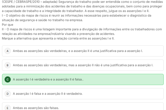 (CESPE / CEBRASPE/2010 adaptada) Segurança do trabalho pode ser entendida como 0 conjunto de medidas adotadas para a minimização dos acidentes de trabalho e das doenças ocupacionais, bem como para proteger a capacidade de trabalho e a integridade do trabalhador. A esse respeito, julgue as asserções I e II. I objetivo do mapa de riscos é reunir as informações para estabelecer da situação de segurança e no trabalho na empresa. Por que II O mapa de riscos é uma listagem importante para a divulgação de informações entre trabalhadores com relação as atividades na visando a prevenção de acidentes. Marque a alternativa que apresenta a relação correta entre as asserções I e II. A Ambas as asserções são verdadeiras, e a asserção II é uma justificativa para a asserção I. B Ambas as asserções são verdadeiras, mas a asserção II não é uma justificativa para a asserção I. C A asserção é verdadeira e a asserção II é falsa.. D A asserção I é falsa e a asserção II é verdadeira. E Ambas as asserções são falsas.
