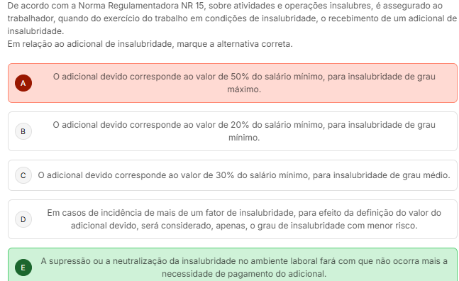 De acordo com a Norma Regulamentadora NR 15, sobre atividades e operações insalubres, é assegurado ao trabalhador, quando do do trabalho em condições de insalubridade, recebimento de um adicional de insalubridade. Em relação ao adicional de insalubridade, marque a alternativa correta. O adicional devido corresponde ao valor de 50% do para insalubridade de grau A O adicional devido corresponde ao valor de 20% do para insalubridade de grau B C O adicional devido corresponde ao valor de 30% do minimo, para insalubridade de grau Em casos de incidencia de mais de um fator de insalubridade, para efeito da definição do valor do D adicional devido, considerado, apenas, grau de insalubridade com menor risco. A supressão ou a neutralização da insalubridade no ambiente laboral fará com que não ocorra mais a E necessidade de pagamento do adicional.