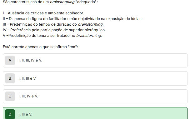 de um brainstorming "adequado": I - Ausência de criticas e ambiente acolhedor. II - Dispensa da figura do facilitador e não objetividade na exposição de ideias. III - Predefinição do tempo de duração do brainstorming. IV - Preferência pela participação de superior V -Predefinição do tema a ser tratado no brainstorming. correto apenas que se afirma "em": A I, II, III, IV e V. B I, II, III e V. C I, III, IV e V. D