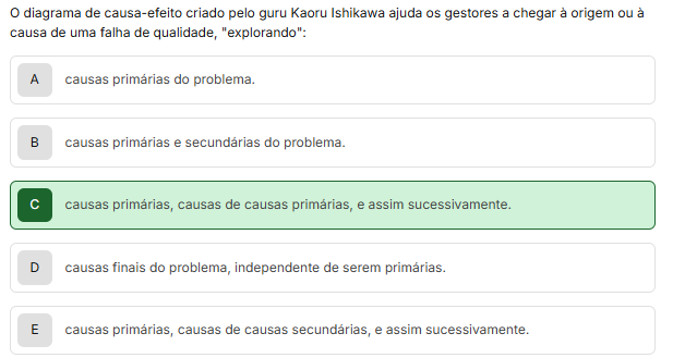 0 diagrama de causa-efeito criado pelo guru Kaoru Ishikawa ajuda gestores a chegar à origem ou à causa de uma falha de qualidade, "explorando": A causas do problema. B causas primárias e secundárias do problema. C causas primárias, causas de causas primárias, e assim sucessivamente. D causas finais do problema, independente de serem primárias. E causas primárias, causas de causas secundárias, e assim sucessivamente.