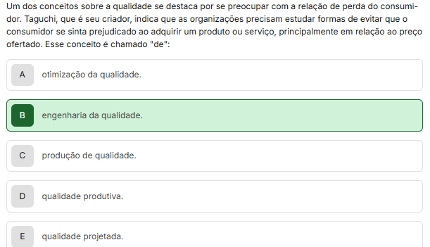 Um dos conceitos sobre a qualidade se destaca por se preocupar com a relação de perda do consumi- dor. Taguchi, que é seu criador, indica que as organizações precisam estudar formas de evitar que 0 consumidor se sinta prejudicado ao adquirir um produto ou serviço, principalmente em relação ao preço ofertado. Esse conceito é chamado "de": A otimização da qualidade. engenharia da qualidade. C produção de qualidade. D qualidade produtiva. E qualidade projetada.