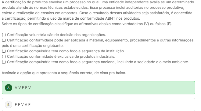 A certificação de produtos envolve um processo no qual uma entidade independente avalia se um determinado produto atende às normas estabelecidas. Esse processo inclui auditorias no processo produtivo, coleta e realização de ensaios em amostras. Caso 0 resultado dessas atividades seja é concedida a certificação, permitindo uso da marca de conformidade ABNT nos produtos. Sobre os tipos de certificação classifique as afirmativas abaixo como verdadeiras (V) ou falsas (F): (_) Certificação voluntaria são de decisão das organizações. (_) Certificação conformidade pode ser aplicada a material, equipamento, procedimentos e outras informações, pois é uma certificação englobante. (_) Certificação compulsória tem como foco a segurança da instituição. (_) Certificação conformidade é exclusiva de produtos industriais. (_) Certificação compulsória tem como foco a segurança nacional, incluindo a sociedade e meio ambiente. Assinale a opção que apresenta a correta, de cima pra baixo. A VVFFV B FFVVF