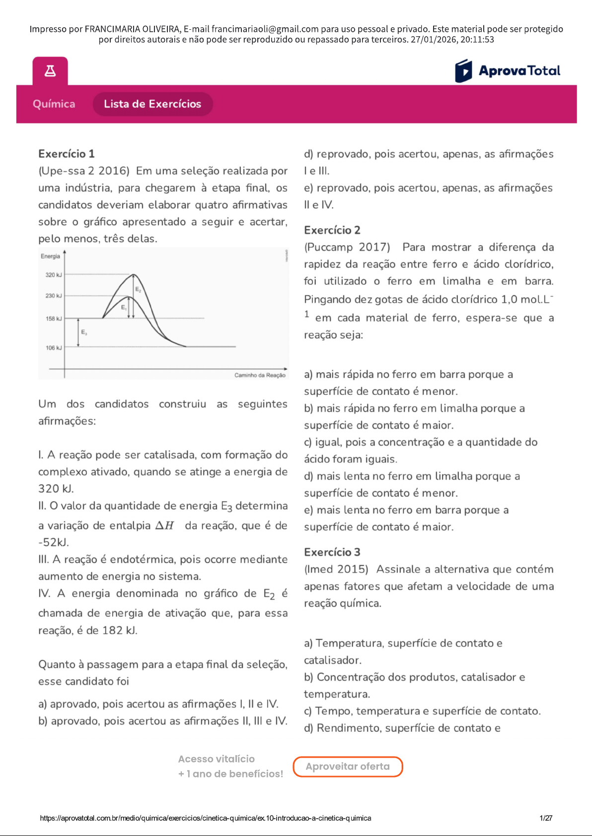 Impresso por FRANCIMARIA OLIVEIRA, E-mail francimariaoli@gmail.com para uso pessoal e privado. Este material pode ser protegido por direitos autorais e não pode ser reproduzido ou repassado para terceiros. 27/01/2026, 20:11:53 Д Aprova Total Química Lista de Exercícios Exercício 1 d) reprovado, pois acertou, apenas, as afirmações (Upe-ssa 2 2016) Em uma seleção realizada por le III. uma indústria, para chegarem à etapa final, os e) reprovado, pois acertou, apenas, as afirmações candidatos deveriam elaborar quatro afirmativas e IV. sobre o gráfico apresentado a seguir e acertar, Exercício 2 pelo menos, três delas. (Puccamp 2017) Para mostrar a diferença da Energia rapidez da reação entre ferro e ácido clorídrico, foi utilizado ferro em limalha e em barra. Pingando dez gotas de ácido clorídrico 1,0 mol.L⁻ E, 1 em cada material de ferro, espera-se que a reação seja: Caminho da Reação a) mais rápida no ferro em barra porque a superfície de contato é menor. Um dos candidatos construiu as seguintes b) mais rápida no ferro em limalha porque a afirmações: superfície de contato é maior. c) igual, pois a concentração e a quantidade do I. A reação pode ser catalisada, com formação do ácido foram iguais. complexo ativado, quando se atinge a energia de d) mais lenta no ferro em limalha porque a 320 kJ. superfície de contato é menor. II. O valor da quantidade de energia determina e) mais lenta no ferro em barra porque a a variação de entalpia da reação, que é de superfície de contato é maior. -52kJ. Exercício 3 III. A reação é endotérmica, pois ocorre mediante (Imed 2015) Assinale a alternativa que contém aumento de energia no sistema. apenas fatores que afetam a velocidade de uma IV. A energia denominada no gráfico de E₂ é reação química. chamada de energia de ativação que, para essa reação, é de 182 kJ. a) Temperatura, superfície de contato e Quanto à passagem para a etapa final da seleção, catalisador. esse candidato foi b) Concentração dos produtos, catalisador e temperatura. a) aprovado, pois acertou as afirmações I, e IV. c) Tempo, temperatura e superfície de contato. b) aprovado, pois acertou as afirmações II, III e IV. d) Rendimento, superfície de contato e Acesso vitalício Aproveitar oferta +1 ano de benefícios! 1/27Impresso por FRANCIMARIA OLIVEIRA, E-mail francimariaoli@gmail.com para uso pessoal e privado. Este material pode ser protegido por direitos autorais e não pode ser reproduzido ou repassado para terceiros. 27/01/2026, 20:11:53 Exercício 4 (Uece 2016) Alguns medicamentos são a) I, e IV. apresentados na forma de comprimidos que, b) I, III e IV. quando ingeridos, dissolvem-se lentamente no c) I e III. líquido presente no tubo digestório, garantindo d) e III. um efeito prolongado no organismo. Contudo, algumas pessoas, por conta própria, amassam o Exercício 6 comprimido antes de tomá-lo. Esse (Udesc 2016) Cinética química é a parte da procedimento é inconveniente, pois reduz o Química que estuda a velocidade das reações, a efeito prolongado devido: influência das concentrações de produtos e os reagentes na velocidade, assim como a influência de outros fatores, como temperatura, presença de catalisador, inibidor, etc. Em termodinâmica a) à diminuição da superfície de contato do estuda-se o equilíbrio entre espécies químicas comprimido, provocando redução na velocidade em uma reação, assim como fatores que da reação. influenciam o deslocamento desse equilíbrio, b) à diminuição da superfície de contato, que podem ser variados de forma a maximizar ou favorecendo a dissolução. minimizar a obtenção de um determinado c) ao aumento da velocidade da reação em composto. consequência do aumento da superfície de contato do comprimido. d) diminuição da frequência de colisões das Sobre essas duas importantes áreas da Química, partículas do comprimido com as moléculas do analise as proposições. líquido presente no tubo digestório. Exercício 5 I. A influência da concentração dos reagentes (Acafe 2016) Baseado nos conceitos sobre sobre a velocidade de uma reação é dada pela cinética das reações químicas, analise as sua lei de velocidade, que é uma expressão afirmações a seguir. matemática que sempre envolve a concentração de todos os reagentes, cada um elevado ao seu coeficiente estequiométrico. I. Catálise heterogênea pode ser caracterizada quando existe uma superfície de contato visível II. A posição de um dado equilíbrio químico entre os reagentes e catalisador. lado para qual ele se encontra majoritariamente deslocado pode ser deduzida II. A energia de ativação varia com a a partir da lei de velocidade para qualquer concentração dos reagentes. equilíbrio químico. III. A constante de velocidade (k) pode variar com III. Reações lentas são reações necessariamente a temperatura. deslocadas para os reagentes. Já reações rápidas se processam com consumo total dos reagentes Acesso vitalício Aproveitar oferta + 1 ano de benefícios! odas as corretas estao em: 2/27Impresso por FRANCIMARIA OLIVEIRA, E-mail para uso pessoal e privado. Este material pode ser protegido por direitos autorais e não pode ser reproduzido ou repassado para terceiros. 27/01/2026, 20:11:53 aumentar a velocidade de uma reação, mas o variação na concentração de A em função do efeito desse aumento sobre o deslocamento do tempo: equilíbrio depende, primordialmente, da variação de entalpia para a reação na faixa de temperatura 0,240 0,200 0,180 0,162 0,153 avaliada. Tempo(s) 0 180 300 540 840 V. Tempo de meia vida é o tempo necessário A velocidade média (Vₘ) da reação no intervalo para que a concentração de um reagente caia a de 180 a 300 segundos é: metade de seu valor inicial, correspondendo ao tempo de equilíbrio da reação, que é definido a)1,66 X como o tempo necessário para que metade dos b)3,32 X produtos se transforme e