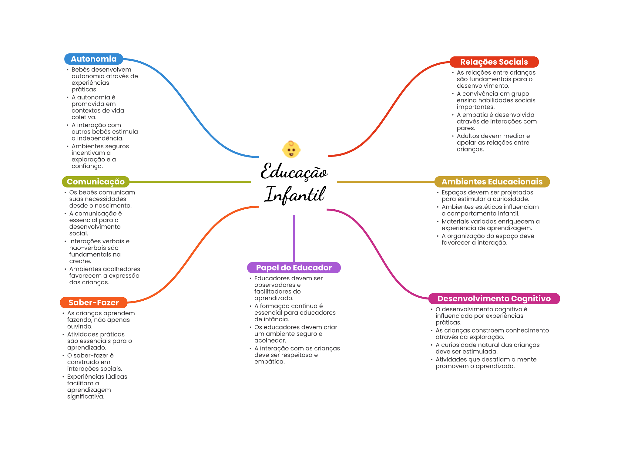 Autonomia Relações Sociais Bebés desenvolvem autonomia através de As relações entre crianças são fundamentais para experiências desenvolvimento. práticas. A autonomia é A convivência em grupo ensina habilidades sociais promovida em contextos de vida importantes. coletiva. A empatia é desenvolvida através de interações com A interação com outros bebés estimula pares. a independência. Adultos devem mediar e Ambientes seguros apoiar as relações entre incentivam a crianças. exploração e a confiança. Educação Comunicação Ambientes Educacionais Os bebés comunicam Infantil Espaços devem ser projetados suas necessidades para estimular a curiosidade. desde nascimento. Ambientes estéticos influenciam A comunicação é comportamento infantil. essencial para Materiais variados enriquecem a desenvolvimento experiência de aprendizagem. social. A organização do espaço deve Interações verbais e favorecer a interação. não-verbais são fundamentais na creche. Ambientes acolhedores Papel do Educador favorecem a expressão Educadores devem ser das crianças. observadores e facilitadores do aprendizado. Saber-Fazer Desenvolvimento Cognitivo A formação contínua é As crianças aprendem essencial para educadores O desenvolvimento cognitivo é fazendo, não apenas de infância. influenciado por experiências práticas. ouvindo. Os educadores devem criar um ambiente seguro e As crianças constroem conhecimento Atividades práticas acolhedor. através da exploração. são essenciais para aprendizado. A interação com as crianças A curiosidade natural das crianças deve ser estimulada. saber-fazer é deve ser respeitosa e construído em empática. Atividades que desafiam a mente interações sociais. promovem aprendizado. Experiências lúdicas facilitam a aprendizagem significativa.