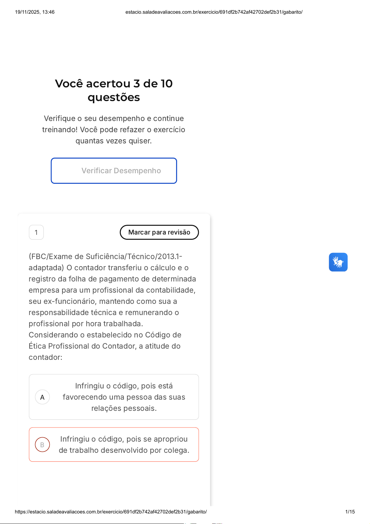 Você acertou 3 de 10 questões Verifique o seu desempenho e continue treinando! Você pode refazer o exercício quantas vezes quiser. Verificar Desempenho A B 1 Marcar para revisão (FBC/Exame de Suficiência/Técnico/2013.1- adaptada) O contador transferiu o cálculo e o registro da folha de pagamento de determinada empresa para um profissional da contabilidade, seu ex-funcionário, mantendo como sua a responsabilidade técnica e remunerando o profissional por hora trabalhada. Considerando o estabelecido no Código de Ética Profissional do Contador, a atitude do contador: Infringiu o código, pois está favorecendo uma pessoa das suas relações pessoais. Infringiu o código, pois se apropriou de trabalho desenvolvido por colega. 19/11/2025, 13:46 estacio.saladeavaliacoes.com.br/exercicio/691df2b742af42702def2b31/gabarito/ https://estacio.saladeavaliacoes.com.br/exercicio/691df2b742af42702def2b31/gabarito/ 1/15 C D E Não infringiu o código, mas agiu contra a classe contábil em não possibilitar a livre concorrência. Não infringiu o código, pois o profissional da contabilidade poderá transferir parcialmente a execução dos serviços a seu cargo a outro profissional, mantendo sempre como sua a responsabilidade técnica. Infringiu o código, pois em nenhuma hipótese poderá haver a transferência. Resposta incorreta Opa! A alternativa correta é a letra D. Confira o gabarito comentado! Gabarito Comentado De acordo com o Código de Ética Profissional do Contador, o profissional da contabilidade tem a possibilidade de transferir parcialmente a execução dos serviços a seu cargo para outro profissional, desde que mantenha a responsabilidade técnica. Nesse caso, o contador não infringiu o código, pois transferiu o cálculo e o registro da folha de pagamento para um ex-funcionário, mas manteve a responsabilidade técnica, além de remunerar o profissional por hora trabalhada. 2 Marcar para revisão 19/11/2025, 13:46 estacio.saladeavaliacoes.com.br/exercicio/691df2b742af42702def2b31/gabarito/ https://estacio.saladeavaliacoes.com.br/exercicio/691df2b742af42702def2b31/gabarito/ 2/15 A B C O profissional da contabilidade deve identificar ameaças ao cumprimento dos princípios fundamentais. A ameaça de interesse próprio, corresponde: À ameaça de que o profissional da contabilidade será dissuadido de agir de forma objetiva devido a pressões reais ou aparentes, incluindo tentativas de exercer influência indevida sobre o profissional da contabilidade. À ameaça de que, devido ao relacionamento longo ou próximo com o cliente ou a organização empregadora, o profissional da contabilidade torne-se solidário aos interesses deles ou aceitar seu trabalho sem muito questionamento. À ameaça de que o profissional da contabilidade não avaliará adequadamente os resultados de julgamento feito anteriormente ou de atividade desenvolvida pelo profissional da contabilidade ou por outra pessoa da firma ou organização empregadora do profissional da contabilidade nos quais o profissional da contabilidade confiará para formar um julgamento como parte do desenvolvimento da atividade atual. 19/11/2025, 13:46 estacio.saladeavaliacoes.com.br/exercicio/691df2b742af42702def2b31/gabarito/ https://estacio.saladeavaliacoes.com.br/exercicio/691df2b742af42702def2b31/gabarito/ 3/15 D E À ameaça de que interesse financeiro ou outro interesse influenciará, de forma inadequada, o julgamento ou o comportamento do profissional da contabilidade À ameaça de que o profissional da contabilidade promoverá ou defenderá uma posição de cliente ou da organização empregadora a ponto em que sua objetividade fique comprometida. Resposta incorreta Opa! A alternativa correta é a letra D. Confira o gabarito comentado! Gabarito Comentado A resposta certa é: À ameaça de que interesse financeiro ou outro interesse influenciará, de forma inadequada, o julgamento ou o comportamento do profissional da contabilidade A ameaça de interesse próprio é uma ameaça que pode comprometer a objetividade do profissional da contabilidade. Essa ameaça pode ocorrer quando o profissional da contabilidade tem um interesse financeiro ou outro interesse em uma determinada situação, o que pode influenciar seu julgamento ou comportamento. 3 Marcar para revisão 19/11/2025, 13:46 estacio.saladeavaliacoes.com.br/exercicio/691df2b742af42702def2b31/gabarito/ https://estacio.saladeavaliacoes.com.br/exercicio/691df2b742af42702def2b31/gabarito/ 4/15 A B C D E (FBC/Exame de Suficiência/Técnico/2013.2- adaptada) Com relação à aplicação das sanções éticas, julgue as sanções descritas nos itens abaixo e, em seguida, assinale a opção CORRETA. I. Ação cometida que resulte em ato que denigra publicamente a imagem do Profissional da Contabilidade. II. Ausência de punição ética anterior. III. Punição ética anterior transitada em julgado. São consideradas como agravantes, de acordo com o Código de Ética Profissional do Contador, aquelas apresentadas nos itens: I e II, apenas. I e III, apenas. I, II e III. II e III, apenas. II apenas. Resposta incorreta Opa! A alternativa correta é a letra B. Confira o gabarito comentado! Gabarito Comentado As alternativas I e III são consideradas agravantes de acordo com o Código de Ética Profissional do Contador. A alternativa I se refere a uma ação que prejudica a imagem do profissional de contabilidade, enquanto a alternativa III se refere a uma punição ética anterior que já 19/11/2025, 13:46 estacio.saladeavaliacoes.com.br/exercicio/691df2b742af42702def2b31/gabarito/ https://estacio.saladeavaliacoes.com.br/exercicio/691df2b742af42702def2b31/gabarito/ 5/15 transitou em julgado. Ambas as situações podem agravar a aplicação de sanções éticas. Por outro lado, a alternativa II, que se refere à ausência de punição ética anterior, não é considerada um agravante, pois a ausência de punições anteriores não intensifica a aplicação de uma sanção ética. 