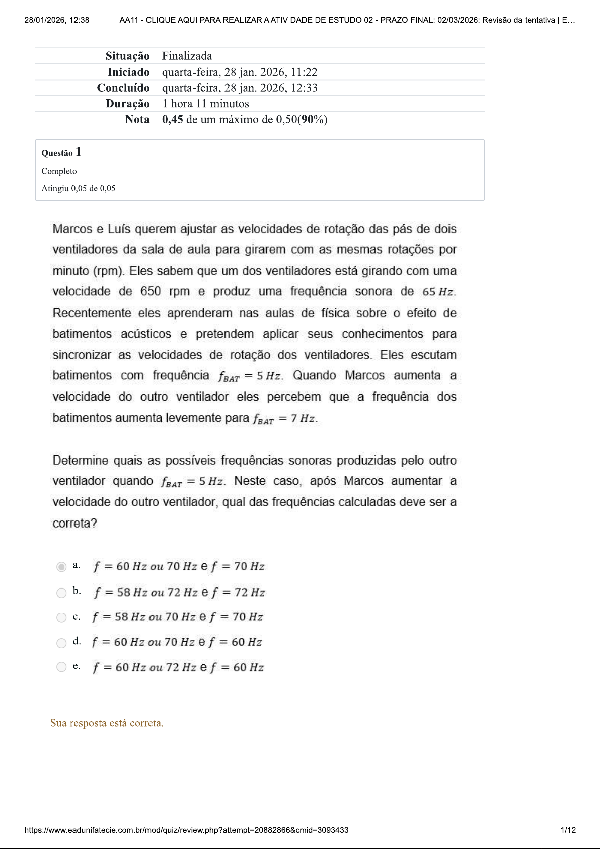 28/01/2026, 12:38 AA11 CLIQUE AQUI PARA REALIZAR AATIVIDADE DE ESTUDO 02 PRAZO FINAL: 02/03/2026: Revisão da tentativa E... Situação Finalizada Iniciado quarta-feira, 28 jan. 2026, 11:22 Concluído quarta-feira, 28 jan. 2026, 12:33 Duração 1 hora 11 minutos Nota 0,45 de um máximo de 0,50(90%) Questão 1 Completo Atingiu 0,05 de 0,05 Marcos e Luís querem ajustar as velocidades de rotação das pás de dois ventiladores da sala de aula para girarem com as mesmas rotações por minuto (rpm). Eles sabem que um dos ventiladores está girando com uma velocidade de 650 rpm e produz uma frequência sonora de 65 Hz. Recentemente eles aprenderam nas aulas de física sobre efeito de batimentos acústicos e pretendem aplicar seus conhecimentos para sincronizar as velocidades de rotação dos ventiladores. Eles escutam batimentos com frequência = 5 Hz. Quando Marcos aumenta a velocidade do outro ventilador eles percebem que a frequência dos batimentos aumenta levemente para = 7 Hz. Determine quais as possíveis frequências sonoras produzidas pelo outro ventilador quando = 5 Hz. Neste caso, após Marcos aumentar a velocidade do outro ventilador, qual das frequências calculadas deve ser a correta? a. f = 60 Hz ou 70 Hz e f 70 Hz b. f = 58 Hz ou 72 Hz e f = 72 Hz f = 58 Hz ou 70 Hz e f = 70 Hz d. f = 60 Hz ou 70 Hz e f 60 Hz e. f = 60 Hz ou 72 Hz e f 60 Hz Sua resposta está correta. 1/1228/01/2026, 12:38 AA11 CLIQUE AQUI PARA REALIZAR AATIVIDADE DE ESTUDO 02 PRAZO FINAL: 02/03/2026: Revisão da tentativa E... Questão 2 Completo Atingiu 0,05 de 0,05 Dois músicos tentam tocar a nota Mi = E4 em seus violões, cuja comprimento de onda é 1,04 m. Um dos violões está levemente desafinado e acaba emitindo uma nota com frequência ≈ Eles logo percebem que um dos instrumentos precisa ser afinado antes de começar a apresentação num festival de música, com várias bandas e outros artistas que também vão cantar e tocar outros instrumentos. Por não possuírem nenhum aparelho para auxiliar no processo de afinação e sabendo que um dos violões está afinado, eles acabam recorrendo à percepção apurada de seus próprios ouvidos usando 0 efeito de batimentos acústicos. Determine a frequência dos batimentos acústicos que os músicos percebem ao tocar as duas notas ao mesmo tempo. Considere a velocidade do som = 344 m/s. a. = 6,1 Hz b. d. e. Sua resposta está correta. 2/1228/01/2026, 12:38 AA11 CLIQUE AQUI PARA REALIZAR AATIVIDADE DE ESTUDO 02 PRAZO FINAL: 02/03/2026: Revisão da tentativa E... Questão 3 Completo Atingiu 0,05 de 0,05 Dois alto-falantes A e estão alinhados horizontalmente e separados entre si por uma distância m (conforme mostra a figura abaixo). Os alto-falantes são alimentados pelo mesmo amplificador de som, de modo que, as ondas sonoras emitidas por eles estão em fase. Um ouvinte situado a uma distância d do alto-falante B está com um controle remoto e quer ajustar a frequência sonora de modo que 0 som fique mais intenso e ele possa escutar melhor nessa posição. Considerando a velocidade do som no ar igual v = 344 m/s. Determine 0 valor para três frequências sonoras entre 100 Hz e 650 Hz de modo que som emitido pelos alto-falantes fique mais intenso na posição do ouvinte. A Ouvinte D=2m d a. b. d. e. Sua resposta está correta. 3/1228/01/2026, 12:38 AA11 CLIQUE AQUI PARA REALIZAR AATIVIDADE DE ESTUDO 02 PRAZO FINAL: 02/03/2026: Revisão da tentativa E... Questão 4 Completo Atingiu 0,05 de 0,05 Durante uma feira de aviação num aeroporto militar próximo da sua cidade, você deseja fotografar os aviões que estão em exposição no solo, além de aviões de combate que estão realizando manobras no ar com velocidades ultrassônicas. Para isso você se programou com certa antecedência para comprar na internet por um preço que encaixava em seu orçamento uma câmera capaz de fotografar em altíssima velocidade. Você consegue realizar várias capturas no instante em que os aviões de combate atingem velocidades ultrassônicas na altura em que a velocidade do som é = 338 m/s. Ao retornar para casa você transfere as imagens da câmera para um programa de computador. Durante a visualização das fotos você nota que uma das imagens apresenta 0 cone de Mach bem definido para um dos aviões devido à onda de choque ter condensado a umidade do ar naquela altura de Você consegue traçar retas tangentes ao cone de Mach e à trajetória reta de do avião formando um ângulo de Determine 0 número de Mach M e a velocidade aproximada do avião. a. b. M = e 544 d. e. M e Sua resposta está correta. 4/1228/01/2026, 12:38 AA11 CLIQUE AQUI PARA REALIZAR AATIVIDADE DE ESTUDO 02 PRAZO FINAL: 02/03/2026: Revisão da tentativa E... Questão 5 Completo Atingiu 0,05 de 0,05 Um detector fetal é um aparelho que usa 0 efeito Doppler para monitorar batimentos do coração de um bebê no interior do útero. 0 aparelho produz ondas sonoras ultrassônicas com uma frequência f = 2 MHz conforme a figura abaixo (em escala exagerada apenas para ilustração). As ondas sonoras se propagam no interior da barriga da mãe, onde 0 meio de propagação é praticamente água, chegando até feto. Algumas ondas são refletidas de volta para um receptor no aparelho. 0 movimento do sangue no coração do feto provoca alterações f na frequência original gerada pelo aparelho. Essas variações da são captadas pelo detector e reproduzidas como batimentos do coração do bebê. A velocidade do sangue pode ser obtida em termos da variação da frequência original e do cosseno do ângulo entre feixe de ondas ultrassônicas e 0 vetor velocidade de deslocamento da gota de sangue no interior de determinada artéria, por exemplo, a artéria aorta, conforme a equação a seguir: Vsangue = Sonda Doppler Gel Pele Feixe ultrassônico e Artéria aorta Velocidade Gota de + do sangue sangue Considerando a velocidade do som na água v = 1482 m/s. ( ) Determine o comprimento de onda em milímetros (mm) do s