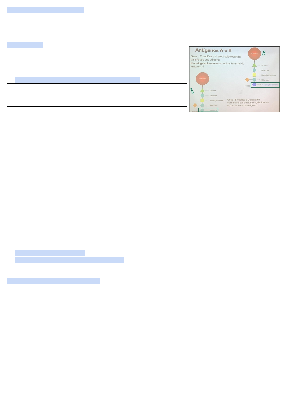 REAÇÕES DE AGLUTINAÇÃO: aglutinação: interação antígeno-anticorpo > formação de complexo insolúvel e passível de ser visualizado quando em grande quantidade > quando um anticorpo se liga a um antígeno, ele pode causar aglutinação das células que possuem esse antígeno SISTEMA ABO H-fucosiltransferase: coloca fucose no final do açúcar > codificada pelo gene H > maioria dos anti A/B = IgM -> mãe O pode ter filho A -> pq não atravessa a placenta - grupo O não tem adição do açúcar -> fica só H TIPO A TIPO B TIPO AB TIPO O antígeno A + H antígeno B + H antígenos A+B+H antígeno H anticorpo Anti-B anticorpo Anti-A sem anticorpos Anti-A + Anti-B FENÓTIPO DE BOMBAIM (falso O) - ausência do antígeno H, que é precursor dos antígenos A e B - indivíduos possuem genótipo hh -> não produzem antígenos A e B = tipo sanguíneo classificado erroneamente como O em testes de sangue - só podem receber sangue do mesmo fenótipo SISTEMA RH - determina a presença ou ausência do antígeno D na superfície dos glóbulos vermelhos - presente (+) ausente (-) ERITROBLASTOSE FETAL (doença hemolítica do recém-nascido): - incompatibilidade entre o sangue da mãe e do feto -> destruição das hemácias do feto -> anemia e outras preocupações quais as causas? - incompatibilidade Rh: mãe (-) grávida de feto (+) -> anticorpos Anti D podem atravessar a placenta e atacar as hemácias do feto -> levando à hemólise - incompatibilidade ABO (menos comum): ãe tipo O e feto tipo A, B ou AB -> mãe pode ter anticorpos anti-A ou anti-B que podem atravessar a placenta e causar hemólise das hemácias do feto ● 1ª gestação: IgM anti Rh ● 2ª gestação: IgG -> atravessa a placenta REAÇÕES DE HIPERSENSIBILIDADE TIPO 1 - HIPERSENSIBILIDADE IMEDIATA - alergias e atopias - rinite, asma, anafilaxia 1- sensibilização inicial - exposição a um alérgeno (pólen, ácaro, abelha) - células apresentadoras de antígenos ativam LTCD4, LTh2 - Th2 secreta IL-4, IL-5, IL-13, que estimulam: ● produção de IgE por linfócitos ● ativação de eosinófilos -> dano tecidual 2- ligação da IgE aos mastócitos - IgE se liga aos receptores nos mastócitos e basófilos -> ocorre a sensibilização -> mastócitos ficam prontos para serem ativados na próxima exposição 3- nova exposição ao alérgeno - o alérgeno se liga à IgE já presente nos mastócitos - ativa os mastócitos -> degranulação -> liberação de mediadores 4- mediadores liberados - imediatos: histamina, serotonina (vasodilatação, aumenta permeabilidade vascular, contração músculo liso) - tardios (inflamação): leucotrienos, prostaglandinas, citocinas > IgE degranulando mastócitos > antígenos = alérgenos > mediada por mastócitos 1 exposição ao antígeno 2 produção do anticorpo IgE 3 ligação da IgE nos receptores dos mastócitos 4 nova exposição ao antígeno 5 liberação de mediadores TIPO 2 - CITOTÓXICA - MEDIADA POR ANTICORPOS 1- anticorpos IgG ou IgM se ligam a antígenos de membrana celular 2- sistema imune ataca essas células de 3 formas: ● ativação do complemento (via clássica) -> lise celular ● fagocitose pormacrófagos ● citotoxicidade mediada por células com linfócitos NK > mães com doenças mediadas por anticorpos -> passa para o feto > IgG e IgM atacando substâncias próprias do organismo de maneira patológica > ANEMIA HEMOLÍTICA AUTOIMUNE: - anticorpos específicos para eritrócitos -> opsonizam e removem essas células da circulação -> causando hemólise e anemia 1- sensibilização antígeno é reconhecido como estranho 2- produção de anticorpos LB produzem IgG e IgM contra o antígeno 3- ligação antígeno-anticorpo anticorpos se ligam aos antígenos na superfície celular 4- ativação do complemento complemento ativado -> lise celular 5- citotoxicidade celular NK e fagócitos reconhecem células marcadas e promovem a destruiço TIPO 3- POR DEPOSIÇÃO DE IMUNOCOMPLEXOS 1- formação de complexos antígeno-anticorpo (IgG ou IgM) em excesso 2- esses complexos circulam e se depositam em tecidos (pele,rins,vasos sanguíneos) 3- ativam o sistema complemento, que recrutam neutrófilos e outras células inflamatórias 4- neutrófilos tentam fagocitar os complexos presos -> liberam enzimas -> dano tecidual LÚPUS ERITEMATOSO SISTÊMICO - complexos se depositam nos rins, pele, vasos sanguíneos 1- formação de imunocomplexos antígenos solúveis se ligam a IgG ou IgM formando complexos 2- deposição nos tecidos imunocomplexos se depositam em rins, pele, vasos sanguineos 3- ativação do complemento gera inflamação local 4- recrutamento de leucócitos neutrófilos são atraídos e ativados pelos produtos do complemento 5- inflamação e dano tecidual enzimas liberadas pelos neutrófilos causam lesão nos tecidos TIPO 4 - TARDIA - mediada por células - mediada por linfócitos T -> NÃO POR ANTICORPOS - “tardia” pq os sintomas aparecem entre 24-72h após exposição - envolve ativação de LTCD4 e / ou LTCD8 citotóxicos - resulta em inflamação local + recrutamento de macrófagos + citotoxicidade + acúmulo de eosinófilos e neutrófilos > ESCLEROSE MÚLTIPLA - destruição da mielina > bijuterias > artrite reumatóide 1- sensibilização inicial antígenos são apresentados a LTCD4 ou LTCD8 2- ativação dos linfócitos T LT ativados se diferenciam em células efetoras e de memória 3- reexposição ao antígeno novo contato ativa os LT com memória 4- liberação de citocinas linfócitos T liberam citocinas ativando macrófagos 5- inflamação e lesão tecidual inflamação local com dano tecidual causado AUTOIMUNIDADE: -> falha do sistema imune em distinguir o que é próprio o que é estranho-> levando à resposta imune contra componentes do próprio organismo RESPONSÁVEIS: - anticorpos e linfócitos T - AUTOANTICORPOS (produzidos por linfócitos B ativados) ● atuam em reações do tipo II e III ● podem: - ativar ou bloquear receptores - promover destrui