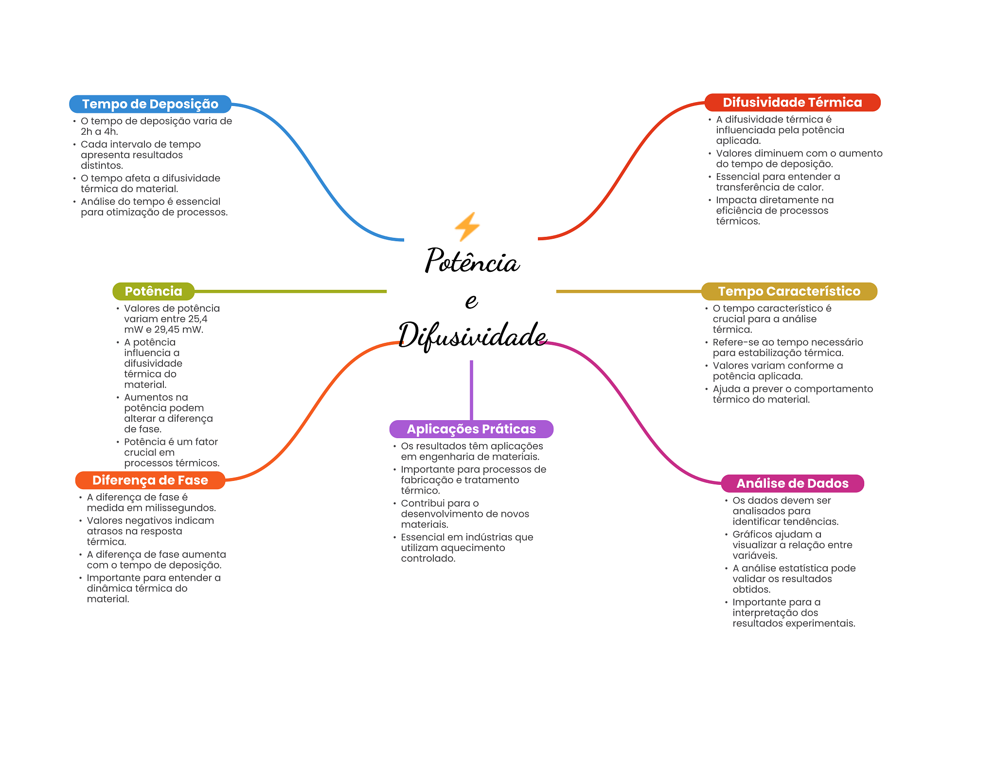 Tempo de Deposição Difusividade Térmica tempo de deposição varia de A difusividade térmica é 2h a 4h. influenciada pela potência Cada intervalo de tempo aplicada. apresenta resultados Valores diminuem com aumento distintos. do tempo de deposição. tempo afeta a difusividade Essencial para entender a térmica do material. transferência de calor. Análise do tempo é essencial Impacta diretamente na para otimização de processos. eficiência de processos térmicos. Potência Potência Tempo Característico e Valores de potência tempo característico é variam entre 25,4 crucial para a análise mW e 29,45 mW. A potência Difusividade térmica. Refere-se ao tempo necessário influencia a para estabilização térmica. difusividade Valores variam conforme a térmica do potência aplicada. material. Ajuda a prever O comportamento Aumentos na térmico do material. potência podem alterar a diferença de fase. Aplicações Práticas Potência é um fator Os resultados têm aplicações crucial em em engenharia de materiais. processos térmicos. Importante para processos de Diferença de Fase fabricação e tratamento Análise de Dados térmico. A diferença de fase é medida em milissegundos. Contribui para Os dados devem ser desenvolvimento de novos analisados para Valores negativos indicam materiais. identificar tendências. atrasos na resposta Essencial em indústrias que Gráficos ajudam a térmica. utilizam aquecimento visualizar a relação entre A diferença de fase aumenta controlado. variáveis. com tempo de deposição. A análise estatística pode Importante para entender a validar resultados dinâmica térmica do obtidos. material. Importante para a interpretação dos resultados experimentais.