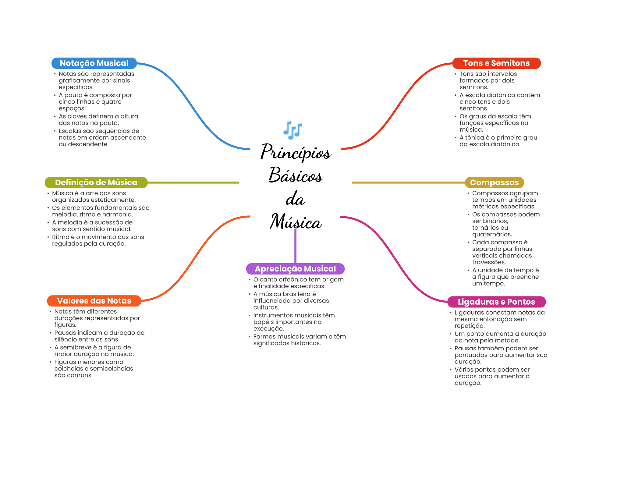 Notação Musical Tons e Semitons Notas são representadas Tons são intervalos graficamente por sinais formados por dois específicos. semitons. A pauta é composta por A escala diatônica contém cinco linhas e quatro cinco tons e dois espaços. semitons. As claves definem a altura Os graus da escala têm das notas na pauta. funções específicas na Escalas são sequências de música. notas em ordem ascendente A tônica é primeiro grau ou descendente. da escala diatônica. Básicos Definição de Música Compassos Música é a arte dos sons da Compassos agrupam organizados esteticamente. tempos em unidades Os elementos fundamentais são métricas específicas. melodia, ritmo e harmonia. Música Os compassos podem A melodia é a sucessão de ser binários, sons com sentido musical. ternários ou Ritmo é movimento dos sons quaternários. regulados pela duração. Cada compasso é separado por linhas verticais chamadas travessões. Apreciação Musical A unidade de tempo é canto orfeônico tem origem a figura que preenche e finalidade específicas. um tempo. A música brasileira é Valores das Notas influenciada por diversas Ligaduras e Pontos culturas. Notas têm diferentes Instrumentos musicais têm Ligaduras conectam notas da durações representadas por papéis importantes na mesma entonação sem figuras. execução. repetição. Pausas indicam a duração do Formas musicais variam e têm Um ponto aumenta a duração silêncio entre sons. significados históricos. da nota pela metade. A semibreve é a figura de Pausas também podem ser maior duração na música. pontuadas para aumentar sua Figuras menores como duração. colcheias e semicolcheias Vários pontos podem ser são comuns. usados para aumentar a duração.