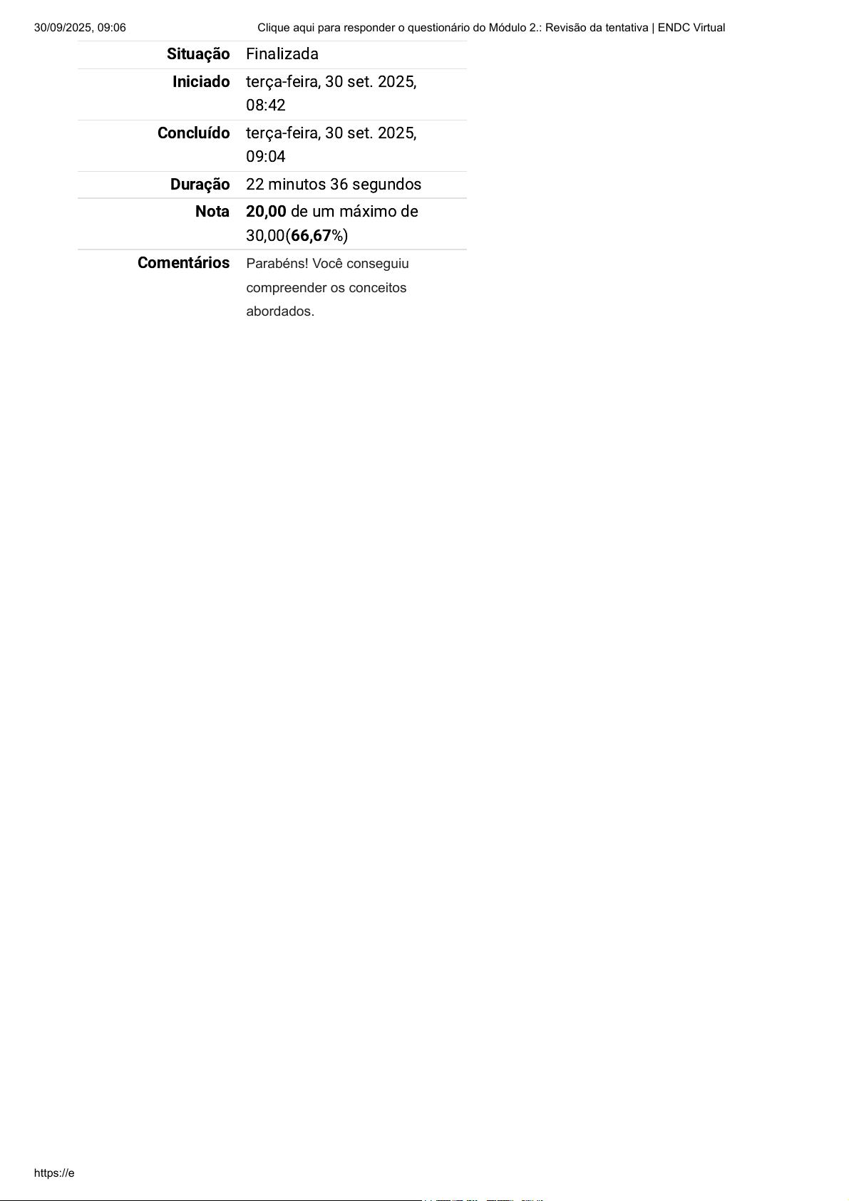 Situação Finalizada Iniciado terça-feira, 30 set. 2025, 08:42 Concluído terça-feira, 30 set. 2025, 09:04 Duração 22 minutos 36 segundos Nota 20,00 de um máximo de 30,00(66,67%) Comentários Parabéns! Você conseguiu compreender os conceitos abordados. 30/09/2025, 09:06 Clique aqui para responder o questionário do Módulo 2.: Revisão da tentativa | ENDC Virtual https://eaddefesadoconsumidor.mj.gov.br/mod/quiz/review.php?attempt=382134&cmid=34430 1/14 Questão 1 Correto Atingiu 5,00 de 5,00 Escolha uma opção: Assunto: Regulação e Consumo A atuação de controle por regulação do poder público sobre os prestadores de serviços públicos, de utilidade pública ou interesse público, visa garantir condições para que a oferta seja feita de forma ampla, promovendo o acesso do maior número possível de pessoas a esses serviços. Sobre a atividade regulatória no Brasil, marque a opção correta: a. A atividade regulatória representa, exclusivamente, a promulgação de regras pelos órgãos e agências reguladoras aos serviços públicos ou privados regulados. b. A atividade regulatória não se limita à promulgação de regras, mas inclui a atividade de monitoramento do mercado e a fiscalização de condutas, porém, não inclui a tomada de medidas que visam obrigar os agentes regulados a obedecer às regras estabelecidas. c. São exemplos de serviços regulados no Brasil os serviços financeiros, de telecomunicação, de energia elétrica, de transporte aéreo e terrestre e de comércio de automóveis. d. A prestação de serviços regulados à população submete-se A alternativa está correta.. A prestação de serviços regulados à população 30/09/2025, 09:06 Clique aqui para responder o questionário do Módulo 2.: Revisão da tentativa | ENDC Virtual https://eaddefesadoconsumidor.mj.gov.br/mod/quiz/review.php?attempt=382134&cmid=34430 2/14 https://eaddefesadoconsumidor.mj.gov.br/mod/glossary/showentry.php?eid=97&displayformat=dictionary às disposições do Código de Defesa do Consumidor, bem como a legislações específicas e regulamentos setoriais. submete-se às disposições do Código de Defesa do Consumidor, bem como a legislações específicas e regulamentos setoriais, de forma que os consumidores de tais serviços contam com uma proteção legislativa integrada por estes instrumentos legais. Sua resposta está correta. 30/09/2025, 09:06 Clique aqui para responder o questionário do Módulo 2.: Revisão da tentativa | ENDC Virtual https://eaddefesadoconsumidor.mj.gov.br/mod/quiz/review.php?attempt=382134&cmid=34430 3/14 Questão 2 Incorreto Atingiu 0,00 de 5,00 Escolha uma opção: Assunto: Regulação e Consumo Na década de 1990, o Brasil passou por um grande processo de privatizações, e a exploração de certos serviços públicos, como energia elétrica e telefonia, passou a ser concedida a empresas privadas. Foi nesse contexto de reforma econômica do Estado Brasileiro que surgiram as Agências e órgãos reguladores. Sobre o modelo regulatório no Brasil, marque a opção correta: a. No Brasil apenas as Agências Reguladoras e Autarquias Especiais possuem poder de regular setores de sua competência. A alternativa está incorreta. Outros entes públicos exercem, no Brasil, atividades regulatórias, como o Banco Central, a Susep, e o Inmetro. b. São objetivos planejados das agências reguladoras relacionados à defesa do consumidor: garantir os direitos do consumidor, buscar a qualidade e segurança dos serviços aos menores custos para os consumidores e dirimir seus conflitos com os fornecedores dos serviços regulados. c. Os órgãos e agências reguladores se assemelham aos órgãos de defesa do consumidor porque ambos atuam, exclusivamente, na proteção dos interesses dos consumidores. 30/09/2025, 09:06 Clique aqui para responder o questionário do Módulo 2.: Revisão da tentativa | ENDC Virtual https://eaddefesadoconsumidor.mj.gov.br/mod/quiz/review.php?attempt=382134&cmid=34430 4/14 https://eaddefesadoconsumidor.mj.gov.br/mod/glossary/showentry.php?eid=97&displayformat=dictionary d. As agências reguladoras brasileiras seguem a Lei Geral das Agências Reguladoras, que define suas competências e forma de atuação. Sua resposta está incorreta. 30/09/2025, 09:06 Clique aqui para responder o questionário do Módulo 2.: Revisão da tentativa | ENDC Virtual https://eaddefesadoconsumidor.mj.gov.br/mod/quiz/review.php?attempt=382134&cmid=34430 5/14 Questão 3 Correto Atingiu 5,00 de 5,00 Escolha uma opção: Assunto: Regulação e Consumo Apesar de empresas privadas passarem a ser responsáveis pela prestação de determinados serviços, a natureza desses serviços continuou sendo pública ou de interesse público, ficando reservadas ao Poder Público certas responsabilidades. Nesse sentido, responda: por que as agências reguladoras foram criadas no Brasil? a. As agências reguladoras foram criadas para prestar, no mercado de consumo, serviços públicos ou de interesse público aos consumidores, como serviços de telecomunicações e fornecimento de energia elétrica. b. As agências reguladoras surgiram como instrumento da atuação estatal, assumindo funções de planejamento, regulação e fiscalização da adequada prestação dos serviços públicos prestados por empresas privadas, concessionárias e permissionárias. A alternativa está correta. Com as privatizações, empresas privadas passaram a ser responsáveis pela prestação de determinados serviços públicos ou de interesse público, ficando reservada ao Poder Público a responsabilidade quanto à fiscalização de sua adequada prestação e a 30/09/2025, 09:06 Clique aqui para responder o questionário do Módulo 2.: Revisão da tentativa | ENDC Virtual https://eaddefesadoconsumidor.mj.gov.br/mod/quiz/review.php?attempt=382134&cmid=34430 6/14 https://eaddefesadoconsumidor.mj.gov.br/mod/glossary/showentry.php?eid=97&displayformat=dictionary sua regulamentação. c. Porque não