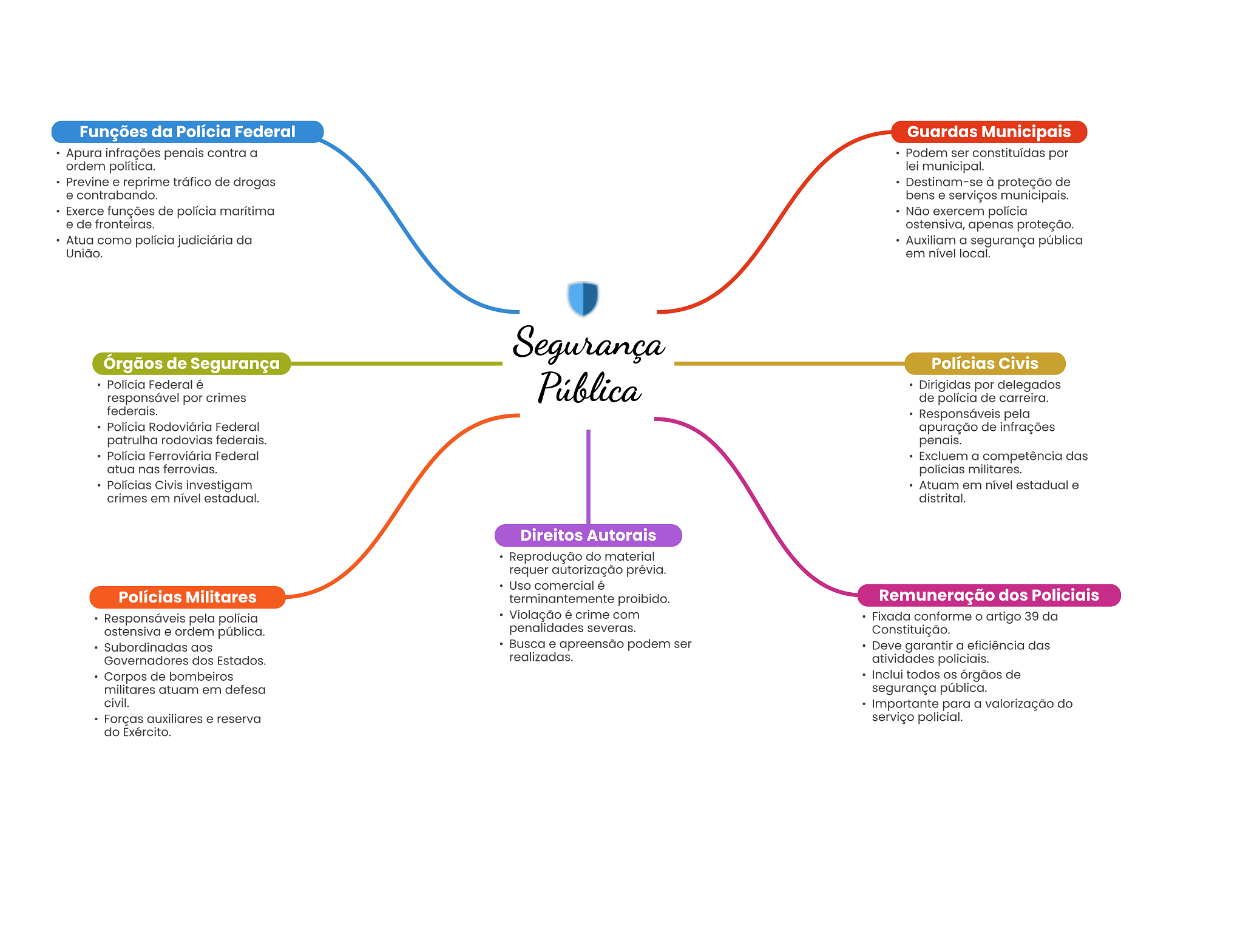 Funções da Polícia Federal Guardas Municipais Apura infrações penais contra a Podem ser constituídas por ordem política. lei municipal. Previne e reprime tráfico de drogas Destinam-se à proteção de e contrabando. bens e serviços municipais. Exerce funções de polícia marítima Não exercem polícia e de fronteiras. ostensiva, apenas proteção. Atua como polícia judiciária da Auxiliam a segurança pública União. em nível local. Segurança Órgãos de Segurança Polícias Civis Polícia Federal é Pública Dirigidas por delegados responsável por crimes de polícia de carreira. federais. Responsáveis pela Polícia Rodoviária Federal apuração de infrações patrulha rodovias federais. penais. Polícia Ferroviária Federal Excluem a competência das atua nas ferrovias. polícias militares. Polícias Civis investigam Atuam em nível estadual e crimes em nível estadual. distrital. Direitos Autorais Reprodução do material requer autorização prévia. Uso comercial é Polícias Militares terminantemente proibido. Remuneração dos Policiais Responsáveis pela polícia Violação é crime com Fixada conforme artigo 39 da ostensiva e ordem pública. penalidades severas. Constituição. Subordinadas aos Busca e apreensão podem ser Deve garantir a eficiência das Governadores dos Estados. realizadas. atividades policiais. Corpos de bombeiros Inclui todos órgãos de militares atuam em defesa segurança pública. civil. Importante para a valorização do Forças auxiliares e reserva serviço policial. do Exército.