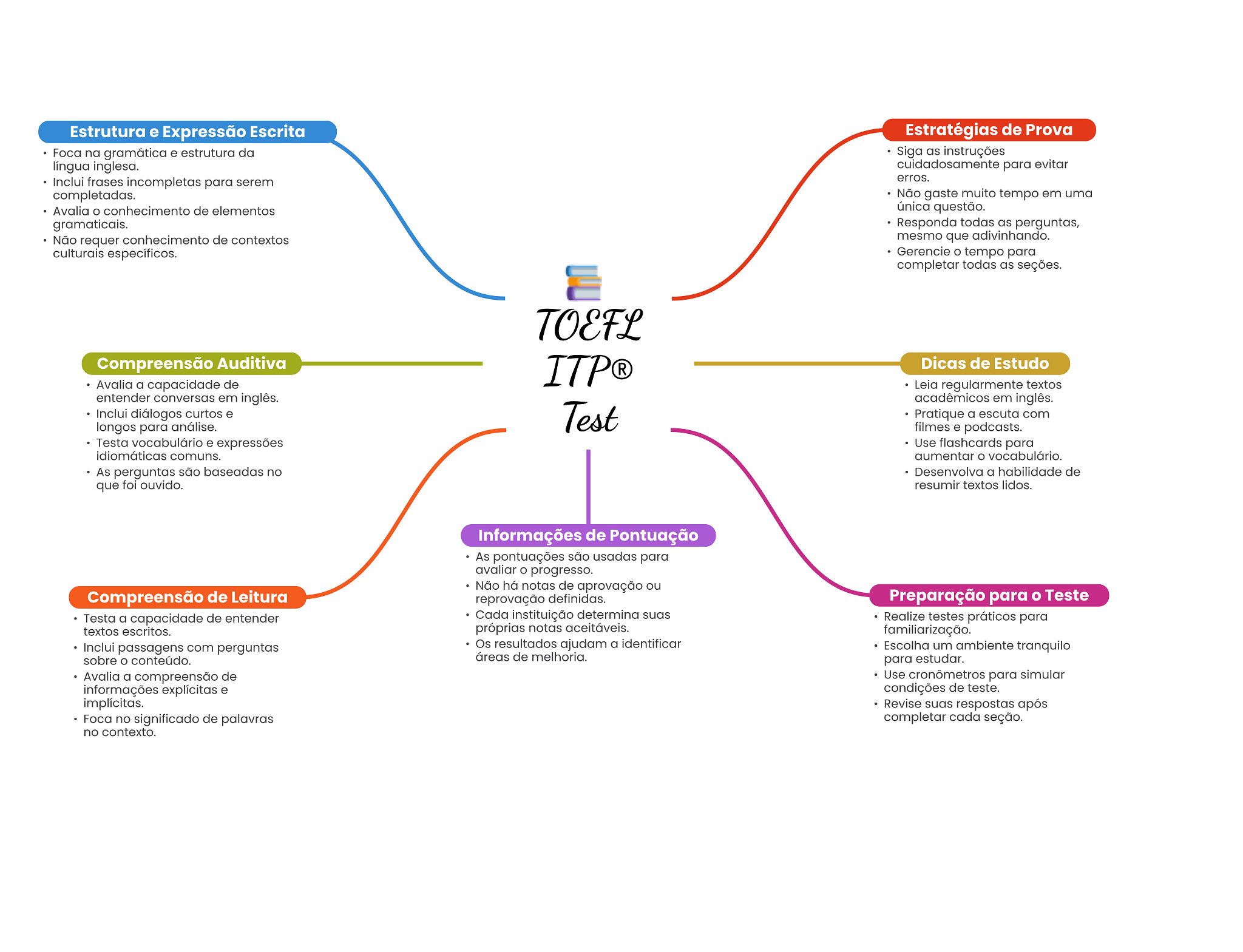 Estrutura e Expressão Escrita Estratégias de Prova Foca na gramática e estrutura da Siga as instruções língua inglesa. cuidadosamente para evitar Inclui frases incompletas para serem erros. completadas. Não gaste muito tempo em uma Avalia conhecimento de elementos única questão. gramaticais. Responda todas as perguntas, Não requer conhecimento de contextos mesmo que adivinhando. culturais específicos. Gerencie tempo para completar todas as seções. TOEFL Compreensão Auditiva ITP® Dicas de Estudo Avalia a capacidade de Leia regularmente textos entender conversas em inglês. acadêmicos em inglês. Inclui diálogos curtos e Test Pratique a escuta com longos para análise. filmes e podcasts. Testa vocabulário e expressões Use flashcards para idiomáticas comuns. aumentar O vocabulário. As perguntas são baseadas no Desenvolva a habilidade de que foi ouvido. resumir textos lidos. Informações de Pontuação As pontuações são usadas para avaliar progresso. Não há notas de aprovação ou Compreensão de Leitura reprovação definidas. Preparação para Teste Testa a capacidade de entender Cada instituição determina suas Realize testes práticos para textos escritos. próprias notas aceitáveis. familiarização. Inclui passagens com perguntas Os resultados ajudam a identificar Escolha um ambiente tranquilo sobre conteúdo. áreas de melhoria. para estudar. Avalia a compreensão de Use cronômetros para simular informações explícitas e condições de teste. implícitas. Revise suas respostas após Foca no significado de palavras completar cada seção. no contexto.
