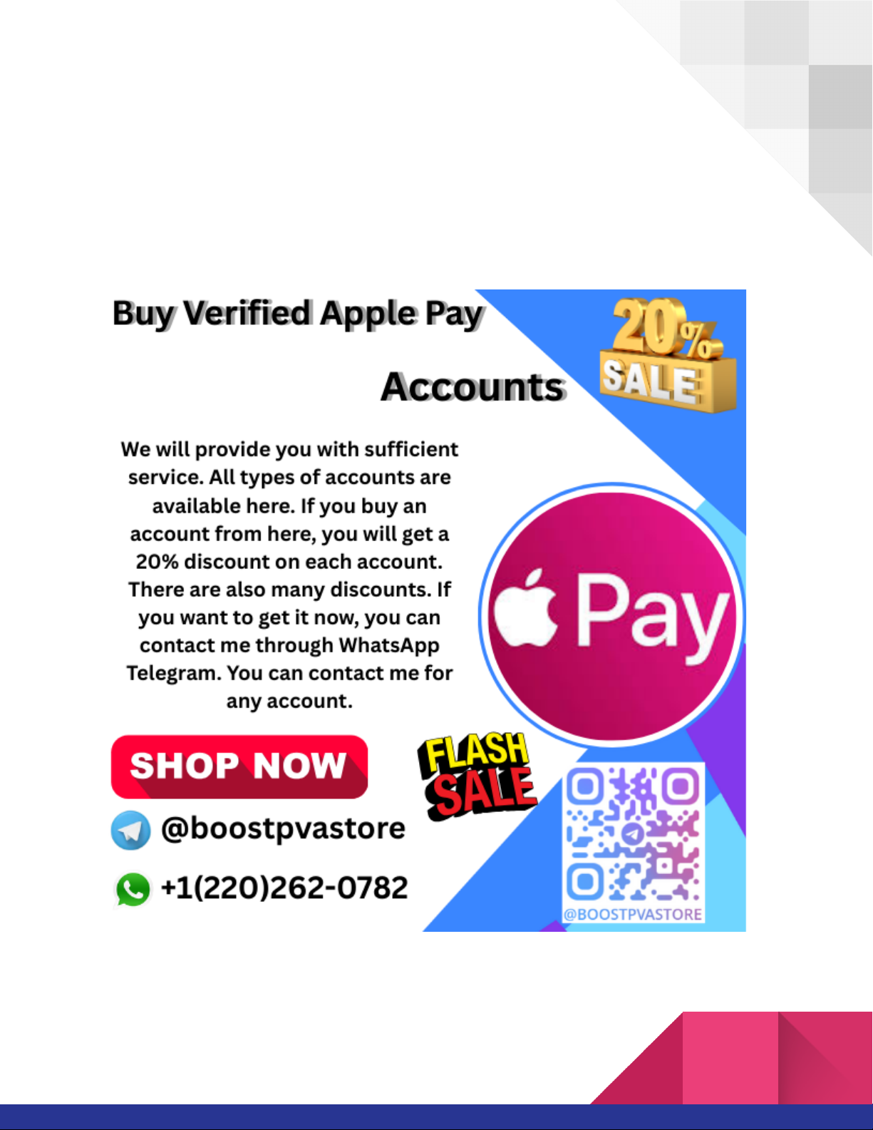 Apple Pay Accounts in 2026: The Ultimate Guide to Secure Payments Learn all about Apple Pay Accounts in 2026, how they work, and why they are a powerful tool for secure transactions. A complete guide for modern payments in the USA. In 2026, Apple Pay continues to redefine the way we make payments, both in-store and online. With advancements in security, technology, and user experience, Apple Pay accounts have become an essential tool for millions of people worldwide. This comprehensive guide will take you through everything you need to know about Apple Pay Accounts in 2026, from how they work to the benefits they bring to consumers and businesses alike. Let’s dive in. ➤WhatsApp:+1(220)262-0782 ➤Telegram: @boostpvastore What Are Apple Pay Accounts? Apple Pay is a mobile payment and digital wallet service provided by Apple Inc. In 2026, Apple Pay has evolved into a comprehensive payment system, offering a secure, fast, and efficient way for users to make transactions using their Apple devices. An Apple Pay account is essentially linked to a user’s Apple ID, enabling them to store credit cards, debit cards, loyalty cards, and even transit passes for quick, easy access when making payments. The Evolution of Apple Pay Launched in 2014, Apple Pay started as a simple tool to make contactless payments using iPhones and Apple Watches. However, by 2026, Apple Pay has expanded far beyond just point-of-sale transactions. Today, it integrates seamlessly with various other services such as subscriptions, online shopping, and peer-to-peer money transfers, making it a robust financial platform that’s trusted by millions of users. How Do Apple Pay Accounts Work? https://wa.me/12202620782 http://t.me/boostpvastore Apple Pay works by allowing users to store their payment information securely on their Apple devices. This can include credit cards, debit cards, and even digital passes for things like airlines or events. Here’s a step-by-step breakdown of how Apple Pay accounts work: ➤WhatsApp:+1(220)262-0782 ➤Telegram: @boostpvastore 1. Setting Up an Apple Pay Account Setting up Apple Pay is simple. Follow these steps: ● Open the Wallet app: On your iPhone, iPad, or Apple Watch, open the Wallet app. ● Add a Card: Tap the “+” icon to add a new credit or debit card. You’ll need to either scan your card or manually enter the details. ● Verification: Apple will verify the card details with your bank or financial institution. This might include sending you a verification code to complete the process. ● Complete Setup: Once verified, your card is added to your Apple Pay account, ready to use. 2. Making Payments with Apple Pay Once your Apple Pay account is set up, making payments is incredibly easy: ● In-Store Payments: To pay at a physical store, hold your iPhone or Apple Watch near the payment terminal. Authentication via Face ID, Touch ID, or your device passcode is https://wa.me/12202620782 http://t.me/boostpvastore required for security. ● Online and App Payments: When shopping online or within apps, simply choose the "Apple Pay" option during checkout. Authentication is done using your Face ID, Touch ID, or passcode. ● Peer-to-Peer Transfers: Apple Pay also allows for quick money transfers to friends and family via the Messages app, making it an excellent choice for splitting bills or sending funds. 3. Security Features of Apple Pay Accounts One of the most important features of Apple Pay accounts is their security. Apple uses several methods to ensure your payment information remains safe, including: ● Tokenization: Apple Pay doesn’t store your actual credit card number. Instead, it generates a unique token for each transaction, making it much harder for fraudsters to access your data. ● Biometric Authentication: Face ID, Touch ID, and device passcodes provide an extra layer of security, ensuring that only authorized users can complete payments. ● Device-Specific Account Numbers: Each Apple device uses a unique account number, meaning that even if one device is compromised, your other devices remain secure. 4. Apple Pay Cash: Digital Wallet Functionality Apple Pay Cash is another powerful feature that allows users to store money in their Apple Pay account and use it for payments. You can send, receive, and store money within your Apple Pay wallet, making it a great alternative to traditional banking for everyday transactions. Apple Pay Cash can be used for both digital and in-person transactions, providing users with more flexibility and control over their finances. Why Apple Pay Accounts Are a Powerful Tool in 2026 ➤WhatsApp:+1(220)262-0782 ➤Telegram: @boostpvastore 1. Increased Security and Privacy In today’s digital age, security is more important than ever. Apple Pay provides an ultra-secure payment method through features like tokenization, biometric authentication, and end-to-end encryption. With the rise in online shopping and contactless transactions, Apple Pay offers a solution that protects both consumers and businesses from fraud. 2. Seamless User Experience One of the biggest draws of Apple Pay accounts is their ease of use. With just a few taps on your phone, you can complete transactions without having to pull out a physical wallet. The integration of Apple Pay with Apple’s ecosystem ensures that the payment process is smooth across all devices. Whether you’re paying for a coffee, booking a flight, or transferring money to a friend, Apple Pay makes the experience seamless and efficient. 3. Integration with Modern Payment Systems Apple Pay doesn’t just work at retail stores. It’s become an essential part of the digital economy. With its integration with apps, websites, and subscription services, Apple Pay accounts have made online shopping faster and more secure. Services like streaming, e-commerce, and even utility bill payments are now accepting Apple Pay, enhancing its versatility. 4. Global Reach and Compatibility https://wa.me/122026