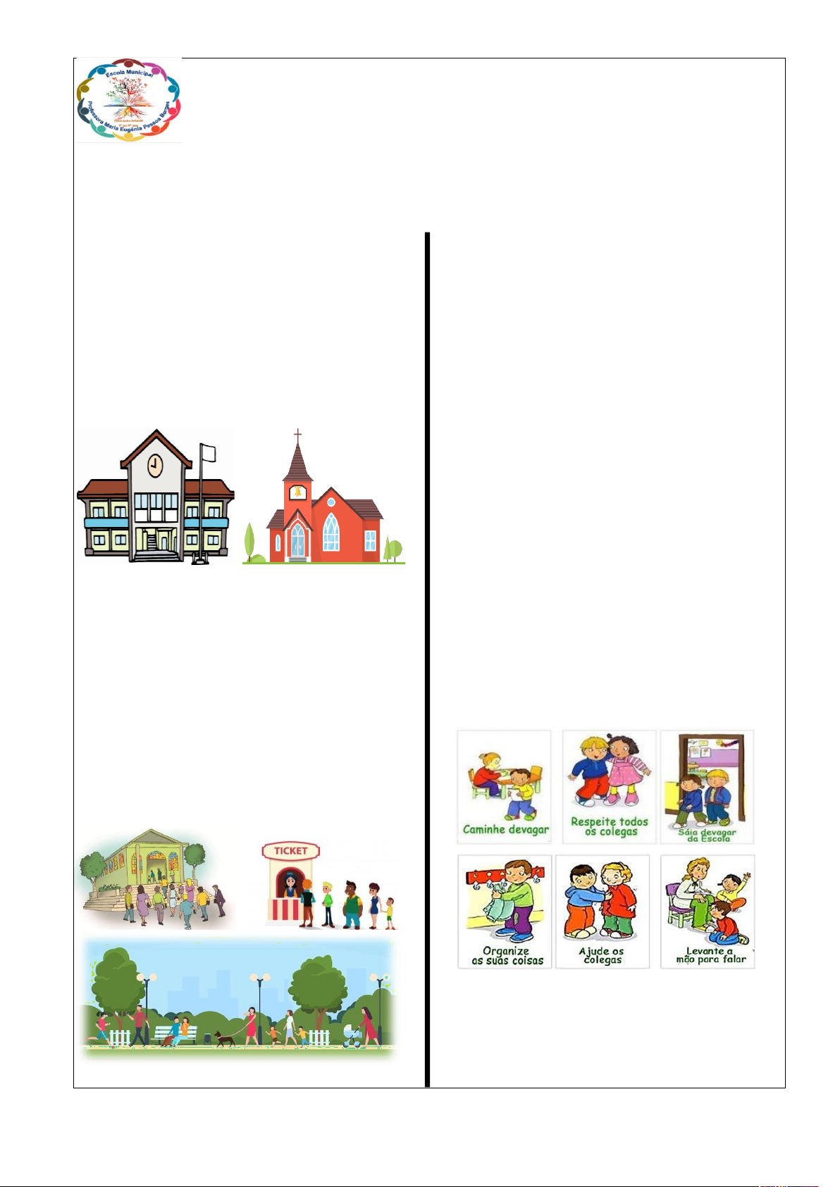 Escola Municipal Professora Maria Eugênia Pessoa Borges. Damolândia, _____ de _____________________________ de 2026. Professora: Pollyanna Nome:_________________________________________________ GEOGRAFIA LUGARES DE VIVÊNCIAS Quando você nasceu, você ganhou uma família que lhe ofereceu um lugar para viver: a sua casa. Ao crescer, você aprendeu que existem outros lugares de vivências: a escola, a rua, a igreja, o parque, o hospital, o supermercado, o banco, dentre outros. Esses lugares são considerados locais de vivências, porque você convive com outras pessoas, seja por muito tempo, como na escola e na igreja, ou pouco tempo, como no banco e na rua. Todavia, todos os lugares têm a sua importância para a sociedade. Observe as imagens: Você percebe o quanto esses lugares são diferentes e como são necessários? Todas as pessoas precisam aprender a viver em lugares diferentes, assim, estarão seguras e felizes. Regras de Convivências Cada lugar tem as suas próprias regras de convivência. Elas são necessárias para termos comportamentos adequados em determinados lugares que frequentamos. Conhecer e respeitar as regras de convivência, nos torna em pessoas mais educadas e nos ajuda a aproveitar o que cada lugar tem de melhor para nos oferecer. Conheça algumas regras de convivência da escola: Desse modo, lugares de vivências são espaços onde as pessoas se relacionam, se respeitam e se alegram. Por isso, é muito importante cuidar do espaço em que vivemos para se relacionar harmoniosamente com todos ao nosso redor. ATIVIDADES 1. Qual foi o nosso primeiro lugar de vivência? ( ) A casa. ( ) A escola. ( ) A igreja. ( ) O parque. 2. O que é lugar de convivência? ( ) São locais para guardar os brinquedos preferidos. ( ) São lugares para as crianças desobedientes. ( ) São lugares para as pessoas ficarem sozinhas. ( ) São espaços onde as pessoas se relacionam. 3. Encontre no diagrama 5 lugares de vivência: E S C O L A C B A W X F G O L E R S G P R A Ç A L U S Ç S D A F E Y A P V B A N C O B N U C X E U Q U O P I C I J L H O T E L 4. É uma regra de convivência: ( ) falar alto em todo lugar. ( ) não guardar os brinquedos. ( ) empurrar as crianças. ( ) respeitar os professores. 5. Marque a alternativa que apresenta o local com o MENOR tempo para vivência: ( ) ( ) ( ) image4.jpeg image5.jpeg image6.png image7.jpeg image8.jpeg image9.png image10.jpeg image11.jpeg image12.jpeg image13.jpeg image14.jpeg image1.png image2.png image3.jpeg