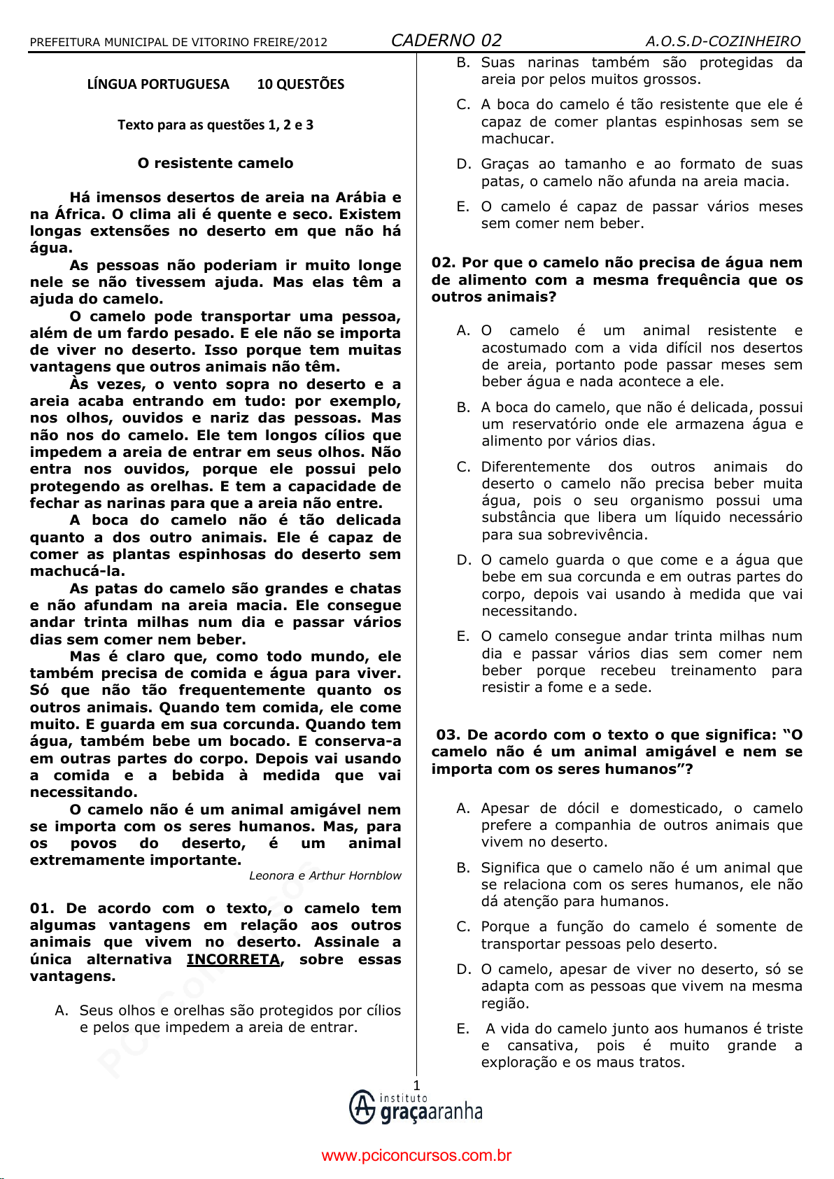 pcimarkpci MDAwMDowMDAwOjAwMDA6MDAwMDowMDAwOmZmZmY6YjE4ODpiNjY5:VGh1LCAyOSBKYW4gMjAyNiAyMzoxNjoyMSAtMDMwMA== www.pciconcursos.com.br PREFEITURA MUNICIPAL DE VITORINO FREIRE/2012 CADERNO 02 A.O.S.D-COZINHEIRO 1 LÍNGUA PORTUGUESA 10 QUESTÕES Texto para as questões 1, 2 e 3 O resistente camelo Há imensos desertos de areia na Arábia e na África. O clima ali é quente e seco. Existem longas extensões no deserto em que não há água. As pessoas não poderiam ir muito longe nele se não tivessem ajuda. Mas elas têm a ajuda do camelo. O camelo pode transportar uma pessoa, além de um fardo pesado. E ele não se importa de viver no deserto. Isso porque tem muitas vantagens que outros animais não têm. Às vezes, o vento sopra no deserto e a areia acaba entrando em tudo: por exemplo, nos olhos, ouvidos e nariz das pessoas. Mas não nos do camelo. Ele tem longos cílios que impedem a areia de entrar em seus olhos. Não entra nos ouvidos, porque ele possui pelo protegendo as orelhas. E tem a capacidade de fechar as narinas para que a areia não entre. A boca do camelo não é tão delicada quanto a dos outro animais. Ele é capaz de comer as plantas espinhosas do deserto sem machucá-la. As patas do camelo são grandes e chatas e não afundam na areia macia. Ele consegue andar trinta milhas num dia e passar vários dias sem comer nem beber. Mas é claro que, como todo mundo, ele também precisa de comida e água para viver. Só que não tão frequentemente quanto os outros animais. Quando tem comida, ele come muito. E guarda em sua corcunda. Quando tem água, também bebe um bocado. E conserva-a em outras partes do corpo. Depois vai usando a comida e a bebida à medida que vai necessitando. O camelo não é um animal amigável nem se importa com os seres humanos. Mas, para os povos do deserto, é um animal extremamente importante. Leonora e Arthur Hornblow 01. De acordo com o texto, o camelo tem algumas vantagens em relação aos outros animais que vivem no deserto. Assinale a única alternativa INCORRETA, sobre essas vantagens. A. Seus olhos e orelhas são protegidos por cílios e pelos que impedem a areia de entrar. B. Suas narinas também são protegidas da areia por pelos muitos grossos. C. A boca do camelo é tão resistente que ele é capaz de comer plantas espinhosas sem se machucar. D. Graças ao tamanho e ao formato de suas patas, o camelo não afunda na areia macia. E. O camelo é capaz de passar vários meses sem comer nem beber. 02. Por que o camelo não precisa de água nem de alimento com a mesma frequência que os outros animais? A. O camelo é um animal resistente e acostumado com a vida difícil nos desertos de areia, portanto pode passar meses sem beber água e nada acontece a ele. B. A boca do camelo, que não é delicada, possui um reservatório onde ele armazena água e alimento por vários dias. C. Diferentemente dos outros animais do deserto o camelo não precisa beber muita água, pois o seu organismo possui uma substância que libera um líquido necessário para sua sobrevivência. D. O camelo guarda o que come e a água que bebe em sua corcunda e em outras partes do corpo, depois vai usando à medida que vai necessitando. E. O camelo consegue andar trinta milhas num dia e passar vários dias sem comer nem beber porque recebeu treinamento para resistir a fome e a sede. 03. De acordo com o texto o que significa: “O camelo não é um animal amigável e nem se importa com os seres humanos”? A. Apesar de dócil e domesticado, o camelo prefere a companhia de outros animais que vivem no deserto. B. Significa que o camelo não é um animal que se relaciona com os seres humanos, ele não dá atenção para humanos. C. Porque a função do camelo é somente de transportar pessoas pelo deserto. D. O camelo, apesar de viver no deserto, só se adapta com as pessoas que vivem na mesma região. E. A vida do camelo junto aos humanos é triste e cansativa, pois é muito grande a exploração e os maus tratos. www.pciconcursos.com.br pcimarkpci MDAwMDowMDAwOjAwMDA6MDAwMDowMDAwOmZmZmY6YjE4ODpiNjY5:VGh1LCAyOSBKYW4gMjAyNiAyMzoxNjoyMSAtMDMwMA== www.pciconcursos.com.br PREFEITURA MUNICIPAL DE VITORINO FREIRE/2012 CADERNO 02 A.O.S.D-COZINHEIRO 2 04. Classificou-se, corretamente, a palavra dada em: A. Lâmpada – paroxítona. B. Ideia – tritongo. C. História – proparoxítona. D. Bombom – oxítona. E. Flor – monossílabo átono. 05. Marque a alternativa em que todas as palavras são masculinas. A. Apêndice, champanha, guaraná. B. Alvará, dinamite, omoplata. C. Omelete, aguardente, sentinela. D. Cal, telefonema, comichão. E. Análise, hélice, cataplasma. 06. Preencha as lacunas com D para dígrafo e EC para encontro consonantal. ( ) blusa, crítica, faísca ( ) Garfo, pneu, cascavel ( ) exceção, palha, discípulo ( ) desça, assassino, equivaler Assinale a alternativa com a sequência correta: A. D, EC, EC, D. B. EC, EC, D, D. C. D, EC, D, EC. D. EC, D, EC, D. E. D, D, EC, EC. 07. "Muitos atletas brasileiros atuam na Europa”. Nesta oração o tipo de sujeito é: A. Sujeito composto. B. Sujeito simples. C. Sujeito oculto. D. Oração sem sujeito. E. Sujeito indeterminado. 08. Assinale a alternativa em que a oração possui predicado verbal. A. O dia amanheceu cinzento. B. Santos Dumont foi o inventor de talento. C. Os alunos ouviam a aula atentos. D. O futebol é uma paixão séria. E. O exército americano chegou ao Brasil. 09. Marque a única alternativa em que não há ERRO na formação do plural do substantivo A. Todos os escrivãos abandonaram a delegacia da cidade. B. Os irmãos abraçaram-se comovidos. C. Muitos cidadões protestaram contra a poluição ambiental. D. Os antigos gregos e romanos eram povos pagães. E. Ganhei seis lindas colherzinhas de prata. 10. Leia a frase do quadro abaixo: Na frase há: A. 1 artigo 2 numerais. B. 3 adjetivos e 1 verbo. C. 2 pronomes e 2 advérbios. D. 1 adjetivo e 3 verbos. E. 3 pronomes e 3 adjetivos. www.pciconcursos.com.b