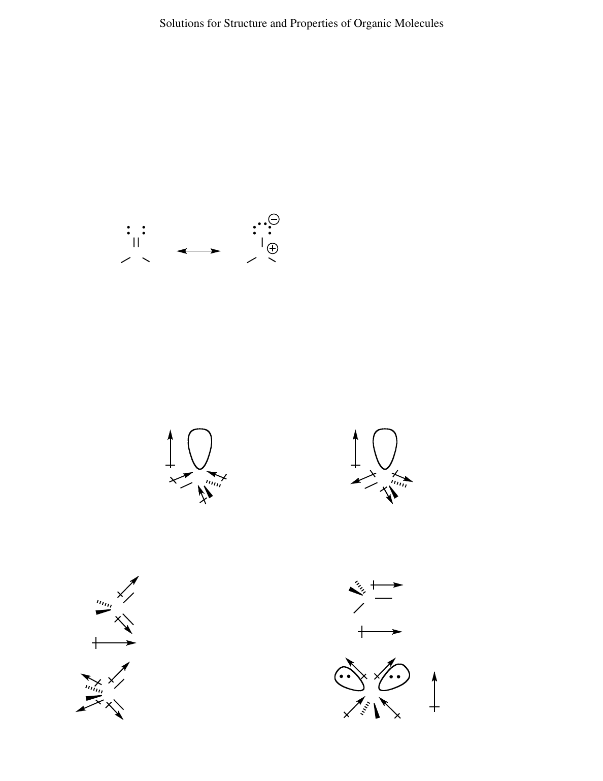 Solutions for Structure and Properties of Organic Molecules (d) same compound—just flipped over (e) same compound—just rotated (f) same compound—just rotated (g) not isomers—different molecular formulas (h) Constitutional isomers—the double bond has changed position. (i) same compound—just reversed (j) Constitutional isomers—the CH3 groups are in different relative positions. (k) Constitutional isomers—the double bond is in a different position relative to the CH3 and an H has moved. 12 (a) 2.4 D = 4.8 x δ x 1.23 Å δ = 0.41, or 41% of a positive charge on carbon and 41% of a negative charge on oxygen (b) Resonance form A must be the major contributor. If B were the major contributor, the value of the charge separation would be between 0.5 and 1.0, meaning >50% of a positive charge on C and >50% of a negative charge on O. Even though B is "minor", it is quite significant, explaining in part the high polarity of the C=O. C O R R C O R R A N H H H N F F F 13 Both NH3 and NF3 have a pair of nonbonding electrons on the nitrogen. In NH3, the direction of polarization of the N—H bonds is toward the nitrogen; thus, all three bond polarities and the lone pair polarity reinforce each other. In NF3, on the other hand, the direction of polarization of the N—F bonds is away from the nitrogen; the three bond polarities cancel the lone pair polarity, so the net result is a very small molecular dipole moment. • • • • polarities reinforce; large dipole moment (1.50) polarities oppose; small dipole moment (0.20) B 14 Some magnitudes of dipole moments are difficult to predict; however, the direction of the dipole should be straightforward, in most cases. Actual values of molecular dipole moments are given in parentheses. (Each halogen atom has three nonbonded electron pairs, not shown below.) The C—H is usually considered nonpolar. net large dipole (1.81) large dipole (1.54) net (b)(a) C Cl Cl H H C F H H H large dipole (1.70) net net dipole = 0 (d)(c) C F F F F O CH3 H 11 continued 41