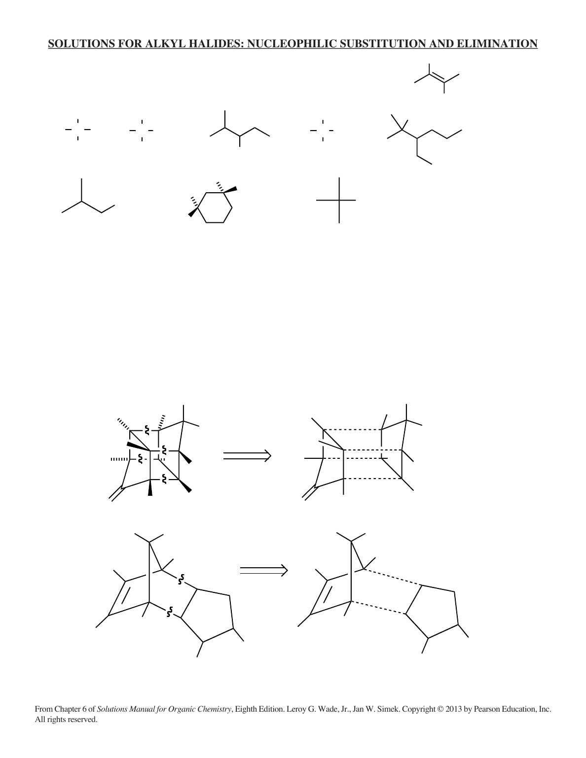 SOLUTIONS FOR ALKYL HALIDES: NUCLEOPHILIC SUBSTITUTION AND ELIMINATION From Chapter 6 of Solutions Manual for Organic Chemistry, Eighth Edition. Leroy G. Wade, Jr., Jan W. Simek. Copyright © 2013 by Pearson Education, Inc. All rights reserved. Cl F CH2FH H I C HI IBr Br C Br Br Br BrH C II H 1 In problems like part (a), draw out the whole structure to detect double bonds: (a) vinyl halide (d) alkyl halide 2 (a) (b) (c) (d) (e) (c) alkyl halide (f) aryl halide (g) (b) alkyl halide (e) vinyl halide (f) (h) or (CH3)3CCl Br 3 IUPAC name; common name; degree of halogen-bearing carbon (a) 1-chloro-2-methylpropane; isobutyl chloride; 1° halide (b) 2-bromo-2-methylpropane; tert-butyl bromide; 3° halide (c) 1-chloro-2-methylbutane; no common name; 1° halide (d) 4-fluoro-1,1-dimethylcyclohexane; no common name; 2° halide (e) 4-bromo-3-methylheptane; no common name; 2° halide (f) cis-1-bromo-2-chlorocyclobutane; no common name; both 2° halides; also correct is (1R,2S)-1-bromo-2-chlorocyclobutane You may have drawn the other enantiomer. Either is correct. Cl Cl Cl Cl Cl Cl Cl ClCl Cl ClCl Cl Cl Cl Cl Cl Cl Cl Cl Cl ClClO Cl Cl Cl Cl Cl O Cl Cl Cl Cl Cl Cl Cl Cl Kepone® 4 Chlordane® H F structure in part (a) 113