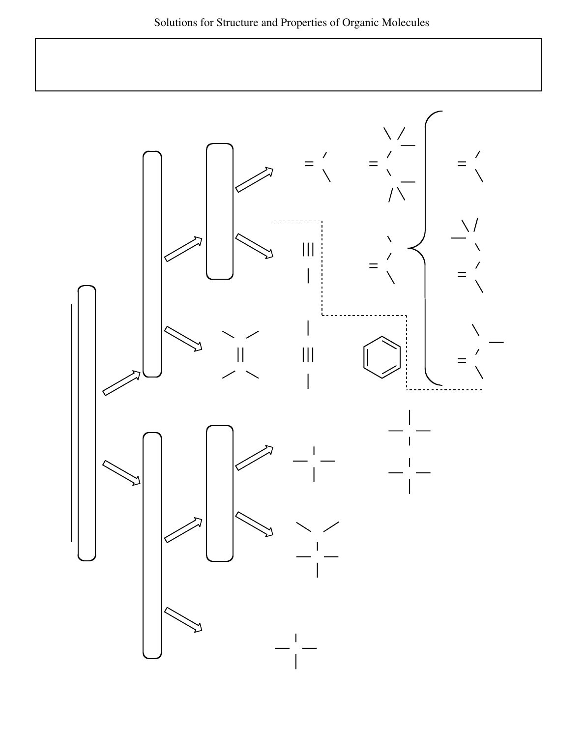 Solutions for Structure and Properties of Organic Molecules Note to the student: One of the most fundamental skills in organic chemistry is to identify what functional groups are present in a molecular structure. This page is called a "concept map" that prompts you with a series of questions about a structure, leading to the determination of the functional group. Do not memorize this chart! Use it as an aid as you are becoming familiar with the functional groups. W H A T IS T H E FU N CT IO N A L G RO U P? D O ES T H E ST RU CT U RE H A V E A N Y P I B O N D S? Y ES D O ES T H E ST RU CT U RE H A V E O O R N ? Y ES A LK A N E— no fu nc tio na l g ro up O R A LK Y L H A LI D E C X X = F , C l, Br , I D O ES T H E ST RU CT U RE H A V E O ? Y ES A M IN E C N A LC O H O L C O H O R ET H ER C O C D O ES T H E ST RU CT U RE H A V E O O R N ? Y ES A LK EN E D O ES T H E ST RU CT U RE H A V E O ? C C O R A LK Y N E Y ES CO A LD EH Y D E K ET O N E A CI D C H LO RI D E ES TE R A M ID E N IT RI LE C N BE N ZE N E (A RO M A TI C) C C O R H CO C C CO Cl CO O CO N C CA RB O X Y LI C A CI D CO O H ca lle d ac id d er iv at iv es N O N O N O N O N O Th is c ha rt de pi ct s o nl y th e m os t co m m on fu nc tio na l g ro up s. Th er e ar e m an y m or e! 44