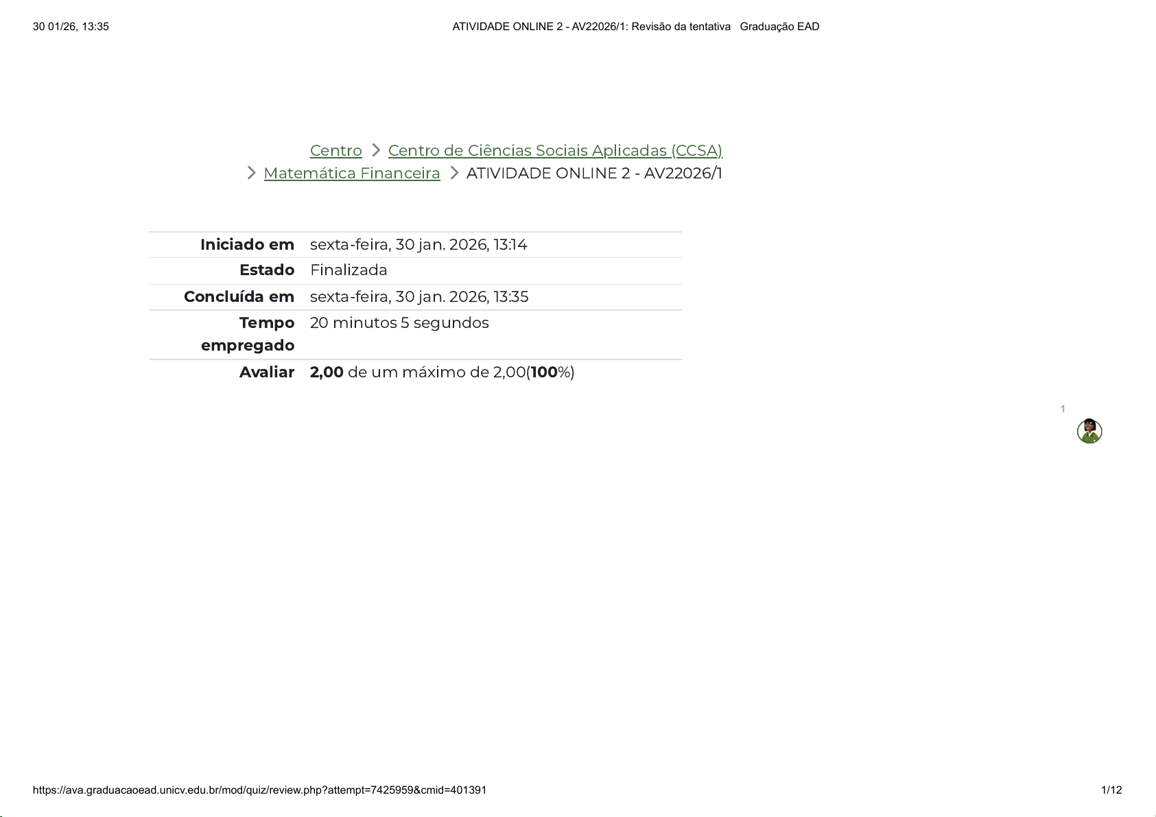 Centro 〉 Centro de Ciências Sociais Aplicadas (CCSA) 〉 Matemática Financeira 〉 ATIVIDADE ONLINE 2 - AV22026/1 Iniciado em sexta-feira, 30 jan. 2026, 13:14 Estado Finalizada Concluída em sexta-feira, 30 jan. 2026, 13:35 Tempo empregado 20 minutos 5 segundos Avaliar 2,00 de um máximo de 2,00(100%) 1 30/01/26, 13:35 ATIVIDADE ONLINE 2 - AV22026/1: Revisão da tentativa | Graduação EAD https://ava.graduacaoead.unicv.edu.br/mod/quiz/review.php?attempt=7425959&cmid=401391 1/12 https://ava.graduacaoead.unicv.edu.br/course/index.php?categoryid=267 https://ava.graduacaoead.unicv.edu.br/course/index.php?categoryid=266 https://ava.graduacaoead.unicv.edu.br/course/view.php?id=14509#section-7 Questão 1 Correto Atingiu 0,20 de 0,20 Ao estudarmos o fluxo de caixa, sabemos que o mesmo representa uma série de pagamentos ou de recebimentos em x período. Os fluxos de caixa podem ser realizados de inúmeras formas, periodicidades, valores e outras informações. Correspondente a isto, assinale a alternativa cujo representa o fluxo de caixa em um período de ocorrência: Escolha uma opção: a. Limitados. b. Constantes. c. Indefinidos. d. Diferidos. ✓ e. Periódicos. 1 30/01/26, 13:35 ATIVIDADE ONLINE 2 - AV22026/1: Revisão da tentativa | Graduação EAD https://ava.graduacaoead.unicv.edu.br/mod/quiz/review.php?attempt=7425959&cmid=401391 2/12 Questão 2 Correto Atingiu 0,20 de 0,20 Maria Helena optou por comprar uma bolsa da Louis Vuitton no valor de R$ 6.000 em 2013, porém em 2020 precisou vendê-la no valor de R$4.000. Sabe-se que a inflação neste período atingiu 300%. Qual será o ganho indexado na venda da bolsa? Escolha uma opção: a. 16,8% b. 25,1% c. 20% d. 83,33% ✓ e. 71,4% 1 30/01/26, 13:35 ATIVIDADE ONLINE 2 - AV22026/1: Revisão da tentativa | Graduação EAD https://ava.graduacaoead.unicv.edu.br/mod/quiz/review.php?attempt=7425959&cmid=401391 3/12 Questão 3 Correto Atingiu 0,20 de 0,20 Calcule o custo efetivo para o período de quatro meses de uma determinada operação. Em que, tem-se a taxa de desconto bancário nominal a 3,25% ao mês, o IOF a 0,025% ao dia e um prazo de desconto de 120 dias. Escolha uma opção: a. 19,05% a.b b. 9,5% a.b c. 15% a.b ✓ d. 24,66% a.b e. 17,02% a.b 1 30/01/26, 13:35 ATIVIDADE ONLINE 2 - AV22026/1: Revisão da tentativa | Graduação EAD https://ava.graduacaoead.unicv.edu.br/mod/quiz/review.php?attempt=7425959&cmid=401391 4/12 Questão 4 Correto Atingiu 0,20 de 0,20 Maria possui uma pizzaria e percebeu uma inflação dos alimentos no último quadrimestre. Em uma pesquisa percebeu que a taxa de inflação dos quatro períodos mensais foram de: 2,4%, 1,65%, 2,1% e 3,7%. Qual será a inflação do quadrimestre? Escolha uma opção: a. 12,6% b. 9,44% c. 10,20% ✓ d. 8,9% e. 16,7% 1 30/01/26, 13:35 ATIVIDADE ONLINE 2 - AV22026/1: Revisão da tentativa | Graduação EAD https://ava.graduacaoead.unicv.edu.br/mod/quiz/review.php?attempt=7425959&cmid=401391 5/12 Questão 5 Correto Atingiu 0,20 de 0,20 Ao falarmos dos descontos de duplicatas, sabe-se que o custo efetivo de determinado período (2 meses) foi de 37,39%. Qual será o valor encontrado na taxa efetiva mensal? Escolha uma opção: a. 17,21% ✓ b. 6,84% c. 10% d. 15% e. 16,22% 1 30/01/26, 13:35 ATIVIDADE ONLINE 2 - AV22026/1: Revisão da tentativa | Graduação EAD https://ava.graduacaoead.unicv.edu.br/mod/quiz/review.php?attempt=7425959&cmid=401391 6/12 Questão 6 Correto Atingiu 0,20 de 0,20 Maria possui uma empresa de esmaltes e vendeu em um dia R$30.000,00 com o recebimento em 40 dias. Sendo que a inflação do período foi de 1,55% e também com uma taxa de desconto bancário de 2%. Qual será o custo da venda a prazo? Escolha uma opção: a. R$ 900,00 b. R$ 600,00 ✓ c. R$ 10,00 d. R$ 150,00 e. R$ 1.100,00 1 30/01/26, 13:35 ATIVIDADE ONLINE 2 - AV22026/1: Revisão da tentativa | Graduação EAD https://ava.graduacaoead.unicv.edu.br/mod/quiz/review.php?attempt=7425959&cmid=401391 7/12 Questão 7 Correto Atingiu 0,20 de 0,20 Laika, país onde Maria Helena é rainha apresentou uma taxa de inflação nos últimos três períodos de 1,2%, 2,0% e 0,88%. Qual será a taxa de inflação trimestral apresentada em Laika? Escolha uma opção: a. 5,20% b. 6,9% c. 3% d. 7,66% e. 4,13% ✓ 1 30/01/26, 13:35 ATIVIDADE ONLINE 2 - AV22026/1: Revisão da tentativa | Graduação EAD https://ava.graduacaoead.unicv.edu.br/mod/quiz/review.php?attempt=7425959&cmid=401391 8/12 Questão 8 Correto Atingiu 0,20 de 0,20 Como uma forma de aprimorar os conhecimentos matemáticos da população brasileira, o Governo Federal teve o ENEF lançado em agosto de 2011 em uma entrevista coletiva do presidente da CONEF e dos seus membros. Disponibilizando materiais de estudos, e outros. Como estudamos, qual o nome do aplicativo criado e utilizado no projeto ENEF para informações da matemática financeira? Escolha uma opção: a. Vida Financeira b. Tá osso ✓ c. Contando d. Economize e. Poupando 1 30/01/26, 13:35 ATIVIDADE ONLINE 2 - AV22026/1: Revisão da tentativa | Graduação EAD https://ava.graduacaoead.unicv.edu.br/mod/quiz/review.php?attempt=7425959&cmid=401391 9/12 Questão 9 Correto Atingiu 0,20 de 0,20 Helen está com dificuldades para calcular seu Fluxo de Caixa (VPL), você se dispôs a ajuda-la. Observe as tabelas abaixo e assinale a alternativa correta do VPL a uma taxa efetiva de 4% ao ano. ANO INVESTIMENTO 0 -R$ 200.000,00 1 R$ 100.000,00 2 R$ 150.000,00 3 R$ 130.000,00 TAXA EFETIVA 4% VPL Escolha uma opção: a. R$ 101.200,00 b. R$ 92.200,00 c. R$ 150.406,80 ✓ d. R$ 100.000,00 1 30/01/26, 13:35 ATIVIDADE ONLINE 2 - AV22026/1: Revisão da tentativa | Graduação EAD https://ava.graduacaoead.unicv.edu.br/mod/quiz/review.php?attempt=7425959&cmid=401391 10/12 Questão 10 Correto Atingiu 0,20 de 0,20 e. R$ 115.600,02 Calcule o custo efetivo para o período de dois meses de uma determinada operação. Em que, tem-se a taxa de desconto bancário nominal a 4% ao mês, o IOF a 0,021% ao dia e um prazo 