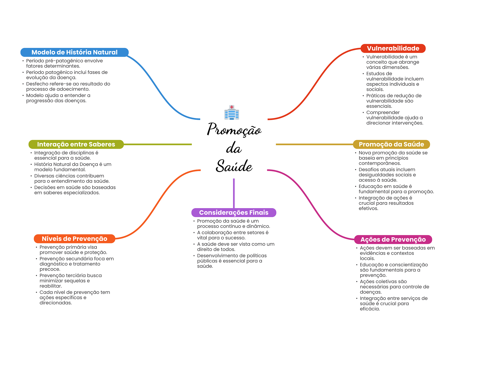 Vulnerabilidade Modelo de História Natural Vulnerabilidade é um Período pré-patogênico envolve conceito que abrange fatores determinantes. várias dimensões. Período patogênico inclui fases de Estudos de evolução da doença. vulnerabilidade incluem Desfecho refere-se ao resultado do aspectos individuais e processo de adoecimento. sociais. Modelo ajuda a entender a Práticas de redução de progressão das doenças. vulnerabilidade são essenciais. Compreender vulnerabilidade ajuda a direcionar intervenções. Promoção Interação entre Saberes da Promoção da Saúde Integração de disciplinas é Nova promoção da saúde se essencial para a saúde. baseia em princípios História Natural da Doença é um Saúde contemporâneos. modelo fundamental. Desafios atuais incluem Diversas ciências contribuem desigualdades sociais e para entendimento da saúde. acesso à saúde. Decisões em saúde são baseadas Educação em saúde é em saberes especializados. fundamental para a promoção. Integração de ações é crucial para resultados efetivos. Considerações Finais Promoção da saúde é um processo contínuo e dinâmico. A colaboração entre setores é Níveis de Prevenção vital para sucesso. Ações de Prevenção A saúde deve ser vista como um Prevenção primária visa direito de todos. Ações devem ser baseadas em promover saúde e proteção. evidências e contextos Desenvolvimento de políticas Prevenção secundária foca em locais. públicas é essencial para a diagnóstico e tratamento saúde. Educação e conscientização precoce. são fundamentais para a Prevenção terciária busca prevenção. minimizar sequelas e Ações coletivas são reabilitar. necessárias para controle de Cada nível de prevenção tem doenças. ações específicas e Integração entre serviços de direcionadas. saúde é crucial para eficácia.