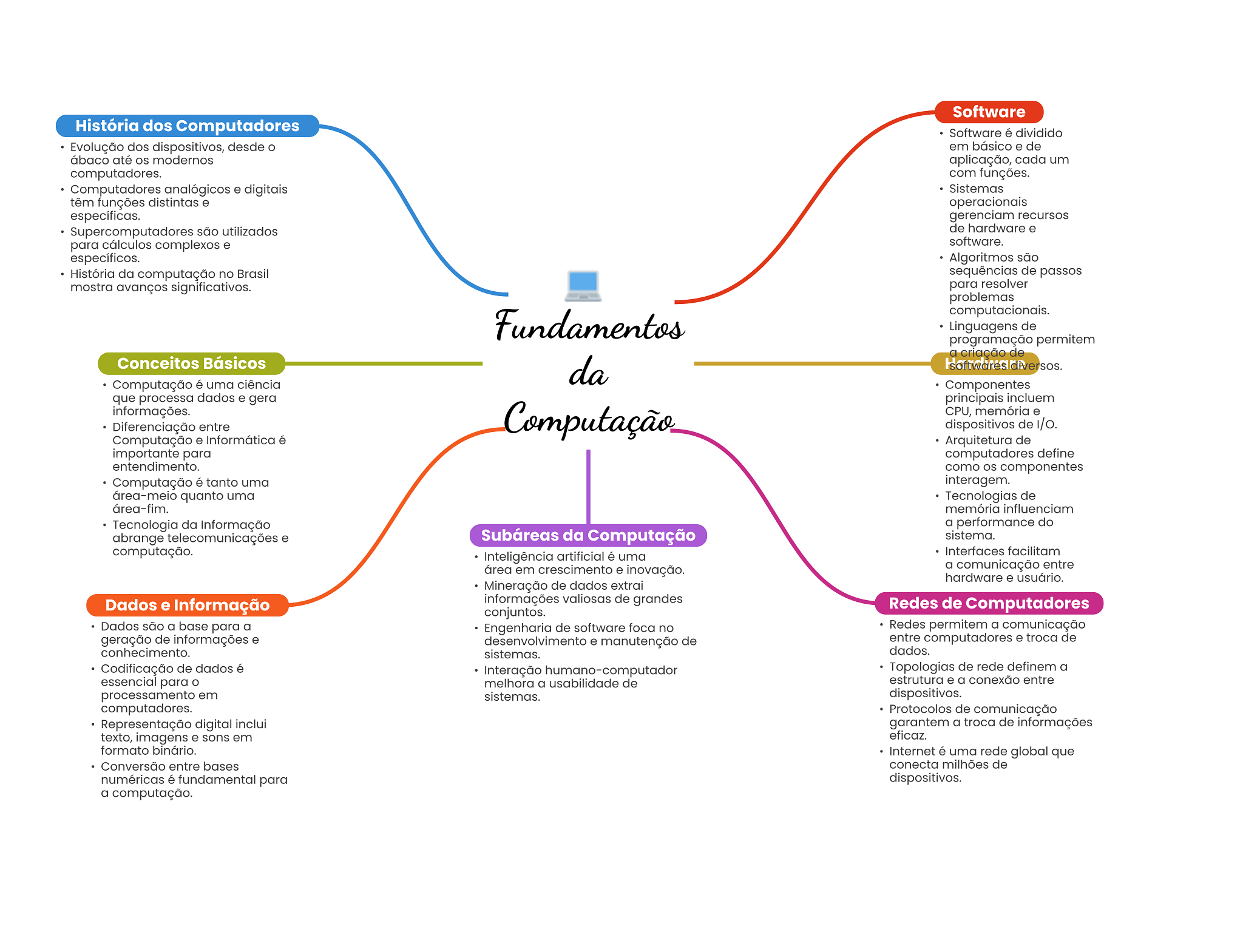 Software História dos Computadores Software é dividido Evolução dos dispositivos, desde em básico e de ábaco até OS modernos aplicação, cada um computadores. com funções. Computadores analógicos e digitais Sistemas têm funções distintas e operacionais específicas. gerenciam recursos Supercomputadores são utilizados de hardware e para cálculos complexos e software. específicos. Algoritmos são História da computação no Brasil sequências de passos mostra avanços significativos. para resolver problemas computacionais. Fundamentos Linguagens de programação permitem a criação de Conceitos Básicos da Computação é uma ciência Componentes que processa dados e gera principais incluem informações. Computação CPU, memória e Diferenciação entre dispositivos de Computação e Informática é Arquitetura de importante para computadores define entendimento. como componentes Computação é tanto uma interagem. área-meio quanto uma Tecnologias de área-fim. memória influenciam Tecnologia da Informação a performance do abrange telecomunicações e Subáreas da Computação sistema. computação. Inteligência artificial é uma Interfaces facilitam área em crescimento e inovação. a comunicação entre hardware e usuário. Mineração de dados extrai Dados e Informação informações valiosas de grandes Redes de Computadores conjuntos. Dados são a base para a Engenharia de software foca no Redes permitem a comunicação geração de informações e desenvolvimento e manutenção de entre computadores e troca de conhecimento. sistemas. dados. Codificação de dados é Interação humano-computador Topologias de rede definem a essencial para melhora a usabilidade de estrutura e a conexão entre processamento em sistemas. dispositivos. computadores. Protocolos de comunicação Representação digital inclui garantem a troca de informações texto, imagens e sons em eficaz. formato binário. Internet é uma rede global que Conversão entre bases conecta milhões de numéricas é fundamental para dispositivos. a computação.