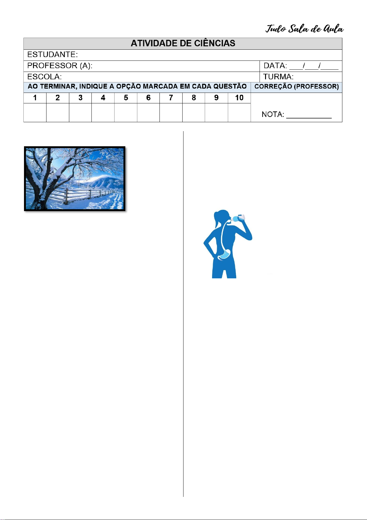 1. Observe a imagem abaixo e resolva à questão: Quando a neve da figura derreter, haverá uma mudança de estado físico. Marque a alternativa que representa essa mudança pela qual a água passará. a) Ebulição. b) Evaporação. c) Solidificação. d) Fusão. 2. Nuvem é um conjunto visível de partículas diminutas que se encontram em suspensão na atmosfera. Como são formadas as nuvens? a) São formadas pela evaporação da água que se condensa em forma de gotas. b) Pelos lagos que existem no alto das colinas e montanhas. c) São formadas pela fusão do gelo no alto das montanhas. d) Pela precipitação da água que escorre pelos bueiros. 3. A água é um recurso natural abundante no planeta, essencial para a existência e sobrevivência das diferentes formas de vida. Marque a opção que apresenta utilidades da água doce em nossa vida: a) apenas para a produção de alimentos industrializados. b) usamos água doce somente para a nossa higiene e para a limpeza do carro. c) usamos água doce na higiene, alimentação, irrigação, lazer e para fins industriais. d) usamos água doce apenas em nossa alimentação. 4. Quando a chuva cai, parte dela se infiltra no solo. Essa água que fica armazenada no subsolo formam os: a) lençóis freáticos. b) compostos minerais. c) poços artesianos. d) poços comuns. 5. Leia e complete: O corpo humano é formado em média por _____________ de água, que corresponde à metade do nosso peso. A alternativa que completa a frase acima é: a) 20%. b) 30%. c) 40%. d) 70%. 6. Beber muita água equilibra o nosso organismo. É recomendado que seja ingerido ao longo do dia: a) pelo menos 2 litros de água. b) bastante água quente para queimar as calorias. c) 2 litros de água de uma só vez. d) mais água gelada para refrescar o dia. 7. Dentre as principais funções da água no corpo humano, podemos destacar sua participação em reações químicas, no controle da temperatura do corpo e no transporte de nutrientes. Qual opção abaixo revela a presença de água no corpo humano? a) No crescimento das unhas. b) No couro cabeludo das crianças. c) No suor através de atividade física. d) No crescimento dos pelos. 8. “Os rins são responsáveis pela formação da urina, líquido que tem 95% de água em sua composição e que serve para eliminar resíduos inúteis para o organismo.” Essa informação diz respeito a que papel realizado pela água em nosso corpo? a) Circulação. b) Digestão. c) Salivação. d) Limpeza. 9. A importância da água do planeta é de tamanha proporção, já que é um elemento essencial para a sobrevivência de animais e vegetais na Terra, além de fazer parte de inúmeras atividades dos seres humanos. Complete as lacunas abaixo com a alternativa que contém as palavras corretas: " Quando sentimos ____________________ já estamos levemente ________________ ". a) sede, desidratados. b) desidratados, sede. c) fome, com sede. d) fome, desidratados. 10. Em relação à água, podemos afirmar que: a) é um recuso natural renovável. b) é um recurso natural não renovável. c) não é um recurso natural. d) só existe em estado líquido.