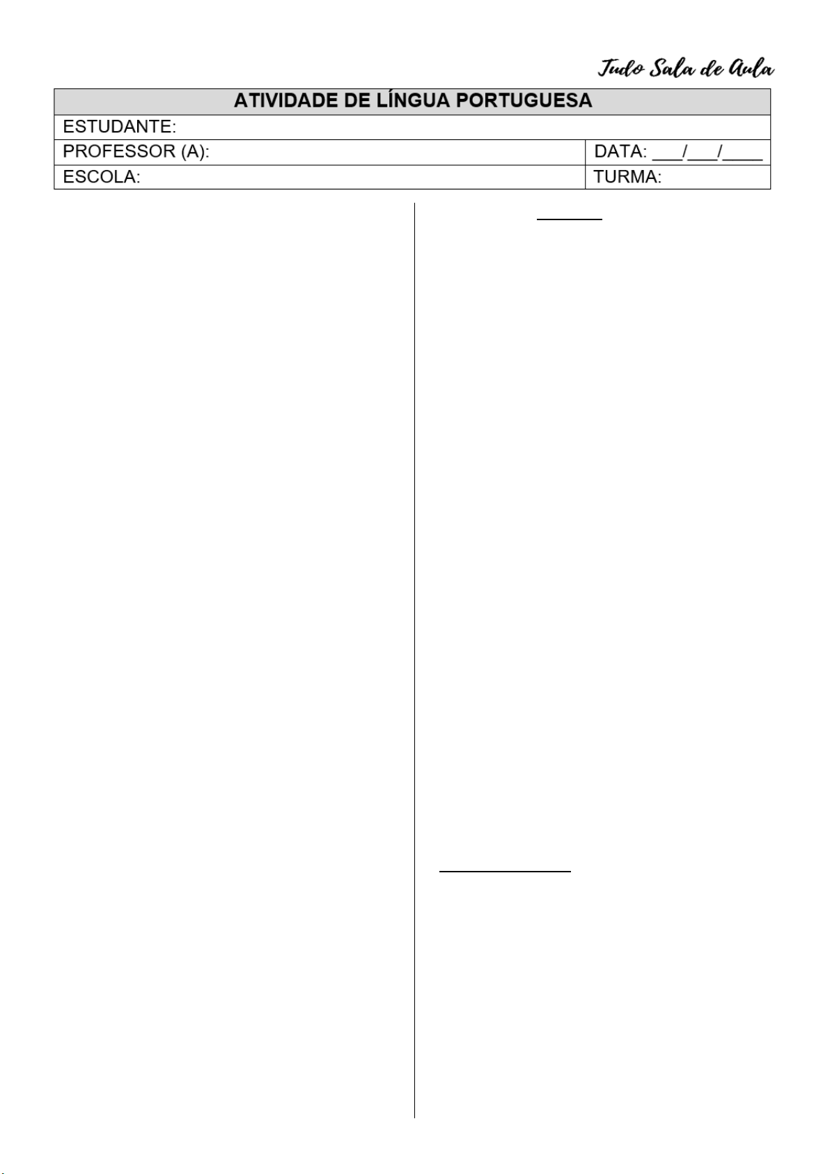 Leia o texto abaixo para responder às questões 1 – 10: A DÚVIDA Juliano Martinz Enquanto o avião perdia altitude, o cenário era de pânico absoluto. Ele ouvia gritos e preces ao seu redor. Alguns tentavam ligar o celular desesperadamente, provavelmente uma tentativa de enviar uma última mensagem para familiares e amigos. Eu te amo, adeus, eu não deveria ter dito aquilo. Todas aquelas frases que passam pela cabeça quando se sabe que serão as últimas. Da mesma forma, ele estava angustiado. A mesma angústia que o acompanhara desde o momento em que pegara o metrô, 3 horas atrás, rumo ao aeroporto. Antes que o avião se partisse em milhares de pedaços, sua angústia se resumia em uma única e persistente pergunta: — Será que eu desliguei o ferro de passar? Texto extraído do site corrosiva.com.br (Março/2021) 1. O gênero do texto é crônica. Isso se confirma porque o texto a) narra um fato do cotidiano vivido pelas pessoas. b) descreve uma história fictícia com enredo surreal. c) informa ao leitor sobre fatos recentes de interesse da população. d) transmite um ensinamento para o leitor. 2. Qual o tipo de narrador do texto? (Narrador personagem ou narrador observador) _______________________________________ _______________________________________ 3. Por que os passageiros estavam em pânico no avião? _______________________________________ _______________________________________ _______________________________________ 4. Segundo o texto, por que as pessoas tentavam usar o celular? _______________________________________ _______________________________________ 5. No trecho: “Enquanto o avião perdia altitude...”, a palavra grifada estabelece ideia de: a) lugar. b) modo. c) tempo. d) intensidade. 6. No texto, é possível identificar que algumas pessoas estavam arrependidas. O fato que provocou esse sentimento foi a) a mensagem do celular. b) o declínio do avião. c) a partida no aeroporto. d) a saudade dos parentes. 7. Localize no texto o fragmento que revela que de fato o avião cairá. _______________________________________ _______________________________________ _______________________________________ 8. Sobre o texto, assinale a alternativa CORRETA: a) As pessoas estavam desesperadas porque não conseguiam mandar mensagens. b) Os passageiros estavam aflitos porque o avião estava passando por uma simples turbulência. c) Os passageiros perceberam que o avião estava caindo logo no momento da decolagem. d) É possível concluir que um dos passageiros estava angustiado com uma situação diferente dos demais. 9. No trecho: “Alguns tentavam ligar o celular desesperadamente...”, a palavra grifada revela que as pessoas estavam a) precipitadas. b) alucinadas. c) enfurecidas. d) angustiadas. 10. Apesar do desespero dos personagens revelado pelo autor da crônica, o texto finaliza com um tom a) irônico. b) cômico. c) triste. d) melancólico.