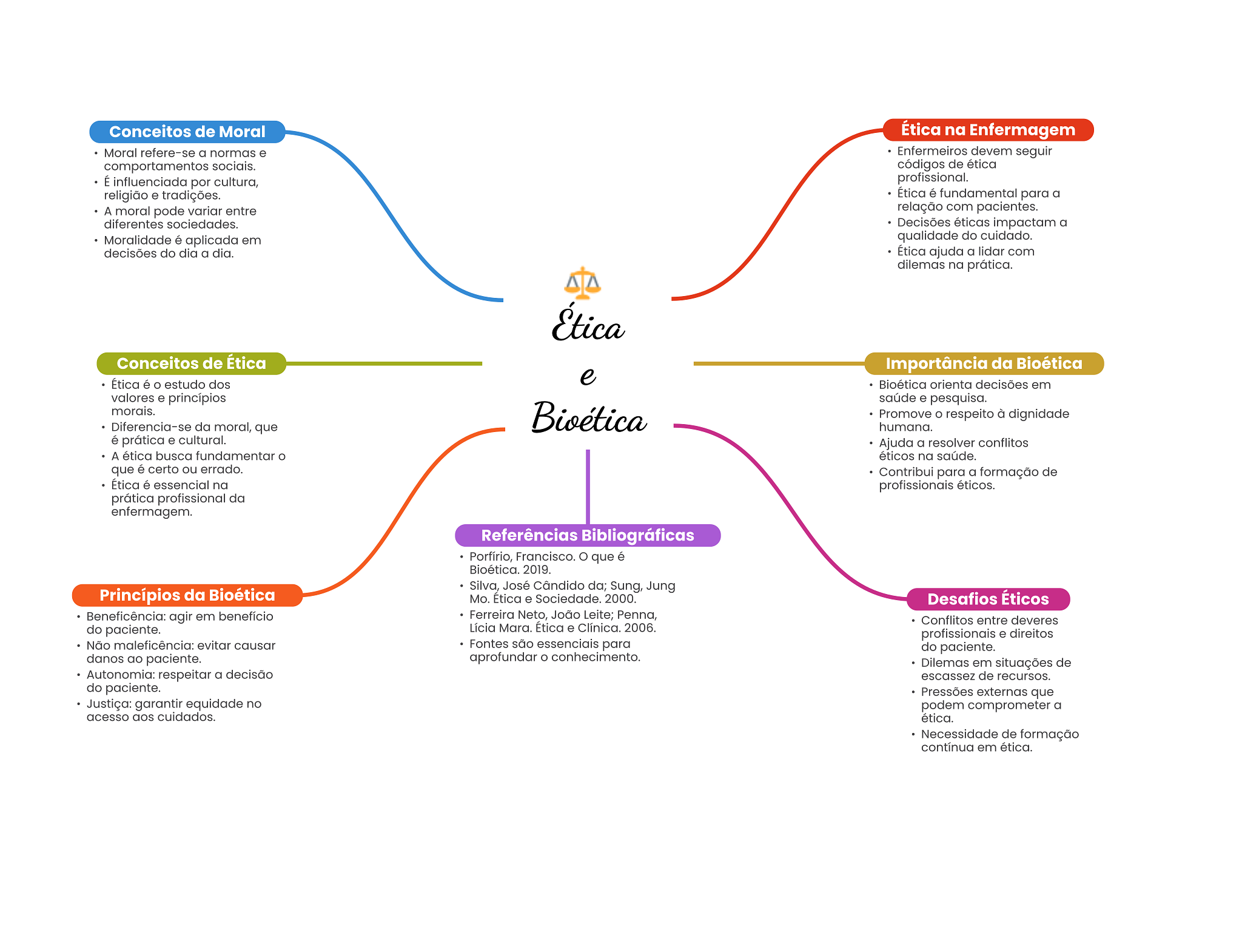 Conceitos de Moral Ética na Enfermagem Moral refere-se a normas e Enfermeiros devem seguir comportamentos sociais. códigos de ética É influenciada por cultura, profissional. religião e tradições. Ética é fundamental para a A moral pode variar entre relação com pacientes. diferentes sociedades. Decisões éticas impactam a Moralidade é aplicada em qualidade do cuidado. decisões do dia a dia. Ética ajuda a lidar com dilemas na prática. Ética Conceitos de Ética Importância da Bioética Ética é estudo dos e Bioética orienta decisões em valores e princípios saúde e pesquisa. morais. Bioética Promove respeito à dignidade Diferencia-se da moral, que humana. é prática e cultural. Ajuda a resolver conflitos A ética busca fundamentar O éticos na saúde. que é certo ou errado. Contribui para a formação de Ética é essencial na profissionais éticos. prática profissional da enfermagem. Referências Bibliográficas Porfírio, Francisco. que é Bioética. 2019. Silva, José Cândido da; Sung, Jung Princípios da Bioética Mo. Ética e Sociedade. 2000. Desafios Éticos Beneficência: agir em benefício Ferreira Neto, João Leite; Penna, Conflitos entre deveres do paciente. Lícia Mara. Ética e Clínica. 2006. profissionais e direitos Não maleficência: evitar causar Fontes são essenciais para do paciente. danos ao paciente. aprofundar conhecimento. Dilemas em situações de Autonomia: respeitar a decisão escassez de recursos. do paciente. Pressões externas que Justiça: garantir equidade no podem comprometer a acesso aos cuidados. ética. Necessidade de formação contínua em ética.