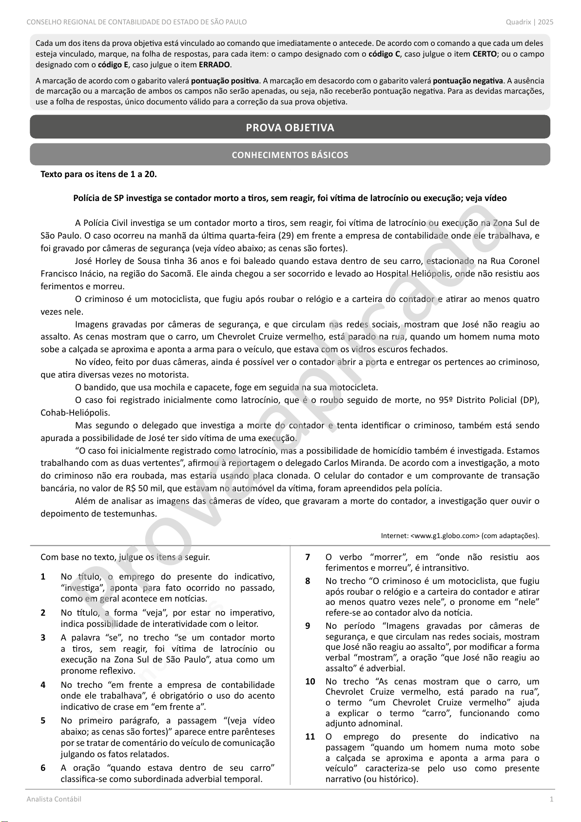 pcimarkpci MjgwNDowNTZjOmMyNTY6MGMwMDphNDA2OjVjOWI6NTI3OTplMGRj:RnJpLCAzMCBKYW4gMjAyNiAyMTowOTo1NCAtMDMwMA== www.pciconcursos.com.br Analista Contábil CONSELHO REGIONAL DE CONTABILIDADE DO ESTADO DE SÃO PAULO Quadrix | 2025 1 Cada um dos itens da prova objetiva está vinculado ao comando que imediatamente o antecede. De acordo com o comando a que cada um deles esteja vinculado, marque, na folha de respostas, para cada item: o campo designado com o código C, caso julgue o item CERTO; ou o campo designado com o código E, caso julgue o item ERRADO. A marcação de acordo com o gabarito valerá pontuação positiva. A marcação em desacordo com o gabarito valerá pontuação negativa. A ausência de marcação ou a marcação de ambos os campos não serão apenadas, ou seja, não receberão pontuação negativa. Para as devidas marcações, use a folha de respostas, único documento válido para a correção da sua prova objetiva. CONHECIMENTOS BÁSICOS PROVA OBJETIVA Texto para os itens de 1 a 20. Polícia de SP investiga se contador morto a tiros, sem reagir, foi vítima de latrocínio ou execução; veja vídeo A Polícia Civil investiga se um contador morto a tiros, sem reagir, foi vítima de latrocínio ou execução na Zona Sul de São Paulo. O caso ocorreu na manhã da última quarta‑feira (29) em frente a empresa de contabilidade onde ele trabalhava, e foi gravado por câmeras de segurança (veja vídeo abaixo; as cenas são fortes). José Horley de Sousa tinha 36 anos e foi baleado quando estava dentro de seu carro, estacionado na Rua Coronel Francisco Inácio, na região do Sacomã. Ele ainda chegou a ser socorrido e levado ao Hospital Heliópolis, onde não resistiu aos ferimentos e morreu. O criminoso é um motociclista, que fugiu após roubar o relógio e a carteira do contador e atirar ao menos quatro vezes nele. Imagens gravadas por câmeras de segurança, e que circulam nas redes sociais, mostram que José não reagiu ao assalto. As cenas mostram que o carro, um Chevrolet Cruize vermelho, está parado na rua, quando um homem numa moto sobe a calçada se aproxima e aponta a arma para o veículo, que estava com os vidros escuros fechados. No vídeo, feito por duas câmeras, ainda é possível ver o contador abrir a porta e entregar os pertences ao criminoso, que atira diversas vezes no motorista. O bandido, que usa mochila e capacete, foge em seguida na sua motocicleta. O caso foi registrado inicialmente como latrocínio, que é o roubo seguido de morte, no 95º Distrito Policial (DP), Cohab‑Heliópolis. Mas segundo o delegado que investiga a morte do contador e tenta identificar o criminoso, também está sendo apurada a possibilidade de José ter sido vítima de uma execução. “O caso foi inicialmente registrado como latrocínio, mas a possibilidade de homicídio também é investigada. Estamos trabalhando com as duas vertentes”, afirmou à reportagem o delegado Carlos Miranda. De acordo com a investigação, a moto do criminoso não era roubada, mas estaria usando placa clonada. O celular do contador e um comprovante de transação bancária, no valor de R$ 50 mil, que estavam no automóvel da vítima, foram apreendidos pela polícia. Além de analisar as imagens das câmeras de vídeo, que gravaram a morte do contador, a investigação quer ouvir o depoimento de testemunhas. Internet: (com adaptações). Com base no texto, julgue os itens a seguir. 1 No título, o emprego do presente do indicativo, “investiga”, aponta para fato ocorrido no passado, como em geral acontece em notícias. 2 No título, a forma “veja”, por estar no imperativo, indica possibilidade de interatividade com o leitor. 3 A palavra “se”, no trecho “se um contador morto a tiros, sem reagir, foi vítima de latrocínio ou execução na Zona Sul de São Paulo”, atua como um pronome reflexivo. 4 No trecho “em frente a empresa de contabilidade onde ele trabalhava”, é obrigatório o uso do acento indicativo de crase em “em frente a”. 5 No primeiro parágrafo, a passagem “(veja vídeo abaixo; as cenas são fortes)” aparece entre parênteses por se tratar de comentário do veículo de comunicação julgando os fatos relatados. 6 A oração “quando estava dentro de seu carro” classifica‑se como subordinada adverbial temporal. 7 O verbo “morrer”, em “onde não resistiu aos ferimentos e morreu”, é intransitivo. 8 No trecho “O criminoso é um motociclista, que fugiu após roubar o relógio e a carteira do contador e atirar ao menos quatro vezes nele”, o pronome em “nele” refere‑se ao contador alvo da notícia. 9 No período “Imagens gravadas por câmeras de segurança, e que circulam nas redes sociais, mostram que José não reagiu ao assalto”, por modificar a forma verbal “mostram”, a oração “que José não reagiu ao assalto” é adverbial. 10 No trecho “As cenas mostram que o carro, um Chevrolet Cruize vermelho, está parado na rua”, o termo “um Chevrolet Cruize vermelho” ajuda a explicar o termo “carro”, funcionando como adjunto adnominal. 11 O emprego do presente do indicativo na passagem “quando um homem numa moto sobe a calçada se aproxima e aponta a arma para o veículo” caracteriza‑se pelo uso como presente narrativo (ou histórico). Prova ap lica da pcimarkpci MjgwNDowNTZjOmMyNTY6MGMwMDphNDA2OjVjOWI6NTI3OTplMGRj:RnJpLCAzMCBKYW4gMjAyNiAyMTowOTo1NCAtMDMwMA== www.pciconcursos.com.br Analista Contábil CONSELHO REGIONAL DE CONTABILIDADE DO ESTADO DE SÃO PAULO Quadrix | 2025 2 12 No trecho “os vidros escuros fechados”, os dois adjuntos adnominais ligados ao substantivo diferenciam‑se pela natureza: um indica uma característica duradoura, enquanto o outro indica uma característica transitória. 13 No período “No vídeo, feito por duas câmeras, ainda é possível ver o contador abrir a porta e entregar os pertences ao criminoso, que atira diversas vezes no motorista.”, a oração “que atira diversas