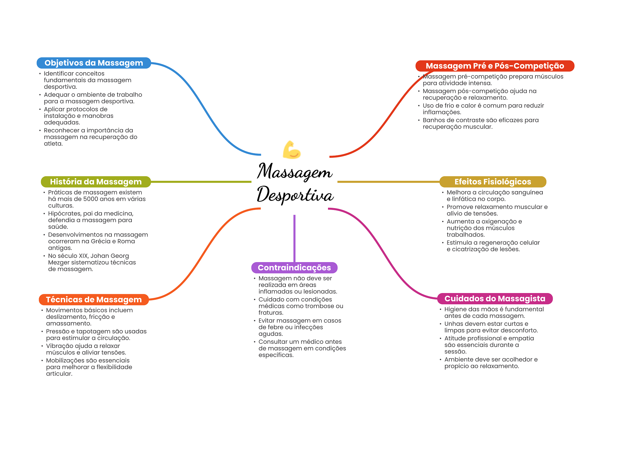 Objetivos da Massagem Massagem Pré e Pós-Competição Identificar conceitos Massagem pré-competição prepara músculos fundamentais da massagem para atividade intensa. desportiva. Massagem pós-competição ajuda na Adequar ambiente de trabalho recuperação e relaxamento. para a massagem desportiva. Uso de frio e calor é comum para reduzir Aplicar protocolos de instalação e manobras inflamações. adequadas. Banhos de contraste são eficazes para Reconhecer a importância da recuperação muscular. massagem na recuperação do atleta. Massagem História da Massagem Efeitos Fisiológicos Práticas de massagem existem Desportiva Melhora a circulação sanguínea há mais de 5000 anos em várias e linfática no corpo. culturas. Promove relaxamento muscular e Hipócrates, pai da medicina, alívio de tensões. defendia a massagem para Aumenta a oxigenação e saúde. nutrição dos músculos Desenvolvimentos na massagem trabalhados. ocorreram na Grécia e Roma Estimula a regeneração celular antigas. e cicatrização de lesões. No século XIX, Johan Georg Mezger sistematizou técnicas de massagem. Contraindicações Massagem não deve ser realizada em áreas inflamadas ou lesionadas. Técnicas de Massagem Cuidado com condições Cuidados do Massagista médicas como trombose ou Movimentos básicos incluem fraturas. Higiene das mãos é fundamental deslizamento, fricção e antes de cada massagem. amassamento. Evitar massagem em casos Unhas devem estar curtas e de febre ou infecções Pressão e tapotagem são usadas agudas. limpas para evitar desconforto. para estimular a circulação. Consultar um médico antes Atitude profissional e empatia Vibração ajuda a relaxar são essenciais durante a de massagem em condições músculos e aliviar tensões. sessão. específicas. Mobilizações são essenciais Ambiente deve ser acolhedor e para melhorar a flexibilidade propício ao relaxamento. articular.