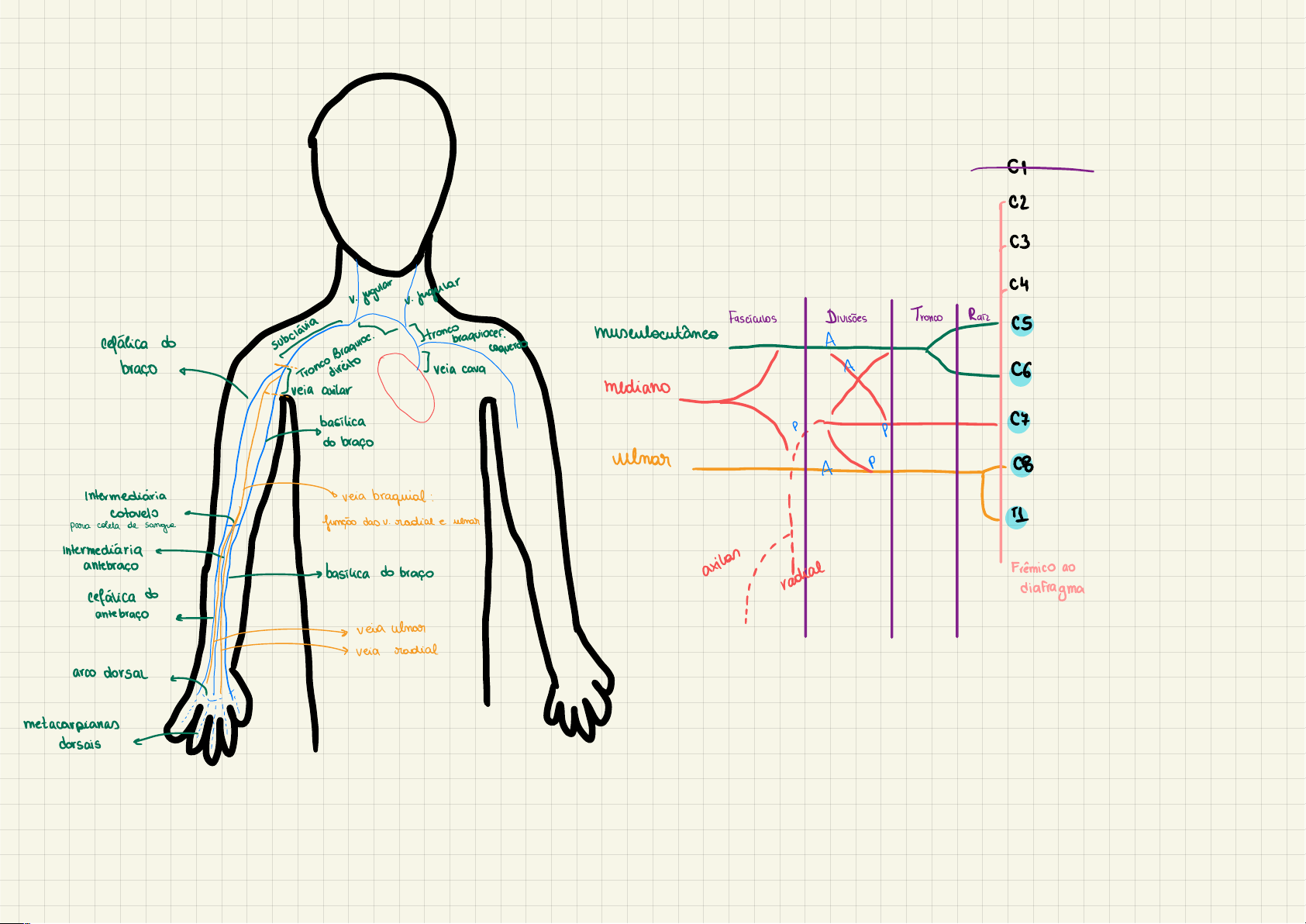 F +02 C3 Fascículos Divisões Tronco Raiz C5 musculacutandoA O E P 2 mediano -C7 -COM C4 i Lis Intermediária antebraço radial Frêmico ap diafragma VEIAS DO MEMBRO SUPERIOR 01 - as principais veias superficiais do membro superior são as veias . 1 - cefálica 2 - basílica - originam-se no dorso da mão a partir da rede venosa dorsal. Além das Referidas Veias : - as veias perfurantes formam comunicação entre o sistema - superficial - profundo 1 - Veia Cefálica - ascende no subcutâneo a partir da face lateral da rede venosa dorsal, prossegue na margem lateral do punho. - comunica-se com a veia intermédia do cotovelo na fossa cubital. - superiormente segue entre os músculos : - deltóide que forma o sulco deltopeitoral - peitoral maior - entra no trígono clavipeitoral (peitoral maior + deltóide + clavícula) e perfura a membrana costocoracóide acima do peitoral menor une-se a parte terminal da veia axilar. sulco deltapeitoral clavideltapeitoral feblotomia = acesso venoso 2 - Veia Basílica 02 - ascende no subcutâneo a partir da extremidade medial da rede venosa dorsal na face medial do antebraço e parte inferior do braço no sulco bicepital medial. - segue : 1 - perfura a fáscia do braço 2 – seguindo paralela a A.Braquial e nervo cutâneo medial 3 – no 1/3 médio do braço, recebe as veias braquiais. - torna-se V. axilar na borda inferior do músculo redondo maior - Veia Intermédia do Antebraço - altamente variável. 1 – início base do dorso do polegar 2 – ascendente pela face anterior do antebraço - entre : - cefálica - basílica - Veia Intermédia do Cotovelo - passa oblíquamente na fossa cubital - une as veias : - veia basílica - veia cefálica - no membro superior as veias profundas são duplas com exceção do V. axilar. veia cava superior = jugular + subclávia são veias duplas -> a veia axilar é única - acompanha as artérias e tem o mesmo nome destas. 03 - portanto não há necessidade em desenvolve-las. - Veia Axilar 1 – inicia-se na junção da V. basílica com as V.V braquiais, na borda distal do M.redondo maior. 2 – termina na borda lateral da 1ª. Costela. VASOS LINFÁTICOS DO MEMBRO SUPERIOR - origina-se do plexos linfáticos da : 1 – da pele dos dedos 2 – palma 3 – dorso da mão - ascendem superficialmente com as veias. - cefálica - basílica - alguns vasos da basílica entram em linfonodos cubitais acima do epicôndilo medial. - ascendem e comunicam-se com linfonodos. 1 – axilares umerais 2 – axilares peitorais 3 – linfonodos deltopeitorais - depois para o tronco subclávico ducto linfático direito quando aneia basílica passa o M. redando maior , vira veia axilar face inferior da clavícula -> forma a V. subclávia INERVAÇÃO DO MEMBRO SUPERIOR 04 - é feita pelo plexo braquial. - é formada por raízes nervosas que saem dos forames invertebrais, - origem das raízes : - C5 - C6 - C7 - C8 - T1 - são : - 5 raízes ( C5, C6, C7, C8 e T1) - 3 troncos ( superior, médio e inferior ) - 3 divisões ( anteriores e 3 posteriores ) - 3 fascículos ( lateral, posterior e medial ) - são ramos terminais - RAMOS TERMINAIS - são 4 : - nervo musculocutâneo (C5, C6 e C 7 ) - nervo axilar ( C5,C6 ) - nervo radial ( C5, C6, C7, C8 e T1 ) - nervo ulnar ( C7, C8 e T1 ) todas as raízes 1º. Nervos Musculcutâneo 05 - perfura o m.coracobraquial, segue entre o bíceps e o braquial - emerge no cotovelo como nervo cutâneo lateral do antebraço. - inerva os músculos : - coracobraquial - braquial - bíceps braquial - o nervo cutâneo lateral do antebraço inerva a pele da região ântero lateral do antebraço. 2º. Nervo Axilar - possue fibras de C5 e C6 com origem no fascículo posterior do plexo braquial - contorna o colo cirúrgico do úmero. - no espaço quadrangular : - n. axilar - a.circunflexa posterior do úmero. - inerva os músculos : - deltóide - redondo menor - emite um ramo N. cutâneo braquial lateral superior para a pele que recobre o deltóide. sensitivo 3º. Nervo Radial 06 - ramo terminal do fascículo posterior do plexo braquial - origem : 1 - posterior a a. axilar 2- anterior ao m. subescapular - passa para o compartimento posterior dos músculos do braço pelo intervalo triangular. - intervalo triangular formado pelo : 1 – margem inferior do m. redondo maior 2 – borda lateral da cabeça longa do bíceps braquial 3 – borda medial do úmero - é acompanhado pela artéria braquial profunda. - inerva todos os músculos do compartimento posterior 1 – braço 2 – antebraço Da Sensibilidade - a pele da parte posterior do braço e antebraço e parte lateral do dorso da mão 1 - polegar 2 - index 3 - médio 4 - metade do anular tríceps um 4º. Nervo Ulnar 07 - desce medialmente ao nervo mediano em direção ao sulco existente entre : - epicôndilo medial sulco do N. Ulnar - olecrano - depois percorre a margem medial do antebraço para atingir a região hipotenar. - inerva os músculos : 1 – flexor ulnar do carpo 2 – músculos da região hipotenar 3 – interósseos da mão 4 – adutor do polegar AS FIBRAS SENSITIVAS - distribuem-se a cútis da região medial da mão. - fibras sensitivas para : - face palmar - face dorsal - dedo mínimo e metade do anular. NERVO MEDIANO 08 - situado lateralmente a A.braquial e posteriormente a margem medial do bíceps braquial. - atinge a fossa cubital , passando entre : 1 – flexor superficial 2 – flexor profundo dos dedos - Passa : 1 – sob o retináculo 2 – sobre os tendões dos flexores - na palma da mão é coberto somente pela pele e aponeurose palmar. - Ramos : - não há acima da articulação do cotovelo. - Inervação Motora - inerva a maioria dos músculos anteriores do antebraço, exeto : 1 – flexor ulnar do carpo 2 – metade lateral do m.flexor profundo dos dedos. - estes são inervados pelo N. ulnar. - na mão passa sob o retináculo dos flexores e inerva 09 1 – abdutor curto do polegar 1 – músculo tenares 2 – oponente do polegar 3 – flexor curto 