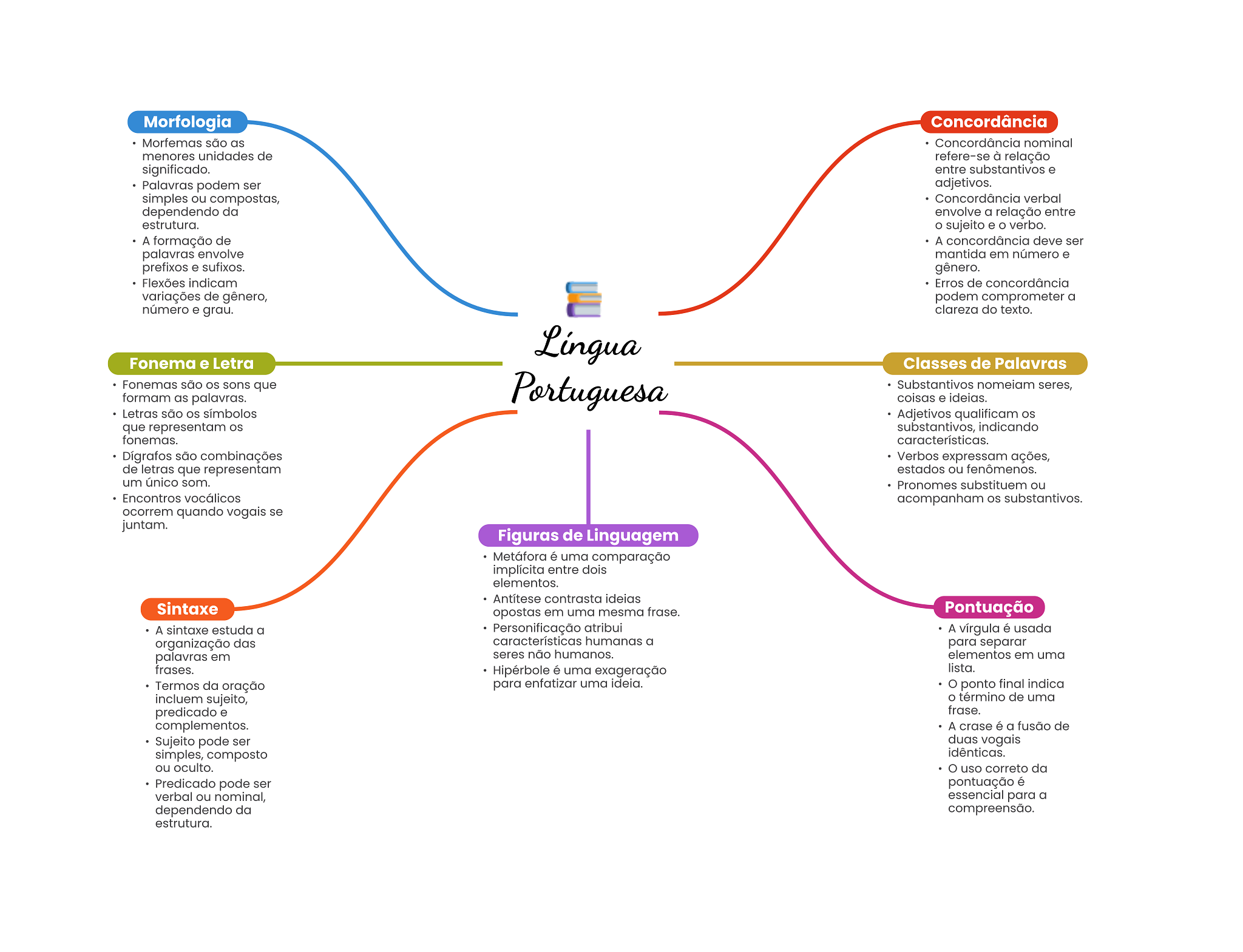 Morfologia Concordância Morfemas são as Concordância nominal menores unidades de refere-se à relação significado. entre substantivos e Palavras podem ser adjetivos. simples ou compostas, Concordância verbal dependendo da envolve a relação entre estrutura. sujeito e verbo. A formação de A concordância deve ser palavras envolve mantida em número e prefixos e sufixos. gênero. Flexões indicam Erros de concordância variações de gênero, podem comprometer a número e grau. clareza do texto. Língua Fonema e Letra Classes de Palavras Fonemas são OS sons que formam as palavras. Portuguesa Substantivos nomeiam seres, coisas e ideias. Letras são OS símbolos Adjetivos qualificam OS que representam OS substantivos, indicando fonemas. características. são combinações Verbos expressam ações, de letras que representam estados ou fenômenos. um único som. Pronomes substituem ou Encontros vocálicos acompanham substantivos. ocorrem quando vogais se juntam. Figuras de Linguagem Metáfora é uma comparação implícita entre dois elementos. Antítese contrasta ideias Sintaxe opostas em uma mesma frase. Pontuação A sintaxe estuda a Personificação atribui A vírgula é usada organização das características humanas a para separar palavras em seres não humanos. elementos em uma frases. Hipérbole é uma exageração lista. Termos da oração para enfatizar uma ideia. O ponto final indica incluem sujeito, término de uma predicado e frase. complementos. A crase é a fusão de Sujeito pode ser duas vogais simples, composto idênticas. ou oculto. uso correto da Predicado pode ser pontuação é verbal ou nominal, essencial para a dependendo da compreensão. estrutura.