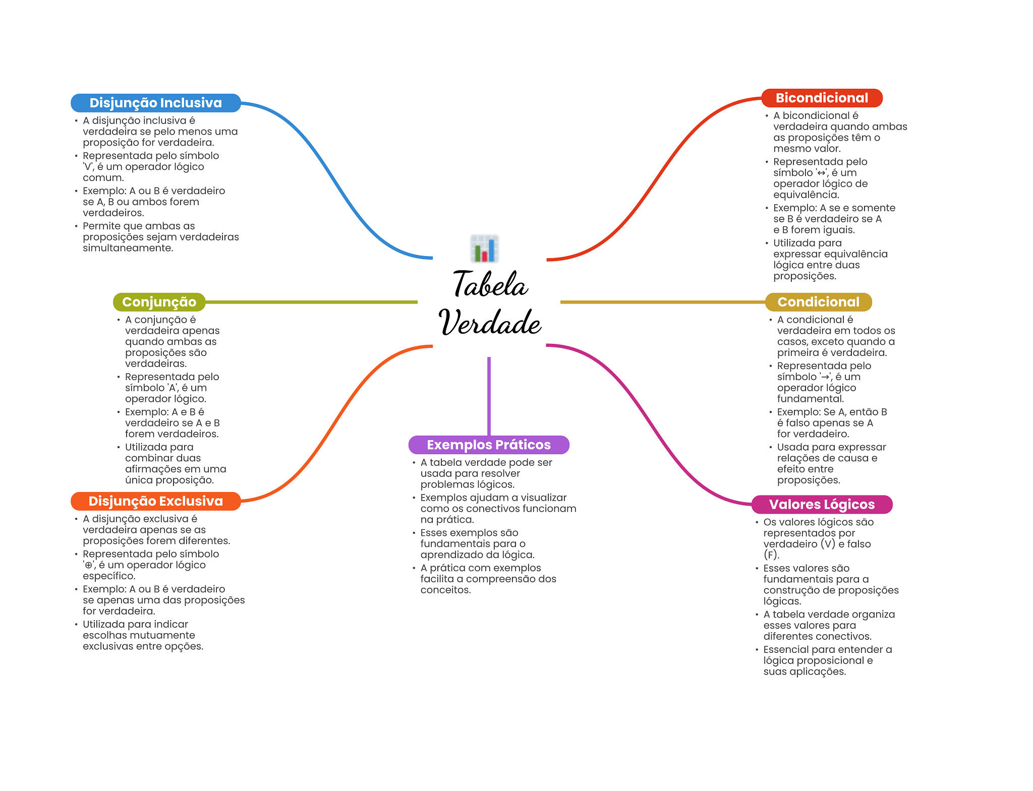 Disjunção Inclusiva Bicondicional A bicondicional é A disjunção inclusiva é verdadeira se pelo menos uma verdadeira quando ambas proposição for verdadeira. as proposições têm O mesmo valor. Representada pelo símbolo 'V', é um operador lógico Representada pelo símbolo é um comum. operador lógico de Exemplo: A ou é verdadeiro equivalência. se A, ou ambos forem verdadeiros. Exemplo: A se e somente se B é verdadeiro se A Permite que ambas as e forem iguais. proposições sejam verdadeiras simultaneamente. Utilizada para expressar equivalência lógica entre duas Tabela proposições. Conjunção Condicional A conjunção é verdadeira apenas Verdade A condicional é verdadeira em todos quando ambas as casos, exceto quando a proposições são primeira é verdadeira. verdadeiras. Representada pelo Representada pelo símbolo é um símbolo 'A', é um operador lógico operador lógico. fundamental. Exemplo: A e é Exemplo: Se então verdadeiro se A e é falso apenas se A forem verdadeiros. for verdadeiro. Utilizada para Exemplos Práticos Usada para expressar combinar duas A tabela verdade pode ser relações de causa e afirmações em uma efeito entre usada para resolver única proposição. problemas lógicos. proposições. Disjunção Exclusiva Exemplos ajudam a visualizar como conectivos funcionam Valores Lógicos A disjunção exclusiva é na prática. Os valores lógicos são verdadeira apenas se as Esses exemplos são representados por proposições forem diferentes. fundamentais para verdadeiro (v) e falso Representada pelo símbolo aprendizado da lógica. (F). '+', é um operador lógico A prática com exemplos Esses valores são específico. facilita a compreensão dos fundamentais para a Exemplo: A ou é verdadeiro conceitos. construção de proposições se apenas uma das proposições lógicas. for verdadeira. A tabela verdade organiza Utilizada para indicar esses valores para escolhas mutuamente diferentes conectivos. exclusivas entre opções. Essencial para entender a lógica proposicional e suas aplicações.