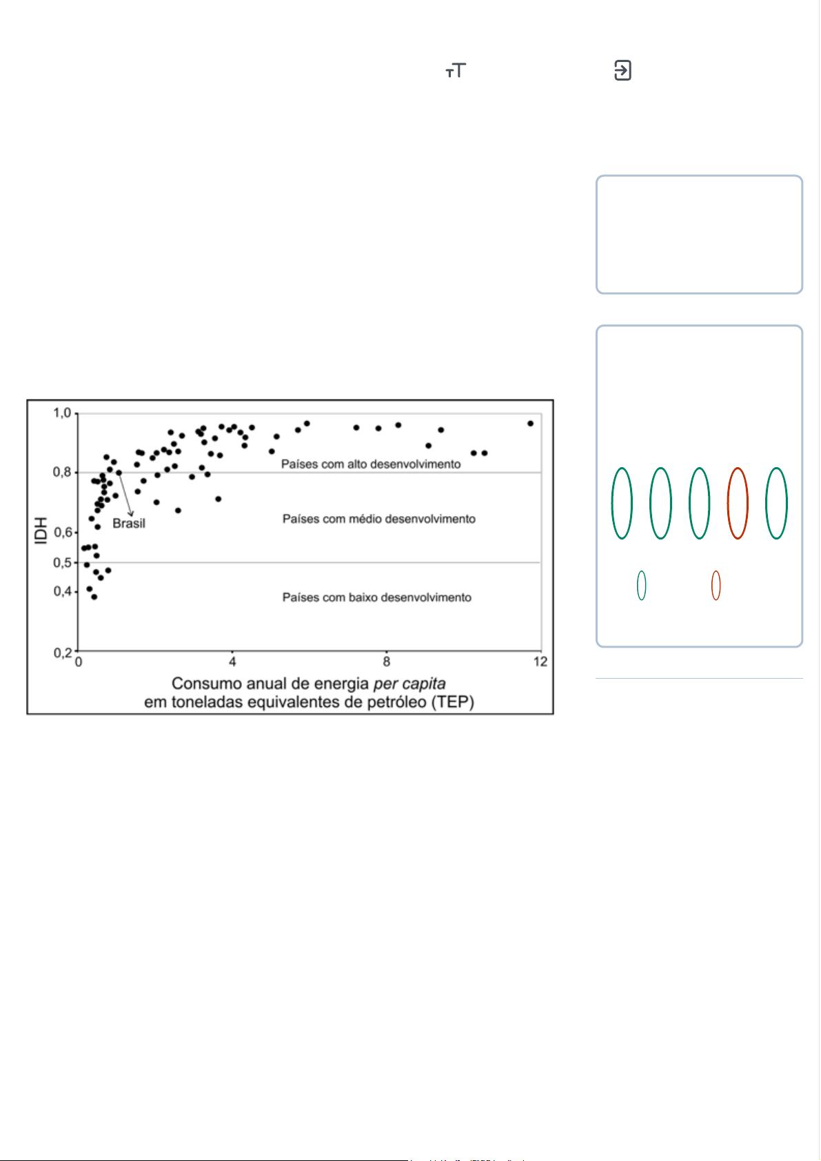 Questão 3 Correta O Índice de Desenvolvimento Humano (IDH) é um indicador da qualidade de vida das pessoas, baseado em três pilares: renda, saúde e educação. Alguns teóricos relacionam o IDH com o consumo de energia de um país, conforme indicado no gráfico a seguir, que relaciona o índice de desenvolvimento humano com o consumo de energia per capita em toneladas equivalentes de petróleo. A respeito do gráfico, analise as afirmativas a seguir. I. Países com alto grau de desenvolvimento são os maiores consumidores per capita de energia. II. É uma tendência mundial que países menos desenvolvidos disponham de menos tecnologia para exploração de fontes alternativas de energia e, portanto, consumam uma maior quantidade de energia per capita. III. Acordos mundiais para redução de gases do efeito estufa devem ser direcionados principalmente aos países com IDH elevado. Após análise das afirmativas de I até III apresentadas acima, marque a resposta correta. Pontuação / Questões realizadas: 3 de 5 1 2 3 4 5 Acertou Errou Anterior Próximo Correção do exercício da unidade Tamanho da fonte Sair da correção Sua resposta Correta Apenas I e III estão corretas. Comentário Clique aqui para escrever porque a alternativa A é incorreta (se aplicável)...