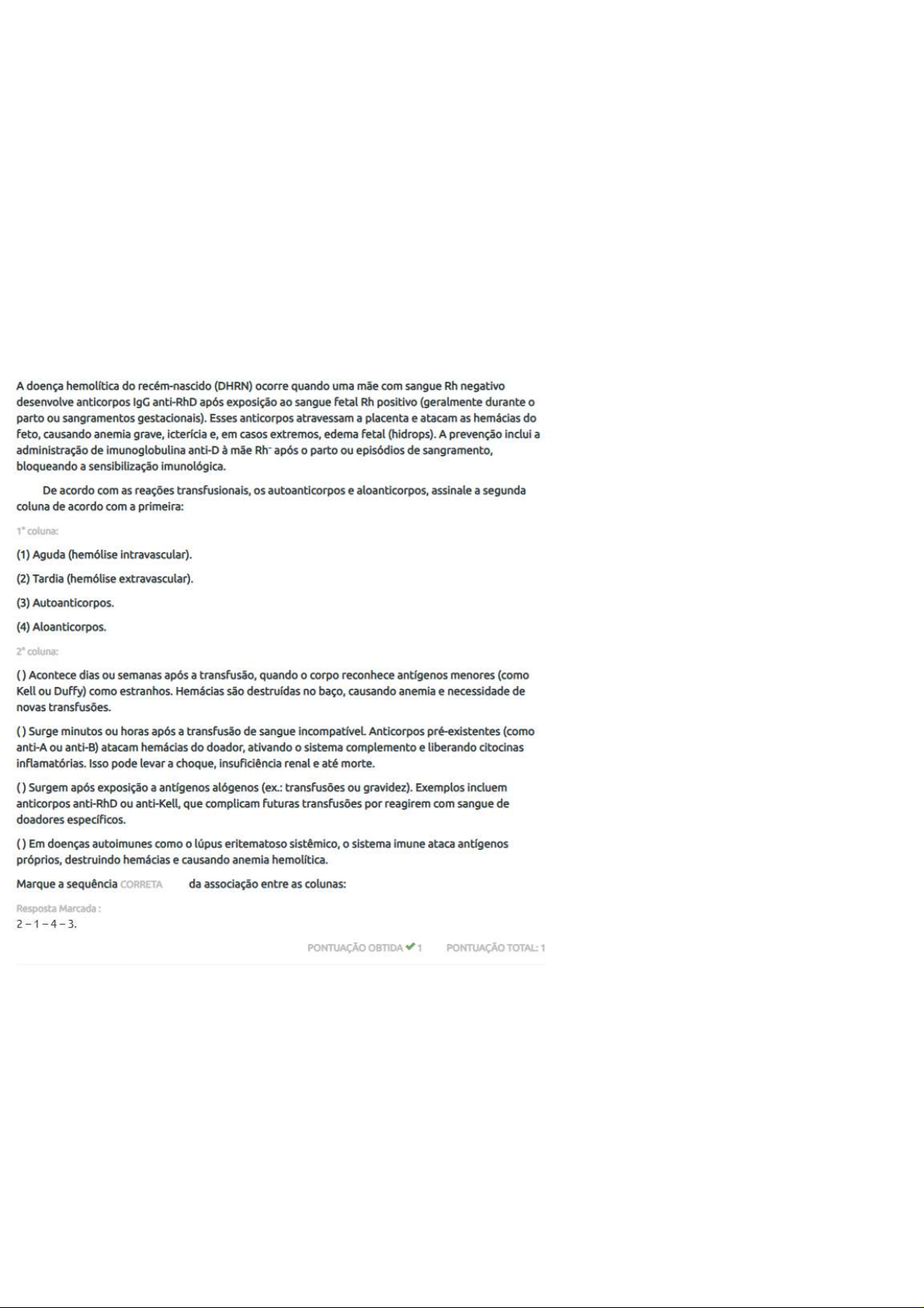 A doença hemolítica do recém-nascido (DHRN) ocorre quando uma mãe com sangue Rh negativo desenvolve anticorpos IgG anti-RhD após exposição ao sangue fetal Rh positivo (geralmente durante o parto ou sangramentos gestacionais). Esses anticorpos atravessam a placenta e atacam as hemácias do feto, causando anemia grave, icterícia e, em casos extremos, edema fetal (hidrops). A prevenção inclui a administração de imunoglobulina anti-D à mãe Rh- após o parto ou episódios de sangramento, bloqueando a sensibilização imunológica. De acordo com as reações transfusionais, os autoanticorpos e aloanticorpos, assinale a segunda coluna de acordo com a primeira: (1) Aguda (hemólise intravascular). (2) Tardia (hemólise extravascular). (3) Autoanticorpos. (4) Aloanticorpos. coluna: () Acontece dias ou semanas após a transfusão, quando corpo reconhece antígenos menores (como Kell ou Duffy) como estranhos. Hemácias são destruídas no baço, causando anemia e necessidade de novas transfusões. () Surge minutos ou horas após a transfusão de sangue incompatível. Anticorpos pré-existentes (como anti-A ou anti-B) atacam hemácias do doador, ativando sistema complemento e liberando citocinas inflamatórias. Isso pode levar a choque, insuficiência renal e até morte. () Surgem após exposição a antígenos alógenos (ex.: transfusões ou gravidez). Exemplos incluem anticorpos anti-RhD ou anti-Kell, que complicam futuras transfusões por reagirem com sangue de doadores específicos. () Em doenças autoimunes como lúpus eritematoso sistêmico, sistema imune ataca antígenos próprios, destruindo hemácias e causando anemia hemolítica. Marque a sequência CORRETA da associação entre as colunas: Resposta Marcada 2-1-4-3. PONTUAÇÃO OBTIDA 1 PONTUAÇÃO TOTAL: 1Os bancos de sangue implementam sistemas de qualidade documentados e supervisionados por representantes designados, com avaliações periódicas de eficácia pela gestão. De acordo com controle de qualidade em bancos de sangue, marque a alternativa CORRETA : Resposta Marcada Testes laboratoriais seguem protocolos validados, incluindo determinação de grupo ABO/Rh, triagem para doenças transmissíveis (como HIV, hepatites e sífilis) e detecção de anticorpos irregulares. PONTUAÇÃO OBTIDA 1 PONTUAÇÃO TOTAL: 1 Referente ao metabolismo dos eritrócitos e biossíntese da hemoglobina, marque a alternativa INCORRETA : Resposta Marcada Os eritrócitos humanos, células especializadas no transporte de nutrientes e óxido de nitrogênio, possuem características únicas que sustentam seu funcionamento. PONTUAÇÃO OBTIDA 1 PONTUAÇÃO TOTAL: 1 Distúrbios genéticos que afetam a hemoglobina, proteína dos glóbulos vermelhos responsável por carregar oxigênio, dividem-se em dois grupos principais: hemoglobinopatias, marcadas por mudanças na estrutura da molécula, e talassemias, caracterizadas por redução ou ausência na produção das cadeias de globina. Sobre hemoglobinopatias e talassemias, analise as seguintes assertivas: I Mutações nos genes das cadeias de globina geram hemoglobinas variantes, com propriedades diferentes da hemoglobina comum (HbA). II Frequente em populações de ascendência europeia, a anemia falciforme ocorre por uma multiplicação no gene da cadeia ácido glutâmico na posição 6 é trocado por valina (B6Glu-Val). III A menor e a a-talassemia menor manifestam macrocitose e hipercromia no hemograma, características também presentes na deficiência de sódio. IV As talassemias decorrem de falhas na síntese de cadeias de globina, causando na formação da hemoglobina. Assinale a alternativa que reúne as assertivas CORRETAS : Resposta Marcada Apenas e IV.Os células nucleadas do sangue, apresentam variações morfológicas e funções especializadas no sistema Distribuem-se em duas grandes categorias: células do sistema imune (macrófagos, neutrófilos, células dendríticas, eosinófilos, basófilos e células NK) e células do sistema imune (linfócitos T e B). Essa divisão reflete diferenças na origem, atividades e mecanismos de ação. As palavras que completam, corretamente, as lacunas são: Resposta Marcada : Leucócitos, imunológico, inato, adaptativo. PONTUAÇÃO OBTIDA 1 PONTUAÇÃO TOTAL: 1 Ocorre principalmente na medula óssea vermelha em adultos, mas durante desenvolvimento embrionário e fetal, outros órgãos como fígado e baço contribuem temporariamente. Esse processo se refere a: Resposta Marcada : Hematopoese. PONTUAÇÃO OBTIDA 1 PONTUAÇÃO TOTAL: 1 As leucemias representam um grupo heterogêneo de neoplasias hematológicas caracterizadas pela ocorrência descontrolada de células hematopoiéticas anormais, comprometendo a produção de células sanguíneas normais. Sobre leucemias agudas e crônicas, marque a alternativa INCORRETA : Resposta Marcada : A fisiopatologia das leucemias está relacionada a mutações congênitas que afetam a analogia, apoptose e controle imunológico das células hematopoiéticas. PONTUAÇÃO OBTIDA 1 PONTUAÇÃO TOTAL: 1 É um exame laboratorial que avalia os componentes do sangue, como eritrócitos, leucócitos e plaquetas, fornecendo informações detalhadas sobre a saúde do paciente. Por meio de qual exame avalia-se os componentes do sangue? Resposta Marcada : Hemograma.AVALIAÇÃO HEMATOLOGIA LABORATORIAL A hematologia laboratorial é um ramo da medicina dedicado ao estudo do sangue, dos órgãos hematopoéticos e das doenças relacionadas. De acordo com os conceitos básicos de hematologia laboratorial, marque V para as alternativas verdadeiras e F para as alternativas falsas. sangue, um tecido líquido que circula por todo exerce funções como transporte de oxigênio, defesa imunológica e regulação da coagulação. trombopoetina, processo de formação das células sanguíneas, ocorre principalmente na medula óssea, onde células-tronco trombocitose (CTH) se autorrenovam e diferenciam em linhagens mieloides (eritrócitos, p