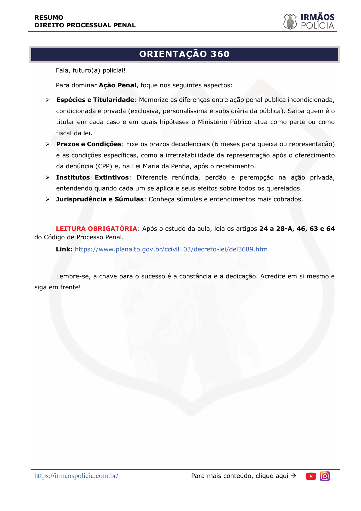 RESUMO DIREITO PROCESSUAL PENAL https://irmaospolicia.com.br/ Para mais conteúdo, clique aqui ORIENTAÇÃO 360 Fala, futuro(a) policial! Para dominar Ação Penal, foque nos seguintes aspectos: Espécies e Titularidade: Memorize as diferenças entre ação penal pública incondicionada, condicionada e privada (exclusiva, personalíssima e subsidiária da pública). Saiba quem é o titular em cada caso e em quais hipóteses o Ministério Público atua como parte ou como fiscal da lei. Prazos e Condições: Fixe os prazos decadenciais (6 meses para queixa ou representação) e as condições específicas, como a irretratabilidade da representação após o oferecimento da denúncia (CPP) e, na Lei Maria da Penha, após o recebimento. Institutos Extintivos: Diferencie renúncia, perdão e perempção na ação privada, entendendo quando cada um se aplica e seus efeitos sobre todos os querelados. Jurisprudência e Súmulas: Conheça súmulas e entendimentos mais cobrados. LEITURA OBRIGATÓRIA: Após o estudo da aula, leia os artigos 24 a 28-A, 46, 63 e 64 do Código de Processo Penal. Link: https://www.planalto.gov.br/ccivil_03/decreto-lei/del3689.htm Lembre-se, a chave para o sucesso é a constância e a dedicação. Acredite em si mesmo e siga em frente! Licenciado para Natália Rodrigues Cavalcante CPF 057.945.631-50, celular (61) 986539364 - Protegido por Irmãos Polícia RESUMO DIREITO PROCESSUAL PENAL https://irmaospolicia.com.br/ Para mais conteúdo, clique aqui AÇÃO PENAL A ação penal é o instrumento por meio do qual o Estado leva ao Poder Judiciário a pretensão de aplicar a lei penal ao autor de uma infração. Ela se desenvolve a partir do momento em que já existe um mínimo de prova sobre a ocorrência do crime e indícios da autoria, e sempre deve respeitar as regras previstas na Constituição e no Código de Processo Penal. CONDIÇÕES DA AÇÃO PENAL Para que o juiz aceite a ação penal, o titular deve demonstrar que estão presentes quatro requisitos básicos: 1. Possibilidade jurídica do pedido – significa que a conduta descrita se enquadra em um tipo penal previsto em lei. Não se propõe ação penal para fatos atípicos. 2. Interesse de agir – o processo deve ser útil e necessário; não se aciona o Judiciário se já há solução extrajudicial adequada. 3. Legitimação para agir – só quem a lei autoriza pode propor (ex.: Ministério Público para ações públicas, ofendido ou representante legal para privadas). 4. Justa causa – é o lastro probatório mínimo, normalmente formado no inquérito, que demonstre materialidade do crime e indícios de autoria. o Prova mínima é indispensável: instaurar um processo penal sem isso é abuso. o Nos crimes de lavagem de dinheiro, há a chamada justa causa duplicada, pois é preciso indício não só do crime de lavagem, mas também do crime antecedente. PRINCÍPIOS QUE REGEM A AÇÃO PENAL AÇÃO PENAL PÚBLICA 1. Obrigatoriedade (ou Legalidade): Sempre que presentes indícios de autoria e prova da materialidade, o MP deve propor a ação penal, sem avaliar conveniência ou oportunidade. o Exceções previstas em lei: transação penal, ANPP e hipóteses de arquivamento. 2. Oficialidade: A persecução penal é conduzida por órgãos oficiais do Estado (polícia, MP), e não por particulares. 3. Indisponibilidade: Iniciada a ação penal pública, o MP não pode desistir ou "abandonar" o processo, mesmo que a vítima concorde. 4. Divisibilidade: O MP pode denunciar apenas alguns autores ou alguns crimes, desde que justifique (diferente da ação privada, que é indivisível). Licenciado para Natália Rodrigues Cavalcante CPF 057.945.631-50, celular (61) 986539364 - Protegido por Irmãos Polícia RESUMO DIREITO PROCESSUAL PENAL https://irmaospolicia.com.br/ Para mais conteúdo, clique aqui AÇÃO PENAL PRIVADA 1. Disponibilidade: O querelante (ofendido) pode desistir ou abrir mão da ação (renúncia, perdão), pois a iniciativa é dele. 2. Oportunidade (ou Conveniência): Cabe ao ofendido avaliar se é conveniente ou não propor a ação. 3. Indivisibilidade: Se oferecer queixa contra um autor do crime, deve incluir todos que participaram do fato, sob pena de se considerar renúncia em relação a todos. ESPÉCIES DE AÇÃO PENAL A lei prevê duas grandes espécies, divididas em subtipos: 1. Ação penal pública a) Incondicionada – não depende de manifestação da vítima. b) Condicionada – só pode ser proposta se houver representação da vítima ou requisição do Ministro da Justiça. 2. Ação penal privada a) Exclusiva – somente o ofendido ou representante legal pode propor. b) Personalíssima – só o próprio ofendido pode propor, sem sucessão. c) Subsidiária da pública – usada quando o MP permanece inerte, sem oferecer denúncia no prazo legal. Licenciado para Natália Rodrigues Cavalcante CPF 057.945.631-50, celular (61) 986539364 - Protegido por Irmãos Polícia RESUMO DIREITO PROCESSUAL PENAL https://irmaospolicia.com.br/ Para mais conteúdo, clique aqui AÇÃO PENAL PÚBLICA 1. AÇÃO PENAL PÚBLICA INCONDICIONADA É a regra geral no processo penal brasileiro: o Ministério Público tem a iniciativa exclusiva de propor a denúncia, independentemente de qualquer autorização ou manifestação da vítima. Aplica-se a crimes que afetam o interesse público de forma mais ampla, como os cometidos contra o patrimônio ou interesses da União, Estados e Municípios. O MP pode agir de ofício (por iniciativa própria) assim que dispõe de elementos mínimos de autoria e materialidade, respeitando o princípio da obrigatoriedade. Mesmo que a vítima manifeste desinteresse, isso não impede a propositura da ação. Súmulas relevantes: Súm. 608/STF – Estupro cometido com violência real é sempre de ação pública incondicionada. Súm. 609/STF – Crime de sonegação fiscal é de ação pública incondicionada. Súm. 542/STJ – Crime de lesão corporal no contexto de violência dom
