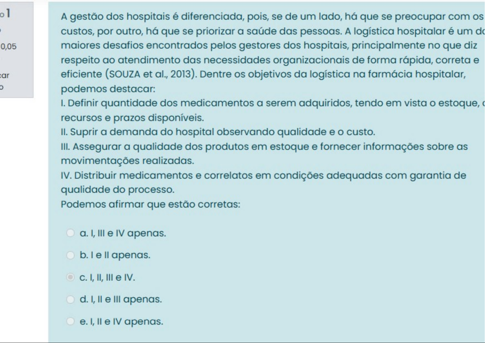 1 A gestão dos hospitais é diferenciada, pois, se de um lado, há que se preocupar com os custos, por outro, há que se priorizar a saúde das pessoas. A logística hospitalar é um do maiores desafios encontrados pelos gestores dos hospitais, principalmente no que diz respeito ao atendimento das necessidades organizacionais de forma rápida, correta e eficiente (SOUZA et al., 2013). Dentre os objetivos da logística na farmácia hospitalar, podemos destacar: Definir quantidade dos medicamentos a serem adquiridos, tendo em vista estoque, recursos e prazos disponíveis. II. Suprir a demanda do hospital observando qualidade e o custo. III. Assegurar a qualidade dos produtos em estoque e fornecer informações sobre as movimentações realizadas. IV. Distribuir medicamentos e correlatos em condições adequadas com garantia de qualidade do processo. Podemos afirmar que estão corretas: a.l, III e IV apenas. b. I e apenas. C. I, II, III e IV. d.l, e III apenas. e.l, e IV apenas.