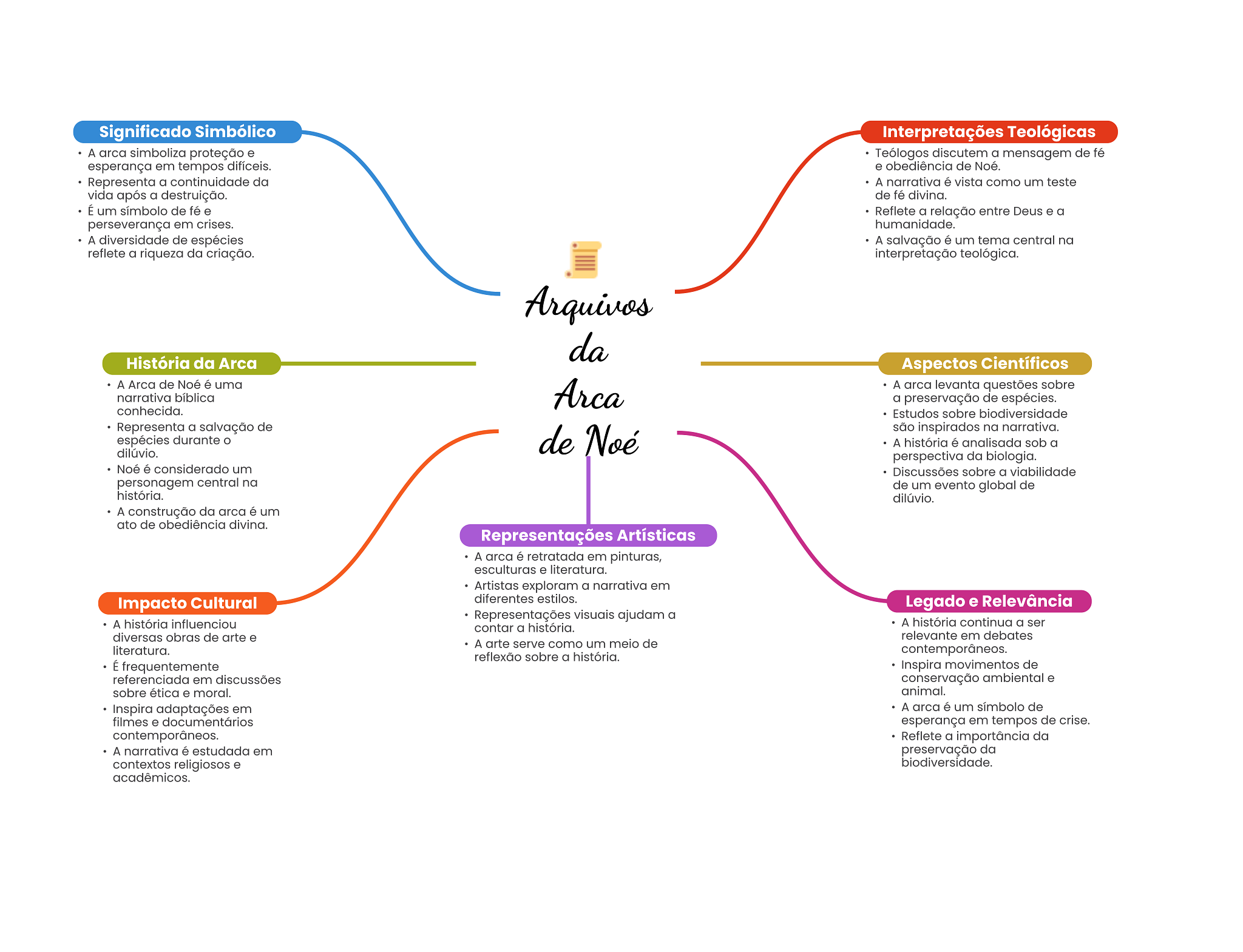 Significado Simbólico Interpretações Teológicas A arca simboliza proteção e Teólogos discutem a mensagem de fé esperança em tempos difíceis. e obediência de Noé. Representa a continuidade da A narrativa é vista como um teste vida após a destruição. de fé divina. É um símbolo de fé e Reflete a relação entre Deus e a perseverança em crises. humanidade. A diversidade de espécies A salvação é um tema central na reflete a riqueza da criação. interpretação teológica. Arquivos da História da Arca Aspectos Científicos A Arca de Noé é uma Arca A arca levanta questões sobre narrativa bíblica a preservação de espécies. conhecida. Estudos sobre biodiversidade Representa a salvação de espécies durante de Noé são inspirados na narrativa. A história é analisada sob a dilúvio. perspectiva da biologia. Noé é considerado um Discussões sobre a viabilidade personagem central na de um evento global de história. dilúvio. A construção da arca é um ato de obediência divina. Representações Artísticas A arca é retratada em pinturas, esculturas e literatura. Artistas exploram a narrativa em Impacto Cultural diferentes estilos. Legado e Relevância Representações visuais ajudam a A história influenciou contar a história. A história continua a ser diversas obras de arte e relevante em debates A arte serve como um meio de literatura. contemporâneos. reflexão sobre a história. É frequentemente Inspira movimentos de referenciada em discussões conservação ambiental e sobre ética e moral. animal. Inspira adaptações em A arca é um símbolo de filmes e documentários esperança em tempos de crise. contemporâneos. Reflete a importância da A narrativa é estudada em preservação da contextos religiosos e biodiversidade. acadêmicos.