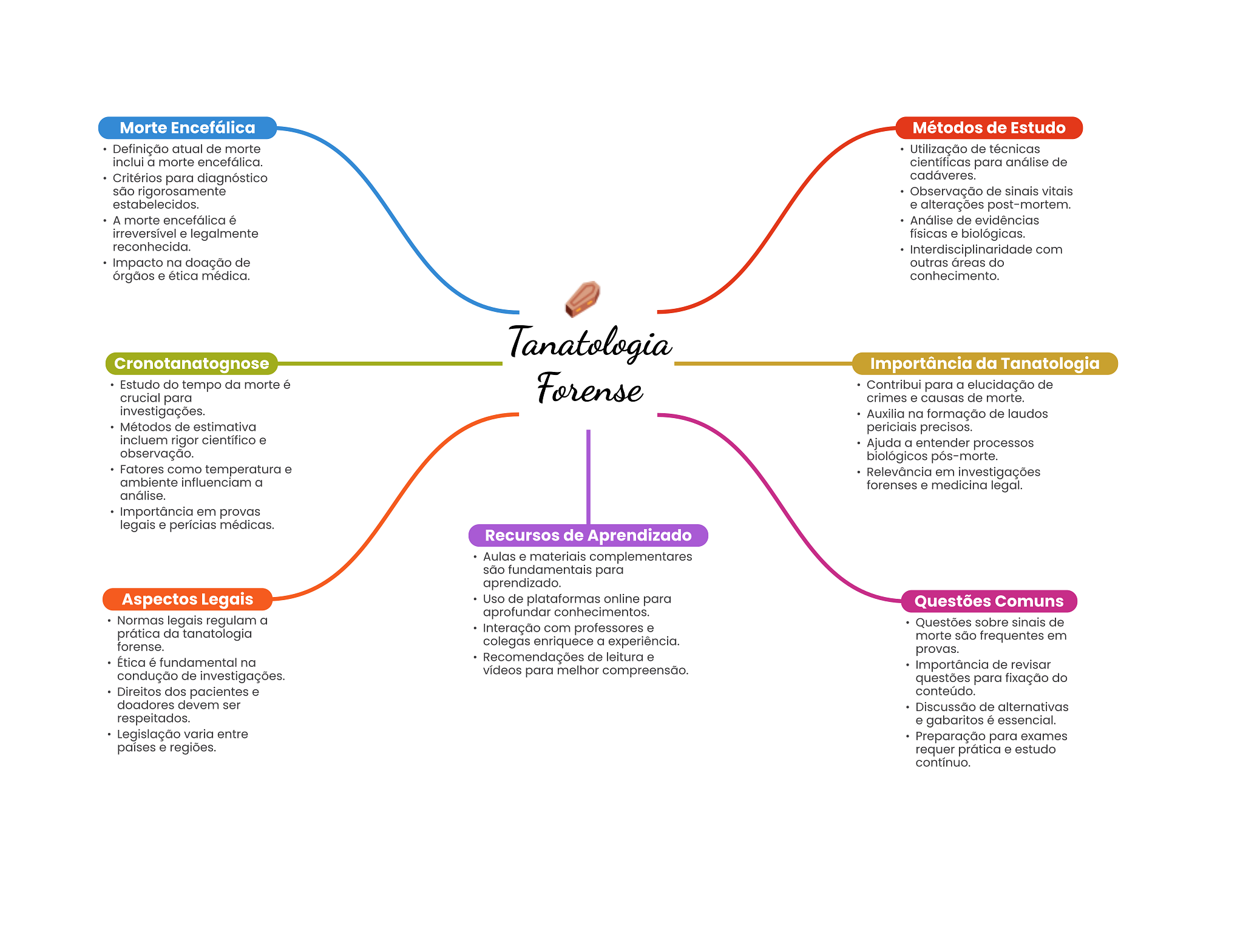 Morte Encefálica Métodos de Estudo Definição atual de morte Utilização de técnicas inclui a morte encefálica. científicas para análise de Critérios para diagnóstico cadáveres. são rigorosamente Observação de vitais estabelecidos. e alterações post-mortem. A morte encefálica é Análise de evidências irreversível e legalmente físicas e biológicas. reconhecida. com Impacto na doação de outras áreas do órgãos e ética médica. conhecimento. Tanatologia Cronotanatognose Importância da Tanatologia Estudo do tempo da morte é crucial para Forense Contribui para a elucidação de crimes e causas de morte. investigações. Auxilia na formação de laudos Métodos de estimativa periciais precisos. incluem rigor científico e Ajuda a entender processos observação. biológicos pós-morte. Fatores como temperatura e Relevância em investigações ambiente influenciam a forenses e medicina legal. análise. Importância em provas legais e perícias médicas. Recursos de Aprendizado Aulas e materiais complementares são fundamentais para aprendizado. Aspectos Legais Uso de plataformas online para Questões Comuns aprofundar conhecimentos. Normas legais regulam a prática da tanatologia Interação com professores e Questões sobre sinais de forense. colegas enriquece a experiência. morte são frequentes em provas. Ética é fundamental na Recomendações de leitura e vídeos para melhor compreensão. Importância de revisar condução de investigações. questões para fixação do Direitos dos pacientes e conteúdo. doadores devem ser Discussão de alternativas respeitados. e gabaritos é essencial. Legislação varia entre Preparação para exames países e regiões. requer prática e estudo contínuo.