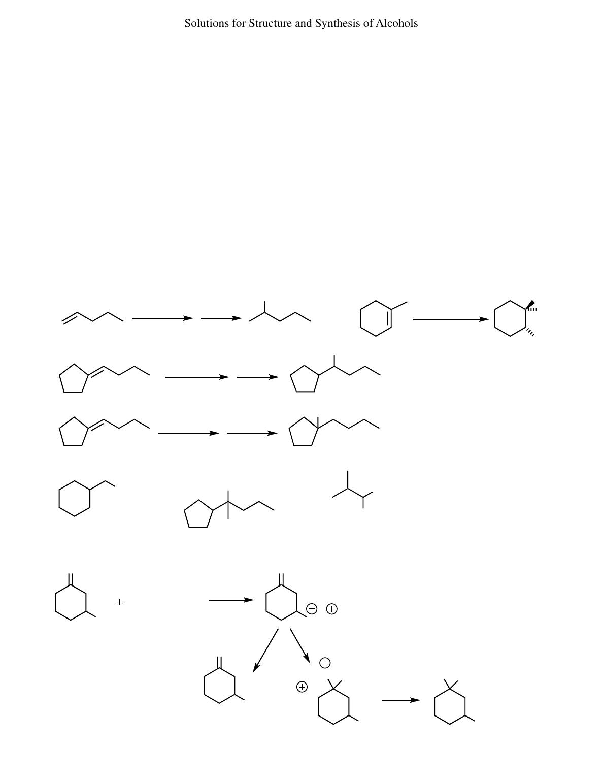 Solutions for Structure and Synthesis of Alcohols 35 Refer to Table 4 to compare acidities of different functional groups. The strength of an acid is determined by the stability of its conjugate base. (a) 3-Chlorophenol is more acidic than cyclopentanol. In general, phenols are many orders of magnitude more acidic than alcohols because phenoxide anions are stabilized by resonance. (b) Cyclohexanethiol is more acidic than cyclohexanol. S is beneath O on the periodic table, and acidity increases down the periodic table. Larger anions are more stable because a negative charge on a larger atom is distributed over a larger volume, with lower electron density and greater delocalization of the negative charge. (c) Cyclohexanecarboxylic acid is more acidic than cyclohexanol. In general, carboxylic acids are many orders of magnitude more acidic than alcohols because carboxylate anions are stabilized by resonance. (d) 2,2-Dichlorobutan-1-ol is more acidic than butan-1-ol because of the two electron-withdrawing substituents near the acidic functional group. 36 (a) Propan-2-ol is the most soluble in water as it has the fewest carbons and the most branching. (b) Cyclohexane-1,2-diol is the most soluble as it has two OH groups for hydrogen bonding. Cyclohexanol has only one OH group; chlorocyclohexane cannot hydrogen bond and is the least soluble. (c) Phenol is the most soluble as it can hydrogen bond better than cyclohexanol. Phenol is a stronger acid and will be ionized to a greater extent than cyclohexanol. Cyclohexanol has low solubility, and 4-methylcyclohexanol has the added hydrophobic methyl group, decreasing its water solubility. H2O Hg(OAc)2 NaBH4 CH3 OH H OH37 (a) (b) 1) BH3 • THF OH OH H2O2 HO– H2O Hg(OAc)2 Ph OH OH NaBH4 (c) (d) (c)(b)(a) 38 Products after aqueous acid workup: BH3 • THF OH OH O (d) This problem confuses a lot of people. When a Grignard reagent is added to a compound that has an OH group, the first thing that happens is that the Grignard reacts by removing the H+ to give O–. + CH4 (only one equivalent of Grignard reagent added) 1 CH3MgI O MgI O If no more Grignard reagent is added before acid hydrolysis, then the starting material is recovered. H3O+ OH O If a second equivalent (or excess) of Grignard reagent is added before hydrolysis, then it will add at the ketone. Acid hydrolysis will give the diol. CH3MgI O– +MgI IMg O CH3 H3O+ OH HO CH3 ether 2) H2O2, HO– 234