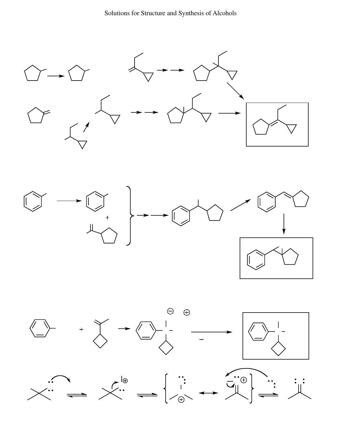 Solutions for Structure and Synthesis of Alcohols 44 (a) The goal is to synthesize the target compound (boxed) from starting materials of six carbons or fewer. The product has 11 carbons, so the logical "disconnection" in working backwards is one six-carbon fragment and the cyclopentane ring that could be joined in a Grignard reaction. The tetrasubstituted C=C will come from dehydration of a tertiary alcohol produced in two possible Grignard reactions. target Br Mg MgBr H O H3O+ OH H2SO4 O MCPBA (b) The goal is to synthesize the target compound (boxed) from starting materials of six carbons or fewer. The product has 12 carbons, so the logical "disconnection" in working backwards is two six-carbon fragments which could be joined in a Grignard reaction. The best way to make epoxides is from the double bond, and double bonds are made from alcohols which are the products of Grignard reactions. ether ∆ target Route 1: MgBr + O H3O+ HO H2SO4 ∆Route 2: O + BrMg H3O+ OH H2SO4 ∆ (c) The goal is to synthesize the target compound (boxed) from starting materials of six carbons or fewer. The product has 14 carbons, so the logical "disconnection" in working backwards is two six-carbon fragments and the ethyl group put on with a Williamson ether synthesis at the end. C CH3 OCH2CH3 target MgBr Br Mg Br Mg from (b) O C CH3 O MgBr Br CH2CH3no water! O H2OOH C HOOHHO H HO OH 45 All steps are reversible. − H2O ether ether H3O+ + H3O+ 239