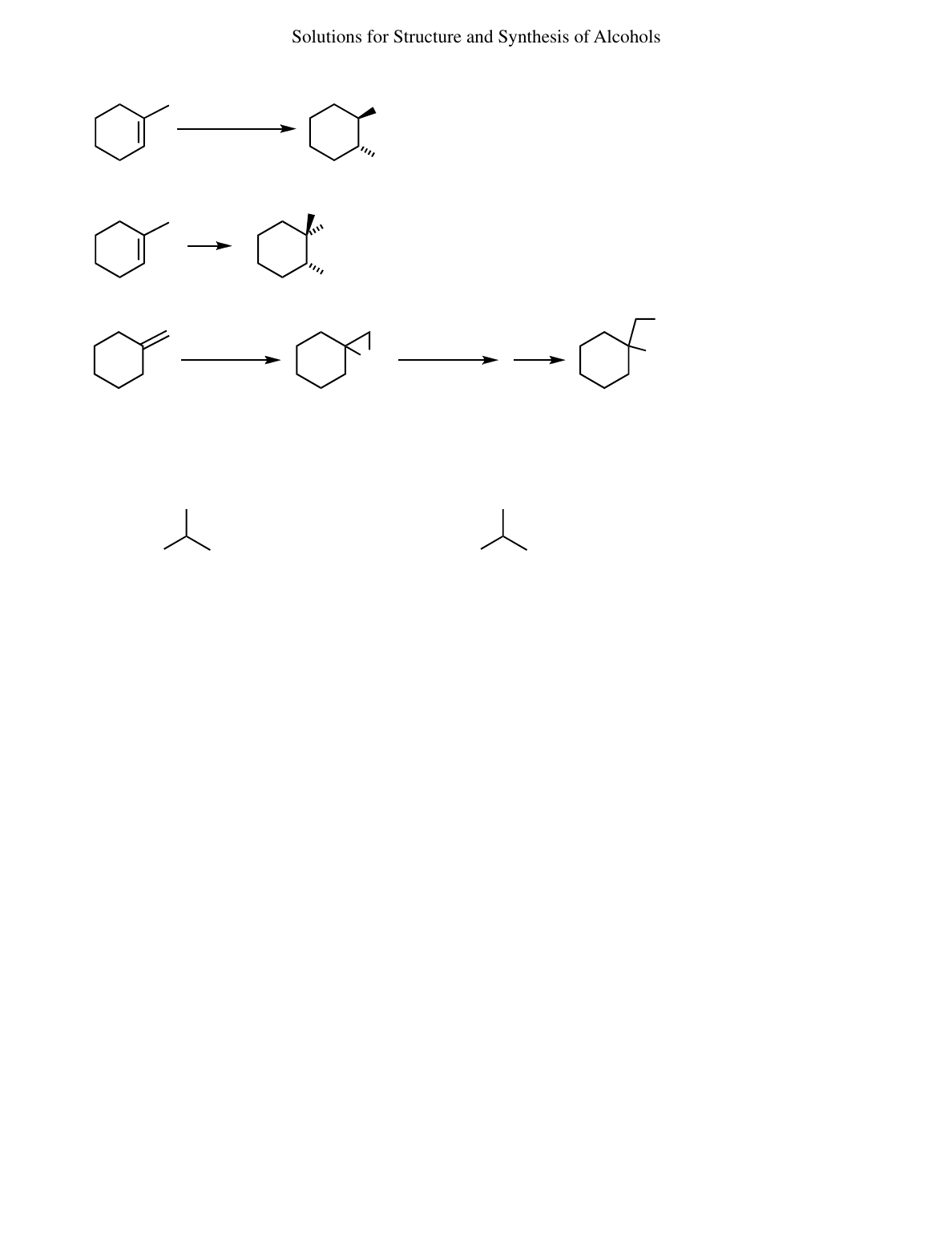 Solutions for Structure and Synthesis of Alcohols 52 continued—See the note at the bottom of the previous page regarding (d) and (e). OH Ph (d) CH3 2) H2O2 , HO− 1) BH3 • THF OH syn addition of H and OH with anti-Markovnikov orientation (e) H2O Cl2 Cl chlorohydrin formation with anti addition of Cl and OH CH3 OH MCPBA(f) O PhMgBr ether New C—C bond requires Grignard; OH is not on same carbon where new C—C is formed suggesting the epoxide intermediate. H3O+ 53 OH CH3H3C mol. wt. 60 g/mole boiling point 82 °C dipole moment 1.66 D pKa 16.5 OH CF3F3C mol. wt. 168 g/mole boiling point 58 °C dipole moment 0.32 D pKa 9.3 (a) Boiling point is a rough indicator of the strength of intermolecular forces, of which three common ones apply to organic compounds: van der Waal's forces (or London forces), the weakest; dipole-dipole interactions for molecules with a permanent dipole moment; and hydrogen-bonding in compounds with OH or NH bonds, the strongest. Both I and II have the alcohol functional group and are likely to form hydrogen bonds with their neighbors, although an argument could be made that the slightly larger F substituents with the greater electron clouds would make hydrogen bonding more difficult in II. Rather than stretch a possibility, let's focus on something obvious: there is a huge difference in the dipole moments of these two compounds. Even though the molecular weight of II is much greater, thereby increasing van der Waal's forces, the dipole moment of II is very small. We must conclude that the significantly decreased dipole- dipole interaction of II is more important in boiling point than the increased van der Waal's interaction, a weaker force. I II (b) I has a large dipole moment because of the bond polarizations due to the electronegative oxygen. In II, however, the bond polarization in the alcohol is counteracted by six F atoms; recall that F is the most electronegative element in the periodic table. The oxygen pulling in one direction is balanced against the six F atoms pulling partially away from the oxygen. (If you have studied vectors in physics, consider each polarized C—F bond as a vector with a "down" component and a "left" or "right" component; you will see that some portion of the left CF3 group cancels the same portion of the right CF3, leaving only a portion of the C—F polarization to cancel the C—O polarization. Make a model!) (c) The strength of an acid is determined by the stability of its conjugate base. The anion of I has no particular stabilization. The anion of II, however, has six F atoms pulling electron density by the inductive effect; that is, the negative charge on the oxygen is partially shared by the six electronegative F atoms pulling electron density through sigma bonds. The anion of II is much more stable than the anion of I, making II the stronger acid. plus the enantiomer plus the enantiomer 243