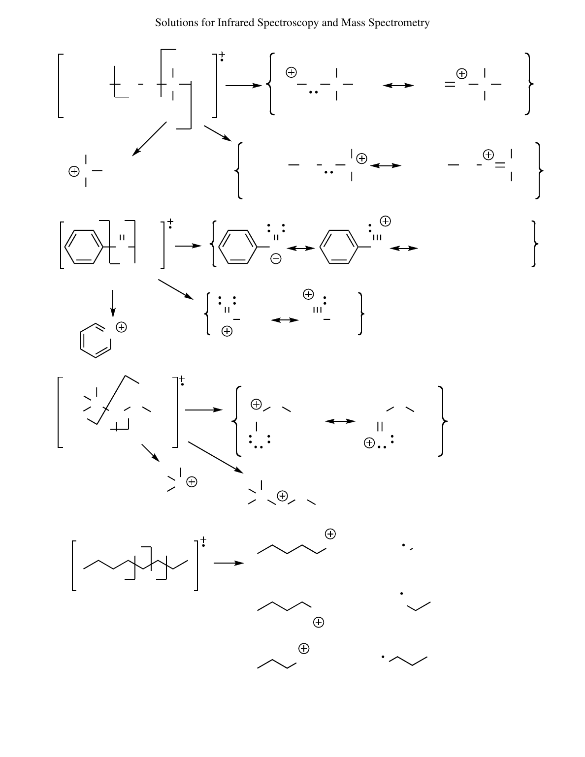 Solutions for Infrared Spectroscopy and Mass Spectrometry (f) 17 continued CH3CH2 H2 C H N C CH3 CH3 CH3 57 m/z 115 86 H2C H N C CH3 CH3 CH3 H2C N H C CH3 CH3 CH3 C CH3 CH3 CH3 m/z 57 m/z 86 (g) C O CH3 m/z 120 77 43 105 C O C O plus other resonance forms with (+) on ring C m/z 77 C O CH3 C O CH3 m/z 105 m/z 43 These are three alpha-cleavages. (h) H3C C H C H2 C CH3 Br CH3 H m/z 164, 166 8543 121,123 C CH3 H3C m/z 43 H HC H2 C CH3 Br HC H2 C CH3 Br H3C C C H H2 C CH3 CH3 H m/z 121, 123 m/z 85 Any fragment containing Br will reflect the two isotopes of Br with approximately 50:50 natural abundance. CH2 H2C CH3 CH2 H2C CH2 H2C m/z 57 mass 57 mass 43m/z 71 mass 29m/z 85 + + + 85 71 57 m/z 114 (a) 18 100 CH3CH2 H2 C H N C CH3 CH3 CH3CH2 H2 C N H C CH3 CH3m/z 100 281