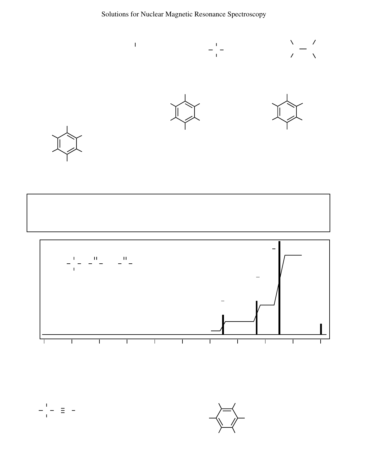 Solutions for Nuclear Magnetic Resonance Spectroscopy 012345678910 δ (ppm) C CH3 CH3 CH2CH3 CH3 H H H H CH3 Br Cl CH3CHCH3CH3CH2CH2Cl CH3 H H H H H C O CH2 C O CH3OC CH3 H3C CH3 3H 2H 9H TMS H H HH CH3O OCH3 CH3 C CH3 OH C C H five types of H three types of H two types of H three types of H c c b b bb a a a a a e d c b a (f) (c)(b)(a) 3 4 (a) c b a d c b four types of H (b) The three types of aromatic hydrogens appear in a relatively small space around δ 7.2. The signal is complex because all the peaks from the three types of hydrogens overlap. 5 c a b c a b Note: NMR spectra drawn in this Solutions Manual will represent peaks as single lines. These lines may not look like "real" peaks, but this avoids the problem of variation among spectrometers and printers. Individual spectra may look different from the ones presented here, but all of the important information will be contained in these representational spectra. c 6 The three spectra are iden tified with their structures. Data are given as chemical shift values, with the integration ratios of each peak given in parentheses. Spectrum (a) bb a a aa a = δ 6.8 (2) (4H) b = δ 3.7 (3) (6H) a b c a = δ 2.4 (1) (1H) b = δ 2.6 (1) (1H) c = δ 1.5 (6) (6H) Spectrum (b) c c two types of H b a (d) HC CH CH3 CH3H3C H3C a a a b Br CH3 H HH H(e) a a b b c three types of H 290