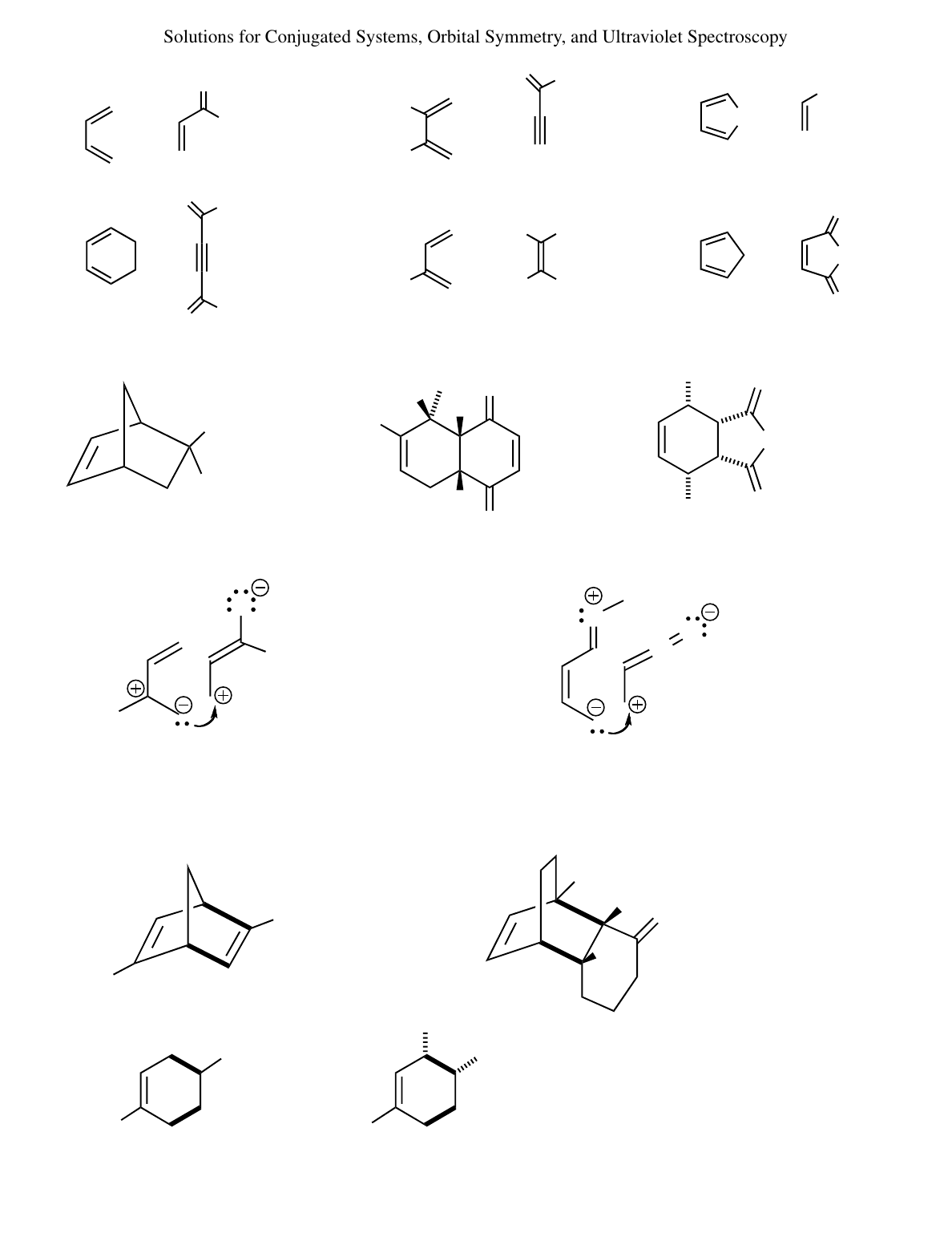 Solutions for Conjugated Systems, Orbital Symmetry, and Ultraviolet Spectroscopy CH3O CH3O O CH3 O OEt O OMe O OMe CH3O NC NC CN CN H CN O Ph Ph CN O O O ++ (b)(a) 15 + (c) + (d) ++ (f)(e) (a) (b) (c) 16 Chiral products from achiral reactants produce racemic mixtures. O O H3CO H H H CH3 O O O all cis CH3 O CH3 C N O CH3 CH3O CHO COOCH3 CH3O H H CH3 CH3 CN (b)(a) 17 These structures show the alignment of diene and dienophile in the Diels-Alder transition state, leading to 1,4-orientation in (a) and 1,2-orientation in (b). 18 For clarity, the sigma bonds formed in the Diels-Alder reaction are shown in bold. Chiral products from achiral reactants produce racemic mixtures. (b)(a) (c) This left structure is a VERY minor resonance contributor; however, it explains the orientation for the diene as carbon-1 is more negative and carbon-2, a 3° carbon, is slightly more positive because of methyl group stabilization. (d) OCH3 O 346