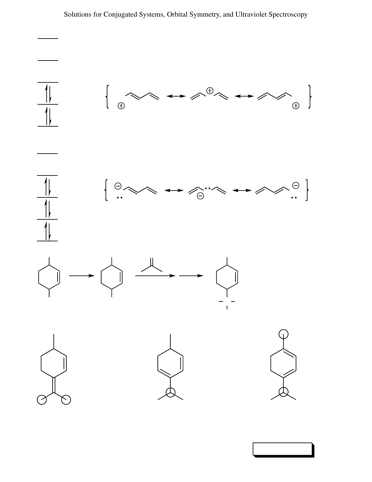 Solutions for Conjugated Systems, Orbital Symmetry, and Ultraviolet Spectroscopy CH3 Br Mg CH3 MgBr H2C H2C O H3O+ C H C H CH3 CH3C OH CH3 A CH2 CH2 36 continued π1 π2 π3 π4∗ π5∗(g) Again, it is π3 that determines the character of this species. When the single electron in π3 of the neutral radical is removed, positive charge appears only in the position(s) which that electron occupied. That is, the positive charge depends on the now empty π3, with empty lobes (positive charge) on carbons 1, 3, and 5, consistent with the resonance description. Again, it is π3 that determines the character of this species. The negative charge depends on the filled π3, with lobes (negative charge) on carbons 1, 3, and 5, consistent with the resonance description. (h) π5∗ π4∗ π3 π2 π1 37 (a) ether (b) Use text Section 13D to predict λmax values. Alkyl substituents are circled. desired product—not consistent with UV data cisoid cyclic diene = 256 nm 1 extra alkyl group = 5 nm TOTAL = 261 nm transoid cyclic diene with one exocyclic double bond = 232 nm 2 extra alkyl groups = 10 nm TOTAL = 242 nm cisoid cyclic diene = 256 nm 2 extra alkyl groups = 10 nm TOTAL = 266 nm—AHA!— closest to observed value actual product B both trisubstituted C=C disubstituted trisubstituted 356